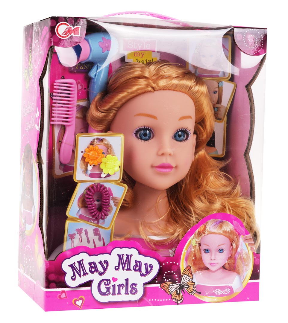 Wymiary | - głowa lalki do stylizacji ok. 20 cm x 17 cm x 11,5 cm, - suszarka ok. 7,5 cm x 3 cm x 8 cm, - grzebyk ok. 8,5 cm x 4 cm, - przypinki do włosów ok. 2,5 cm, - gumka do włosów ok. 3 cm x 2,5 cm. - opakowanie ok. 28 cm x 22,5 cm x 12 cm. |
