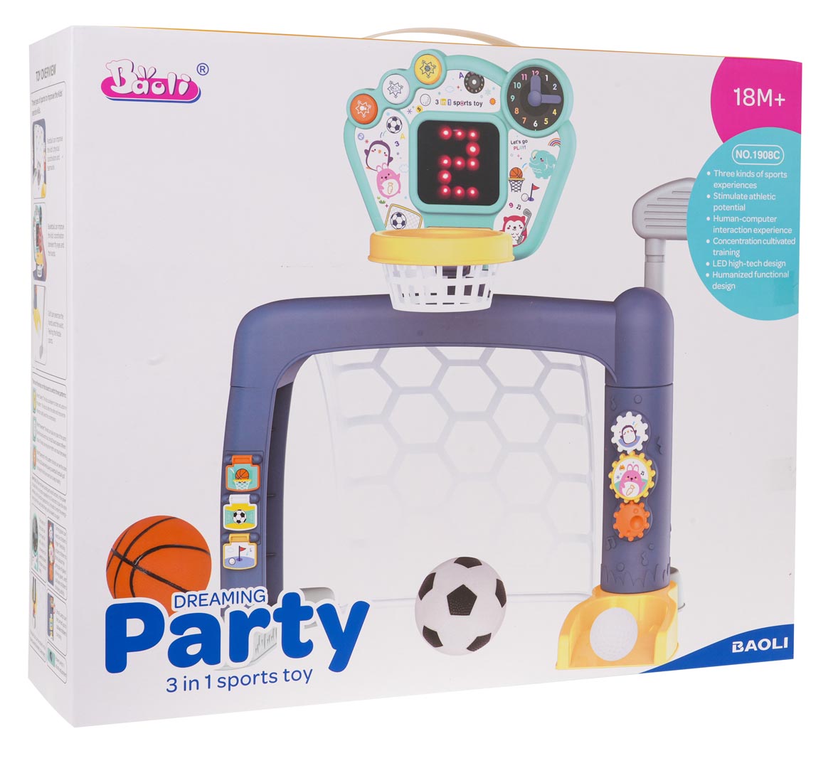 Interaktywny zestaw sportowy 3w1 dla dzieci od 18. miesiąca życia. Zabawka łączy w sobie piłkę nożną, koszykówkę oraz golf, zapewniając maluchowi różnorodne formy aktywnej zabawy.