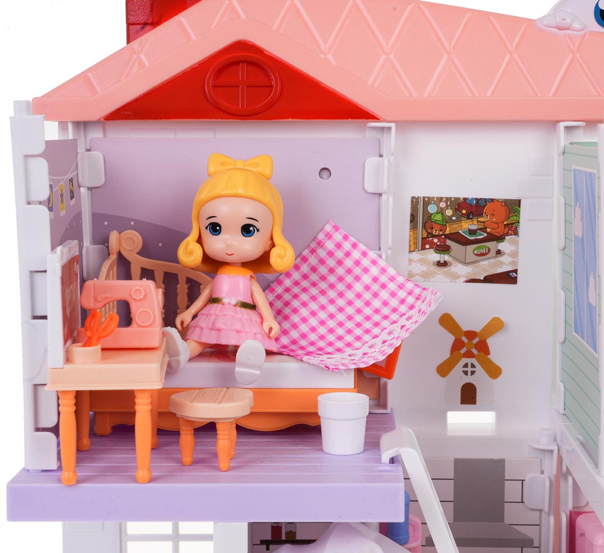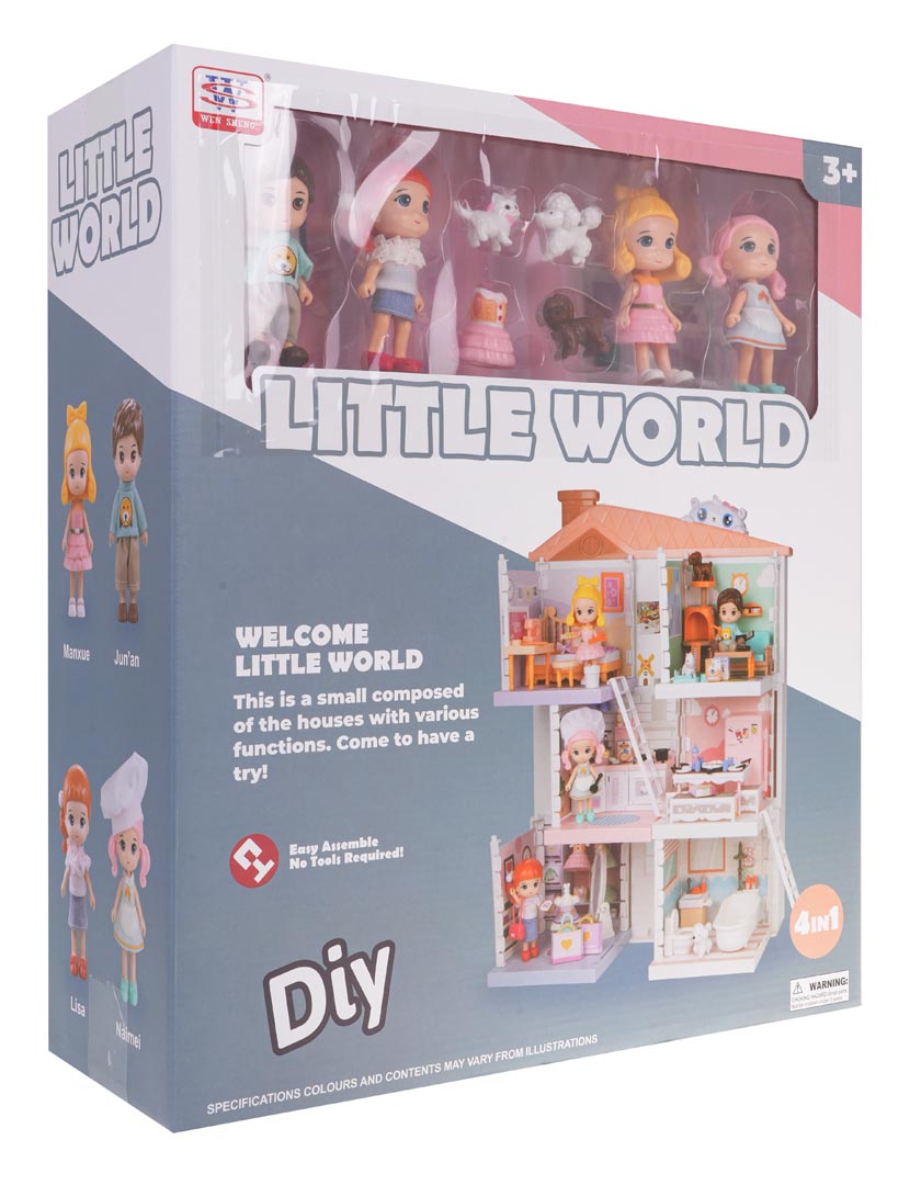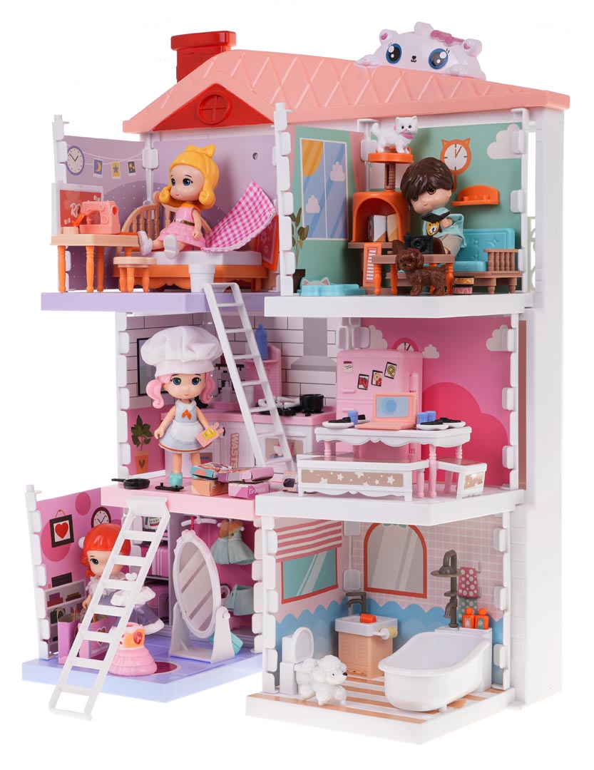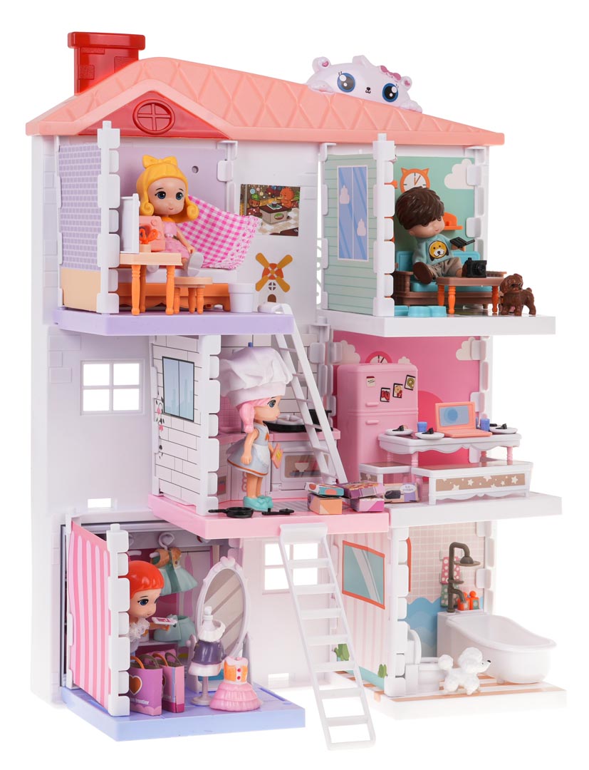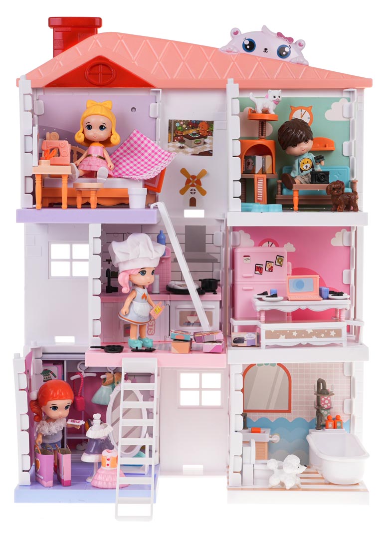 | - domek dla lalek z trzema piętrami, - 4 figurki, - 2 figurki piesków, - figurka kotka, - drapak dla kota, - lęgowisko dla kota, - lodówka z otwieranymi drzwiczkami, - aneks kuchenny z piekarnikiem, szafkami, zlewem, - łóżko, - garderoba, - wanna, - szafka łazienkowa, - toaleta, - lustro, - kanapa, - siedzisko, - stolik, - stół, - 2 x stołeczek, - manekin, - maszyna do szycia, - laptop, - kartoniki z artykułami spożywczymi, - pudełka na ubrania, - 2 torebki, - 3 sukienki, - 2 pary butów, - naklejki dekoracyjne, - instrukcja montażu domku - instrukcja montażu garderoby, - instrukcja montażu kuchni, - instrukcja montażu pokoju dziennego, - instrukcja montażu sypialni i łazienki. |