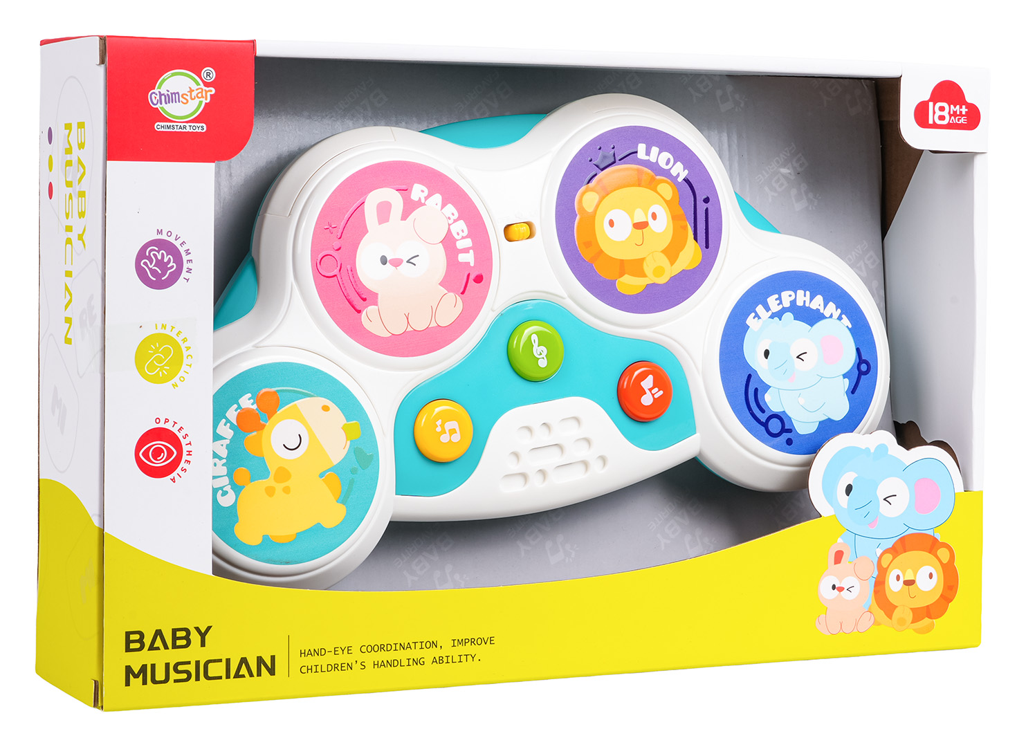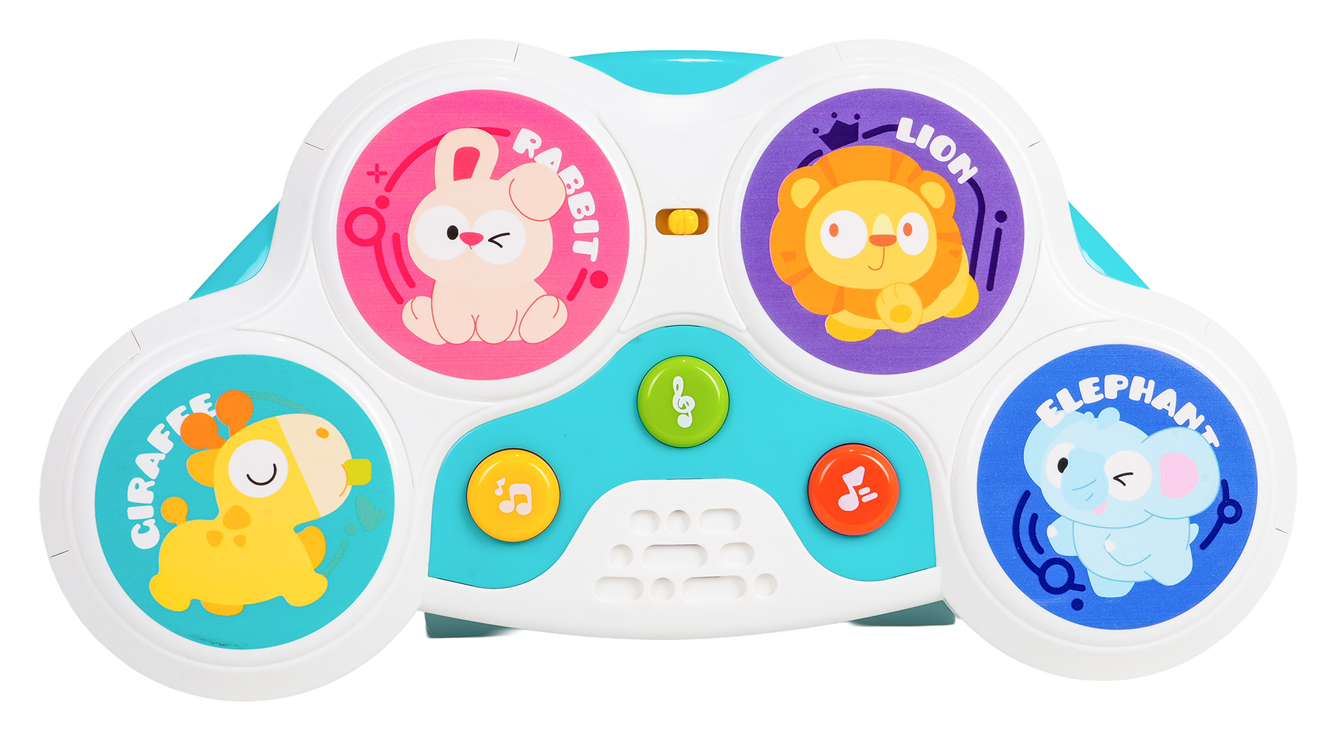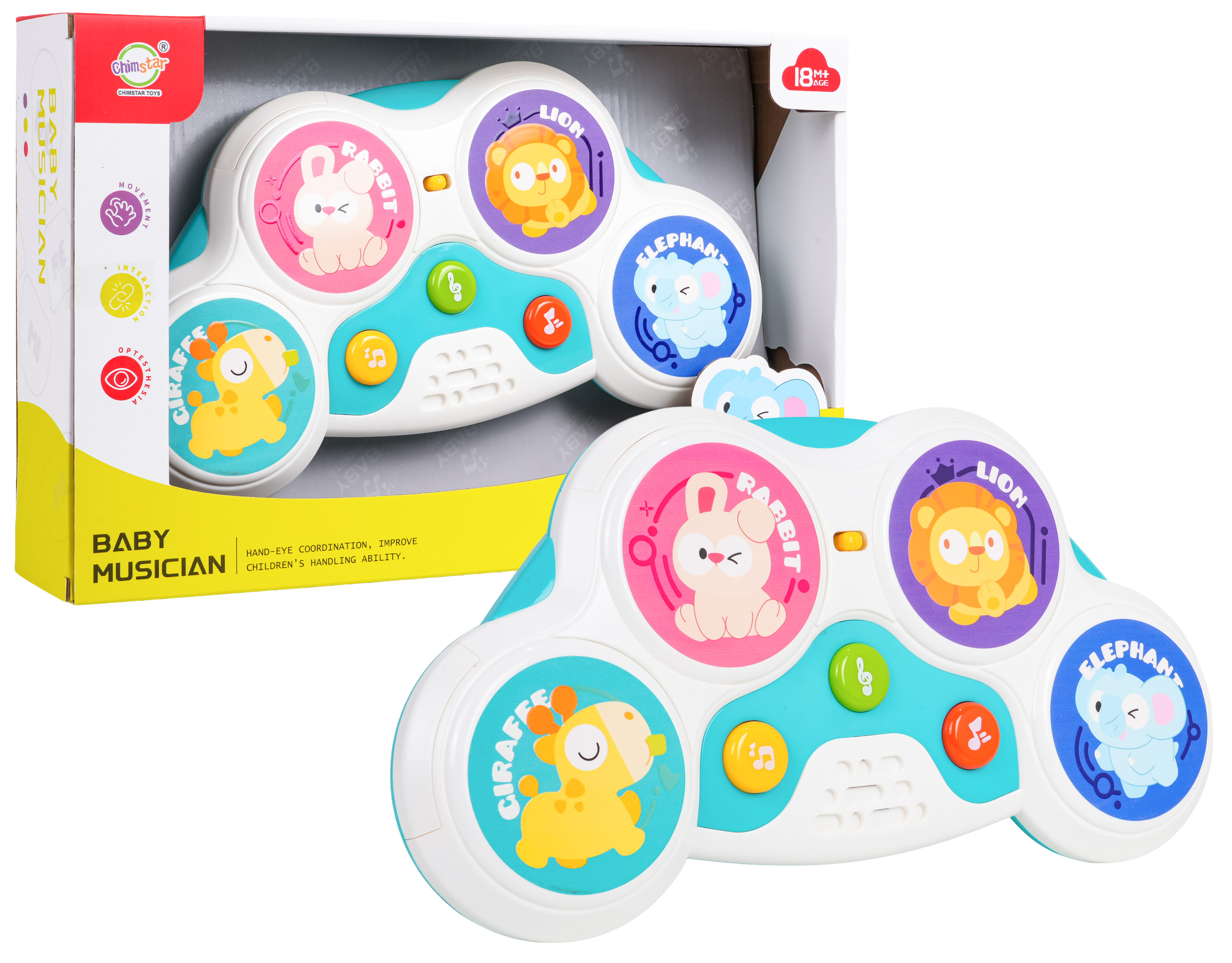 | Interaktywna dotykowa perkusja dla maluszków od osiemnastego miesiąca życia. Zabawka wykonana została z najlepszej jakości materiałów i nie posiada ostrych krawędzi. Efekty dźwiękowe i świetlne oraz bogactwo kolorów stymulują zmysły dziecka na wielu płaszczyznach. Dotykowe bębny posiadają kolorowe obrazki wesołych zwierzątek: żyrafy, królika, lwa oraz słonia. Po naciśnięciu na nie słychać odgłosy zwierzątek, melodie, rytmy bębnów oraz mrugają kolorowe światełka na całej długości boku zabawki. Zabawka zasilana jest bateriami typu 3 x AAA 1,5V (brak w zestawie).