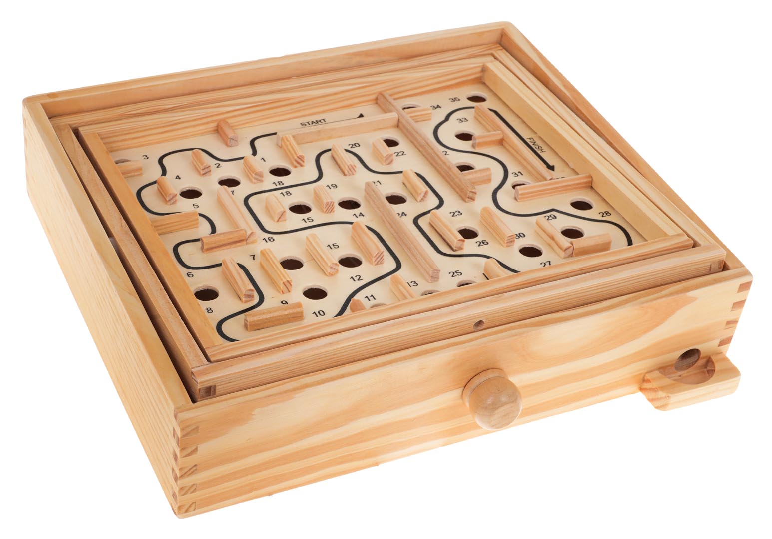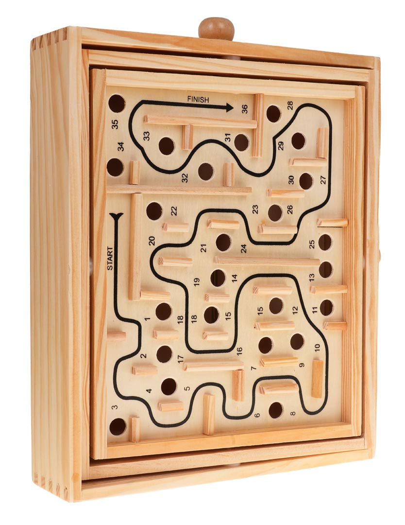 | Drewniana, zręcznościowa gra labirynt, dla dzieci od 3-go roku życia i dorosłych. Celem gry jest poprowadzenie metalowej kuleczki od startu do mety, po wyznaczonej linii. Osiągnąć to możemy, pochylając odpowiednio planszę, za pomocą pokręteł, znajdujących się na bokach gry. Wbrew pozorom, nie jest to łatwe zadanie, a po drodze czeka nas wiele przeszkód w postaci dziurek, do których nasza piłeczka może wpaść, uniemożliwiając nam wykonanie zadania. Funkcje gry: - solidne wykonanie, gwarantujące trwałość, - uczy koncentracji, - poprawia koordynację ręka-oko, - poprawia myślenie strategiczne, - idealna gra na spędzenie czasu z bliskimi. |