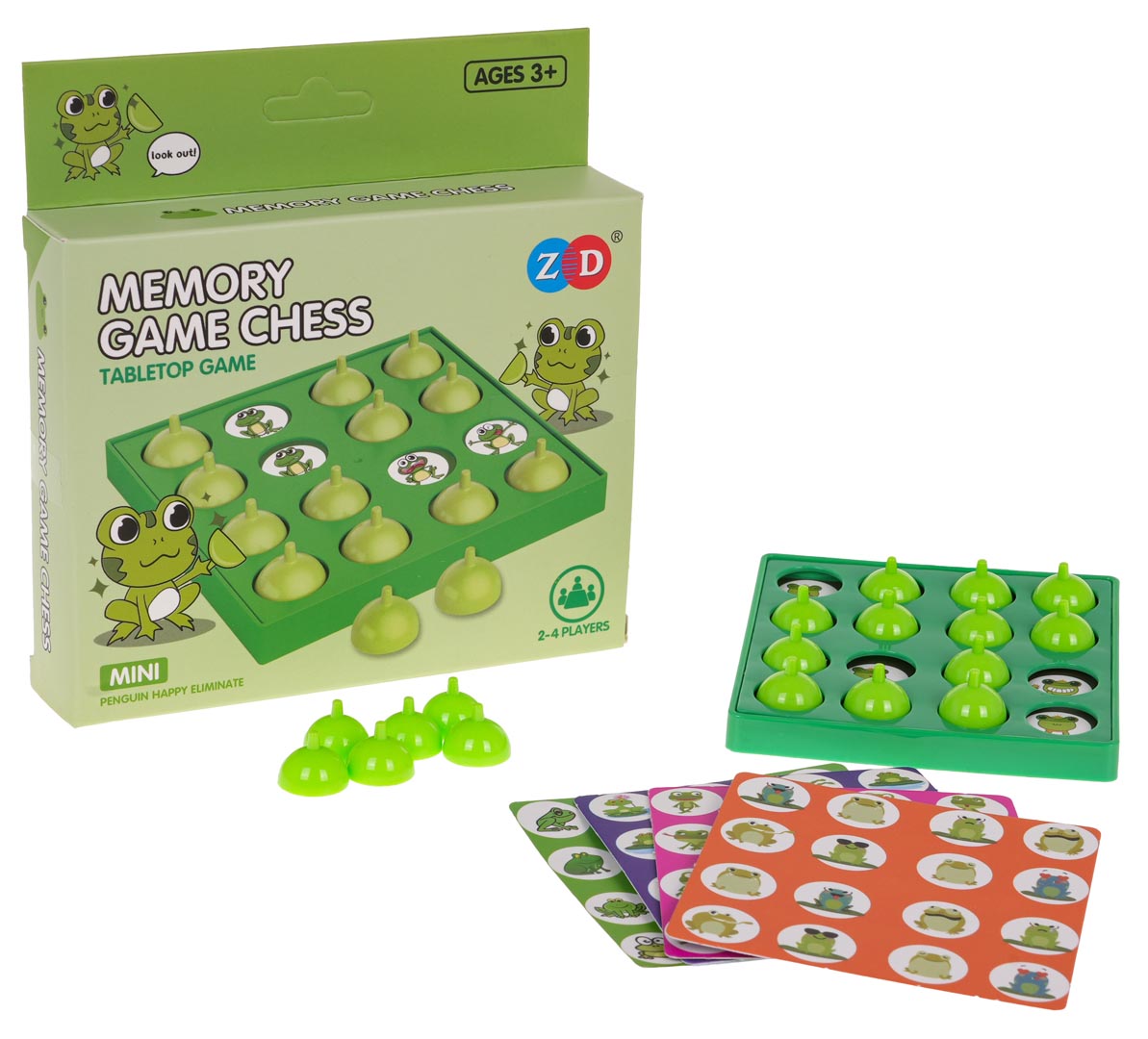 Logiczna gra rodzinna Memory, dla dzieci od 3-go roku życia i dorosłych. Zestaw składa się z dwupoziomowej planszy z otworami w postaci kółek i kart z rysunkami żabek w różnych pozach. Wkładamy kartę z rysunkami, pomiędzy plansze i zasłaniamy otwory pachołkami. Gracze muszą zapamiętać, na którym polu ukryta jest dana żabka. Podnosimy dany pachołek i próbujemy znaleźć identyczny rysunek. Wygrywa zawodnik, który odszuka najwięcej par. Gra uczy cierpliwości, ćwiczy pamięć i koncentrację.