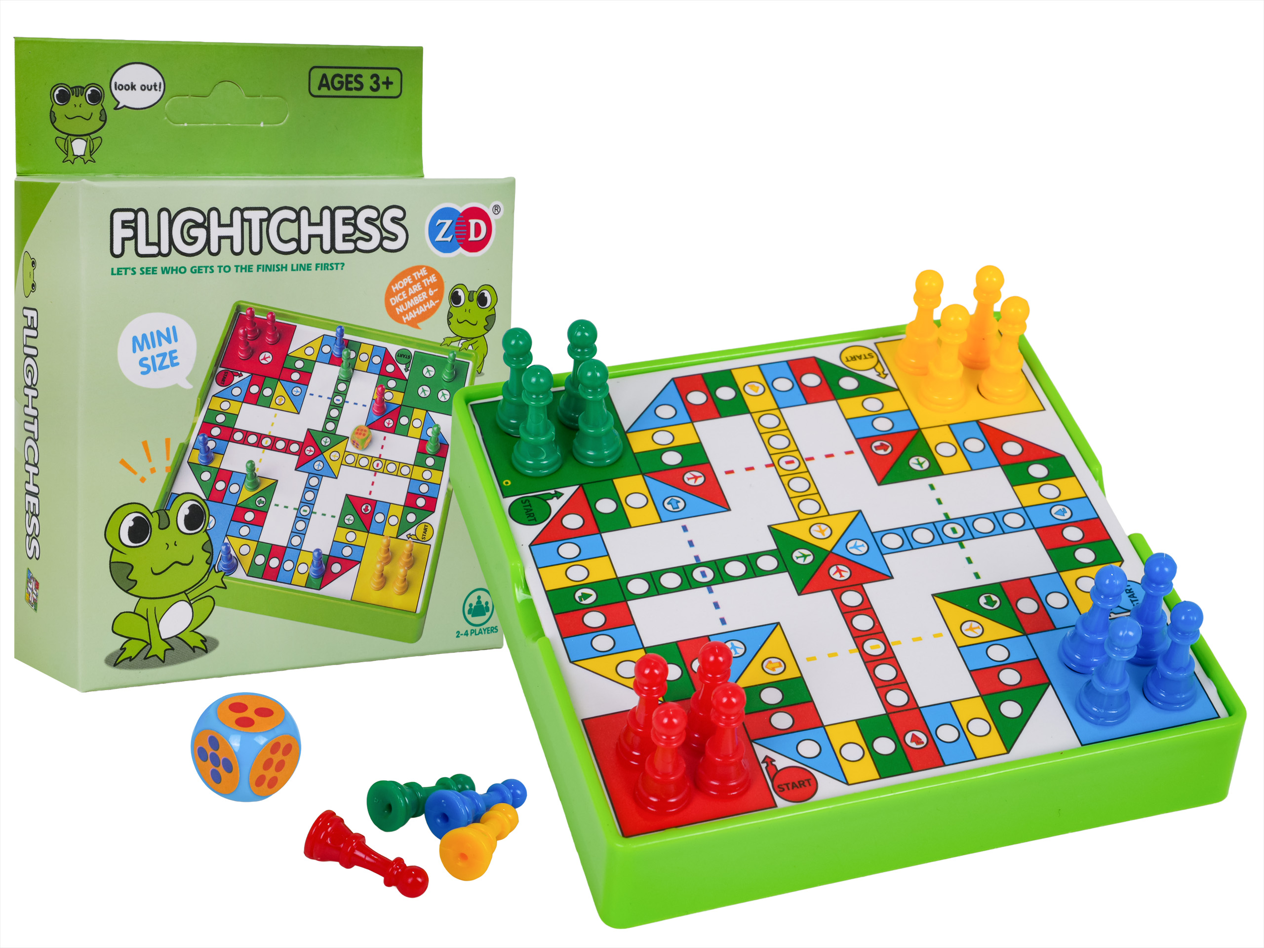 Gra planszowa Ludo mini Żaba dla dzieci od trzeciego roku życia. Gra jest niewielkich rozmiarów, dzięki czemu można ją zabrać wszędzie ze sobą.