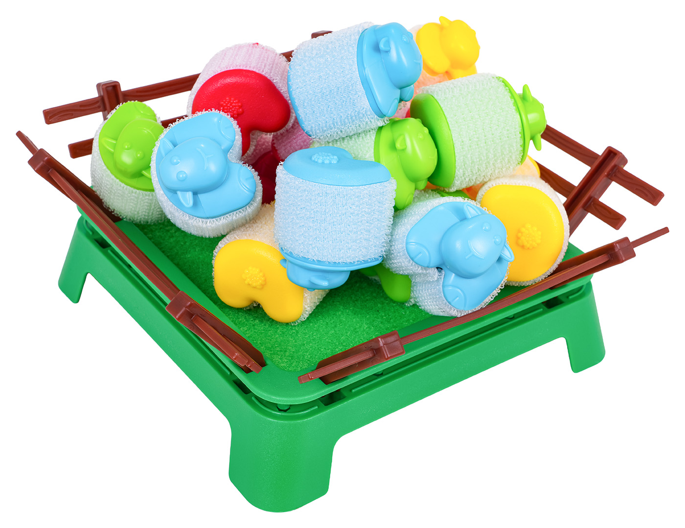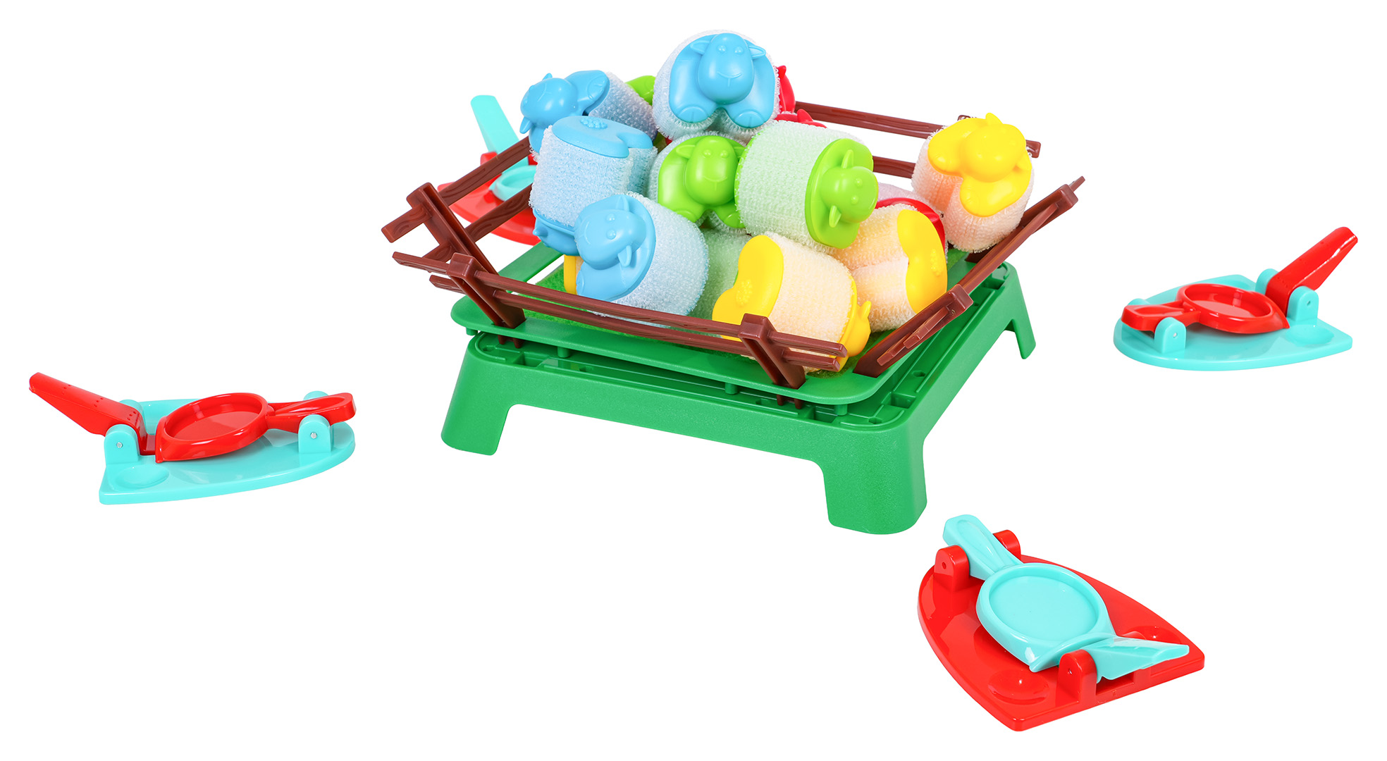 | - 16 kolorowych owieczek, - 4 wyrzutnie, - zagroda dla owiec, - instrukcja w języku angielskim. |