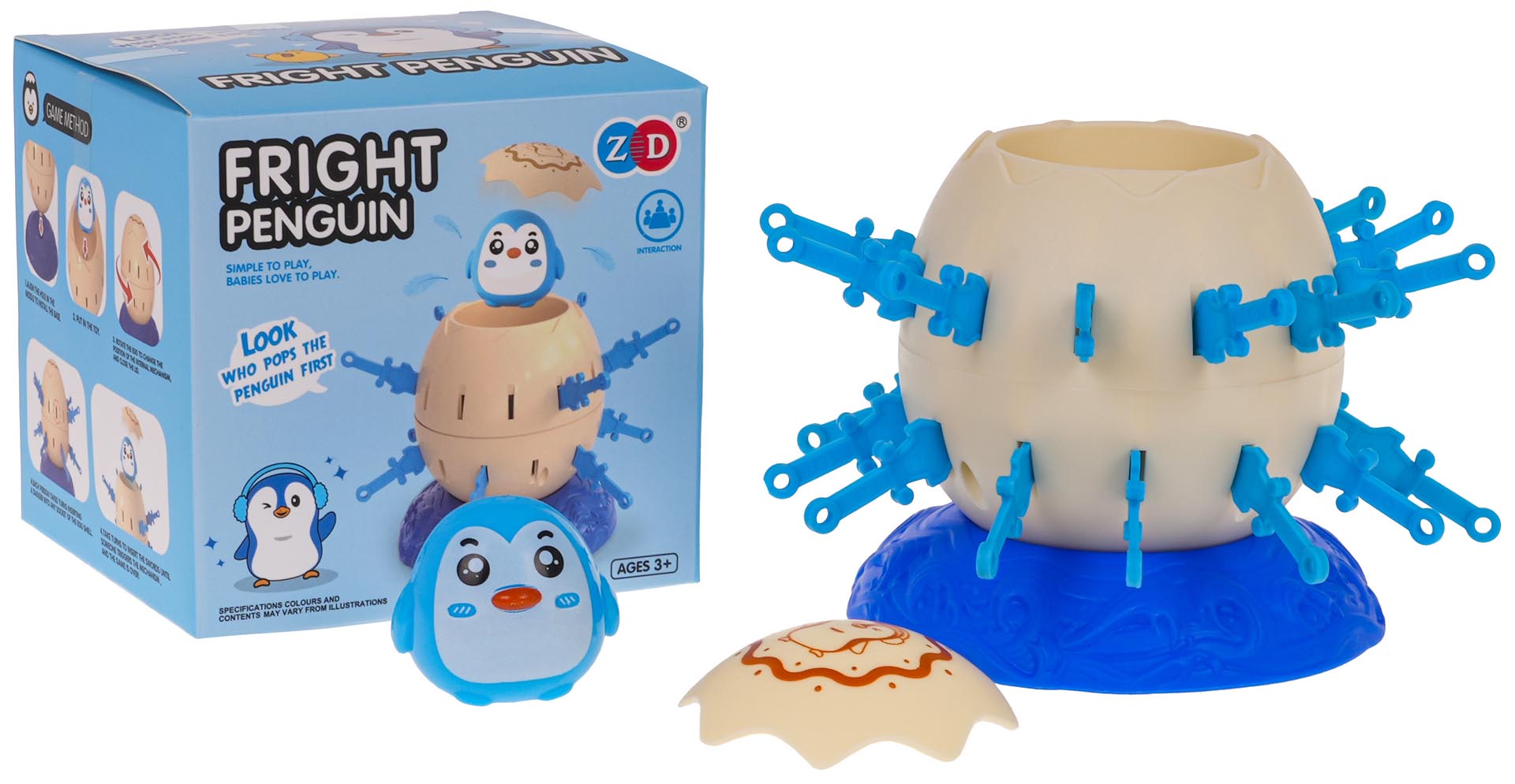 Gra zręcznościowa Skaczący Pingwin dla dzieci od 3-go roku życia. Zabawna gra polega na umiejscowieniu jajka z pingwinem w środku na podstawce i naciśnięciu mechanizmu. Następnie każdy z graczy otrzymuje miecze i wkłada je po kolei w otwory na jajku. Należy uważać, żeby nie ugodzić pingwina znajdującej się w jajku. W przeciwnym razie wyskoczy z jajka niczym z procy. Wygrywa osoba, która jako pierwsza włoży w jajko wszystkie swoje miecze lub więcej niż przeciwnik, zanim pingwin wyskoczy.