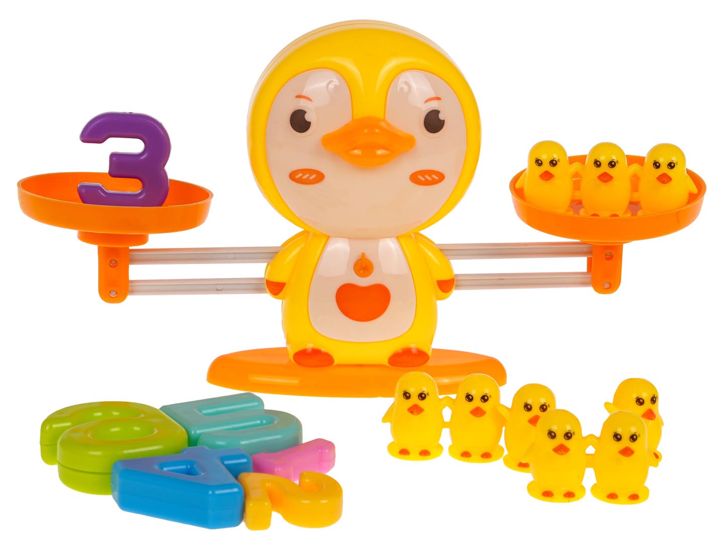 Wymiary | - kaczka z wagą ok. 20 cm x 10 cm x 5,5 cm, - kaczka pojedyncza ok. 2,3 cm x 1,8 cm x 1 cm, podwójna ok. 3,3 cm x 2,4 cm x 1 cm, potrójna ok. 5,5 cm x 2,3 cm x 1 cm, - cyferki ok. 1-2,6 cm, 2-2,5 cm, 3-3 cm, 4-3,2 cm, 5-3,6 cm, 6-4 cm, - karta z zadaniami matematycznymi ok. 14 cm x 10 cm, - opakowanie ok. 15,8 cm x 18,5 cm x 5,5 cm. |