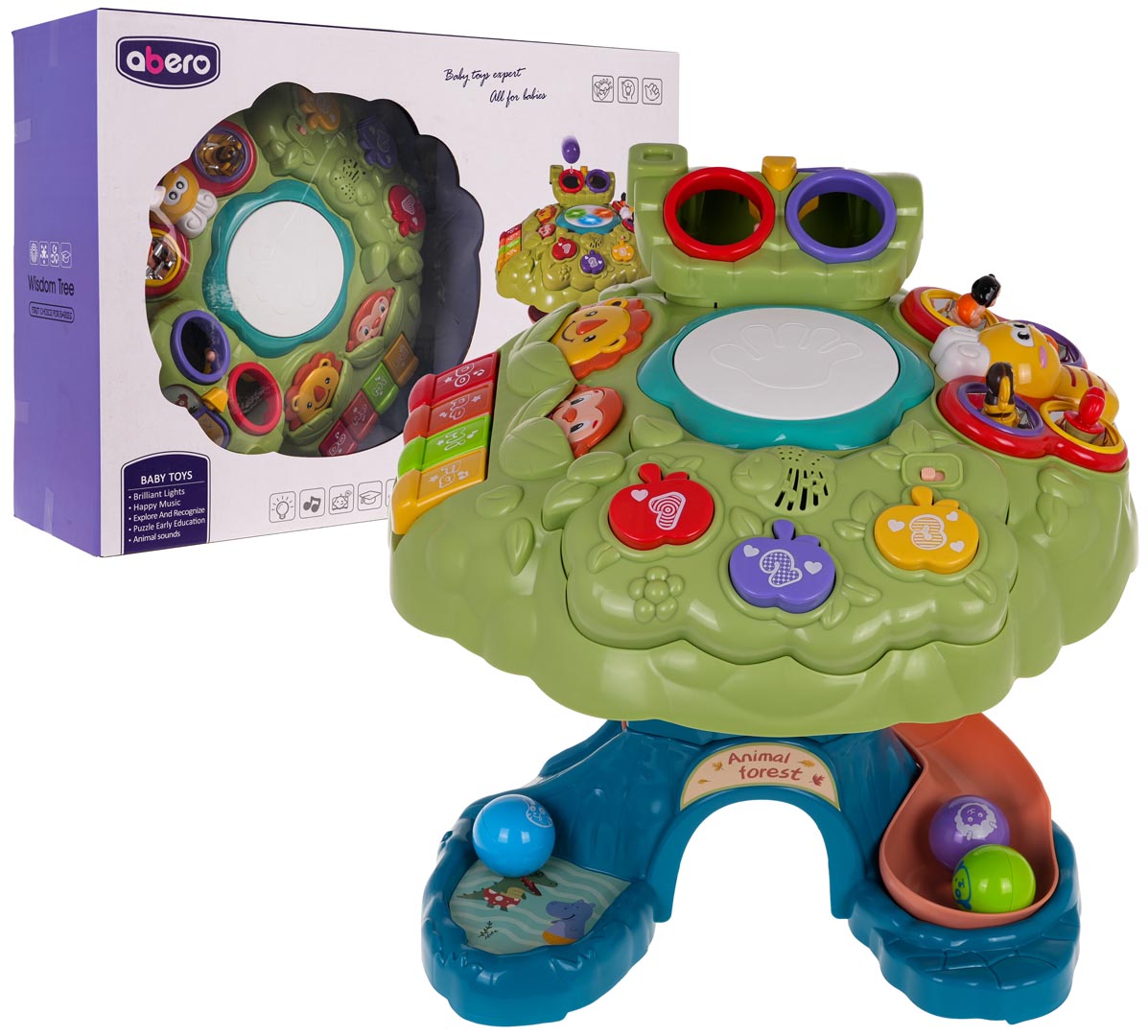 | Multifunkcyjne, interaktywne drzewo z funkcją światła i dźwięku dla dzieci od 18-go miesiąca życia. Zabawka wykonana została z najlepszej jakości plastiku, w żywych kolorach przyciągających wzrok maluszka i zachęcających do zabawy. Interaktywne drzewo składa się z pnia i korony, na której znajduje się mnóstwo różnych, ciekawych propozycji interaktywnych. Pośrodku korony drzewa znajduje się świecący, muzyczny bębenek. Po naciśnięciu przez dziecko wydaje wesołe odgłosy. Po bokach bębenka mamy pianinko, sad z jabłuszkami, wesołego motylka oraz otwory na piłeczki i książeczkę do przekładania. W sadzie z jabłuszkami, dziecko nacisnąwszy któreś z jabłuszek, usłyszy wesołe melodie i angielskie cyfry. Jest też regulacja głośności. Wesoły motylek ma na swych skrzydełkach różne figurki do obracania, przesuwania, wciskania i kręcenia. Na pianinku twoja pociecha będzie mogła zagrać „do”, „re”, „mi”, „fa”. Po wrzuceniu piłeczki do odpowiedniego otworu usłyszymy melodię, a piłeczka potoczy się w dół po zjeżdżalni i zatrzyma się na spodzie pnia drzewa. Z tym zestawem nie można się nudzić, jest tak wiele możliwości. Zabawa tym zestawem pomoże dziecku w nauce kolorów, świetnie wpływa na pamięć i koncentrację, ćwiczy małe rączki i nauczy rozwiązywania problemów. Zabawka zasilana jest bateriami typu 3 x AA 1,5 V (baterii brak w zestawie). Bębenek Po naciśnięciu bębenka słychać wesołe melodie i śmiech dziecka. Efektom dźwiękowym towarzyszą efekty świetlne w postaci mrugających różnokolorowych światełek. Pianinko Jednokrotne naciśnięcie każdego z klawiszy uruchomi nutę i wesołą melodię. Po ponownym naciśnięciu usłyszymy nazwę koloru w języku angielskim (czerwony, pomarańczowy, zielony i żółty). Przy naciskaniu klawiszy podświetla się również bębenek na środku drzewka. Lew i małpka Przy przesunięciu lwa do góry, małpka przesuwa się w dół. Przy przesunięciu lwa do dołu małpka podnosi się do góry. Sad z jabłuszkami Podczas naciskania 3 jabłuszek słyszymy nazwy liczb w języku angielskim oraz melodie. Bębenek podświetla się kolorowymi barwami. Kolorowy motyl Kolorowy motylek na skrzydełkach posiada pszczółkę do przesuwania, kółeczko do obracania, serduszko do obracania i pszczółkę do wciskania. Wszystkim tym czynnością towarzyszą odgłosy grzechotania, a w przypadku pszczółki piszczałka. Książeczka do przewracania kartek Przy przewracaniu kartek słychać odgłosy, jakie wydaje sowa i kurka. Bębenek podświetla się kolorowymi światełkami. Wlot na piłeczki Kolorowe piłeczki z rysunkami zwierzątek, po włożeniu w otwór uruchamiają wesołe melodie i podświetlenie bębenka. Zjeżdżalnia dla piłek Piłki po włożeniu we wlot toczą się po zjeżdżalni i zatrzymują na spodzie drzewka. Funkcje zestawu: – odpowiedni dla dzieci od 18-go miesiąca życia, – wykonany z plastiku najlepszej jakości, – żywe kolory zachęcają dziecko do zabawy, – muzyczny bębenek z efektami światła i dźwięku, – pianinko, na którym można grać „do”, „re” „mi”, „fa”, – sad z jabłuszkami z odgłosami melodii i nazwami liczb po angielsku, – kolorowy motyl z figurkami do przekładania, – książeczka do przekładania, – wlot na piłeczki z odgłosami, – zjeżdżalnia dla piłeczek, – regulacja głośności pianinka, – uczy kolorów, kształtów, ćwiczy małe rączki, – zabawka edukacyjno-interaktywna na wysokim poziomie. |