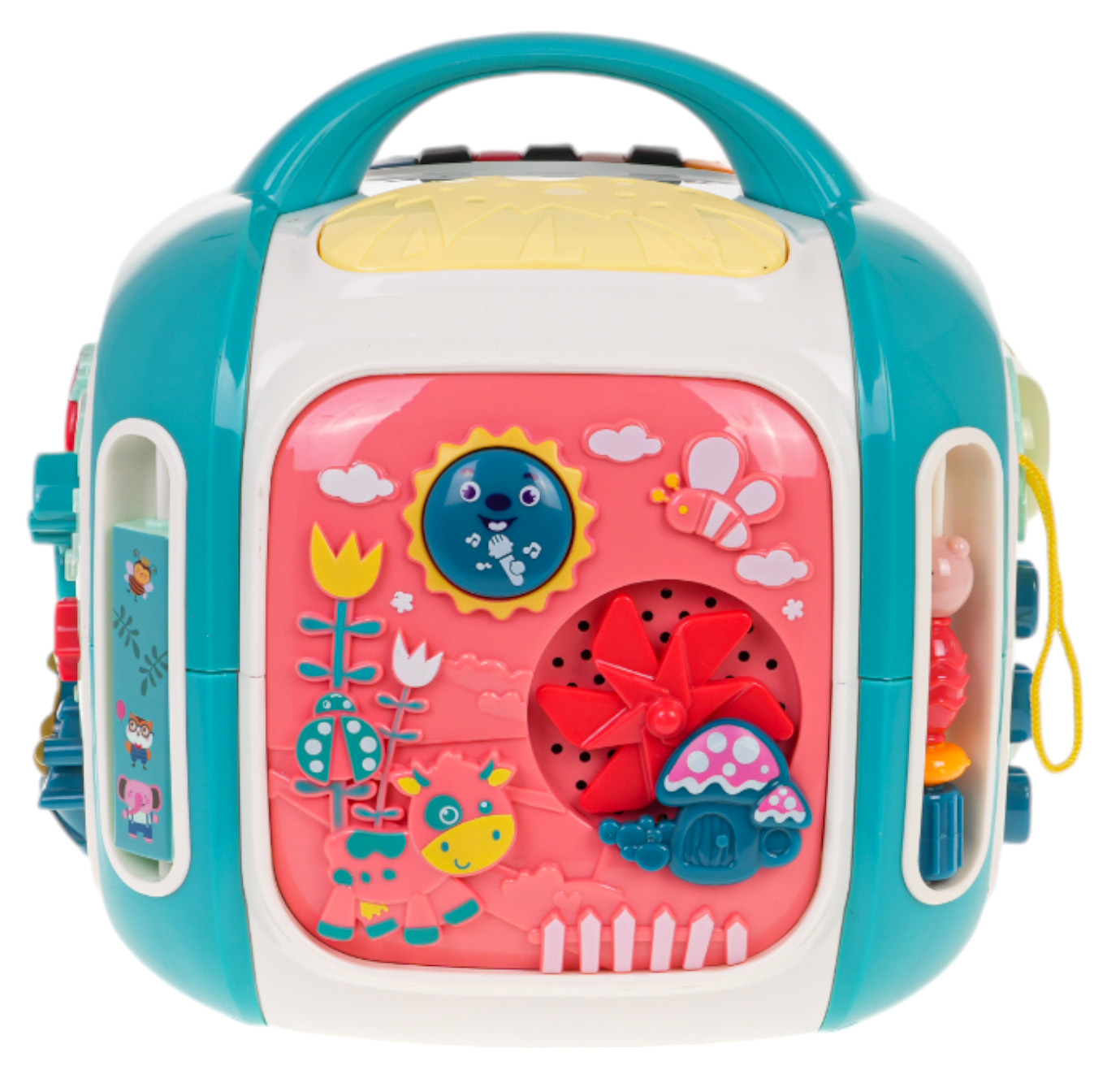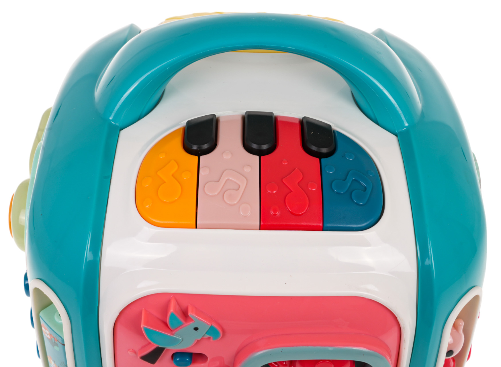 | Interaktywny box z efektami dźwięku i światła dla dzieci od 3-go roku życia. Każda ścianka boxu zapewni dziecku wiele frajdy i interaktywnej zabawy. Różnorodne efekty dźwiękowe i świetlne oraz bogactwo kolorów, przyciągnie wzrok maluszka i zachęci do zabawy. Zabawka zasilana jest bateriami typu 3 x AA 1,5 V (brak w zestawie). Opis ścianek boxu: - ścianka muzyczna z gitarą, saksofonem, bębnem i dwoma gwiazdkami. Naciskając na poszczególne elementy, dziecko usłyszy po 5 podkładów muzycznych z gitarą, saksofonem, bębnem, uspokajających melodii, jest też gwiazdka do zmiany trybów fortepianu znajdującego się na górze boksu. - ścianka z telefonikiem Na tej ściance znajduje się wyjmowany telefonik z grzechotką. Klawisze w kształcie serduszka z rysunkami pojazdów lądowych czy morskich i z rysunkami zwierzątek oraz klawisze numeryczne od 0 do 9. Naciskając np. klawisz z serduszkiem i rysunkiem łodzi, usłyszymy jego nazwę i dźwięk, jaki wydaje ten pojazd. Klawisz z żółtym napisem uruchamia tryb liczb, odgłosy wyboru numerów lub wesołe melodie, a klawisz z niebieskim napisem uruchamia odgłos dzwonka telefonu lub wyjście z trybu rozmowy. - ścianka z traktorkiem Na tej ściance mamy regulację głośności oraz 2 kółka zębate, które kręcą się w przeciwnych kierunkach. - ścianka ze słoneczkiem i wiatrakiem Na tej ściance mamy przycisk ze słoneczkiem, po naciśnięciu na niego odtwarzamy 3 melodie, możemy też kręcić ruchomym wiatraczkiem. - ścianka górna z pianinkiem. Naciskając na poszczególne klawisze, możemy odtwarzać melodie. Klawisze mają dużą czułość, wystarczy delikatny nacisk paluszka. Mamy 3 tryby fortepianu. Tryb skali, tryb odtwarzania losowego (7 utworów), tryb odtwarzania muzyki (7 utworów). Na tej ściance znajduje się również mikser oraz rączka do przenoszenia. - po bokach kostki znajdują się pałąki z obrotowymi elementami do ćwiczenia paluszków dziecka. Funkcje zabawki: - odpowiednia dla dzieci od 3-go roku życia, - wykonana z najlepszej jakości plastiku w żywych kolorach, - zasilana bateriami 3 x AA 1,5 V (brak w zestawie), - efekty dźwiękowe: odgłos miksera, wesołe piosenki, melodie, odgłos nut, odgłosy zwierząt, pojazdów, nazw liczb, odgłos kręcenia kół zębatych, nazwy zwierząt i pojazdów, liczb, - efekty świetlne: podświetlany bębenek, podświetlane klawisze pianinka, - wygodna rączka do przenoszenia, - nauka kolorów, kształtów, nazw przedmiotów, - trening dla malutkich paluszków dziecka. |