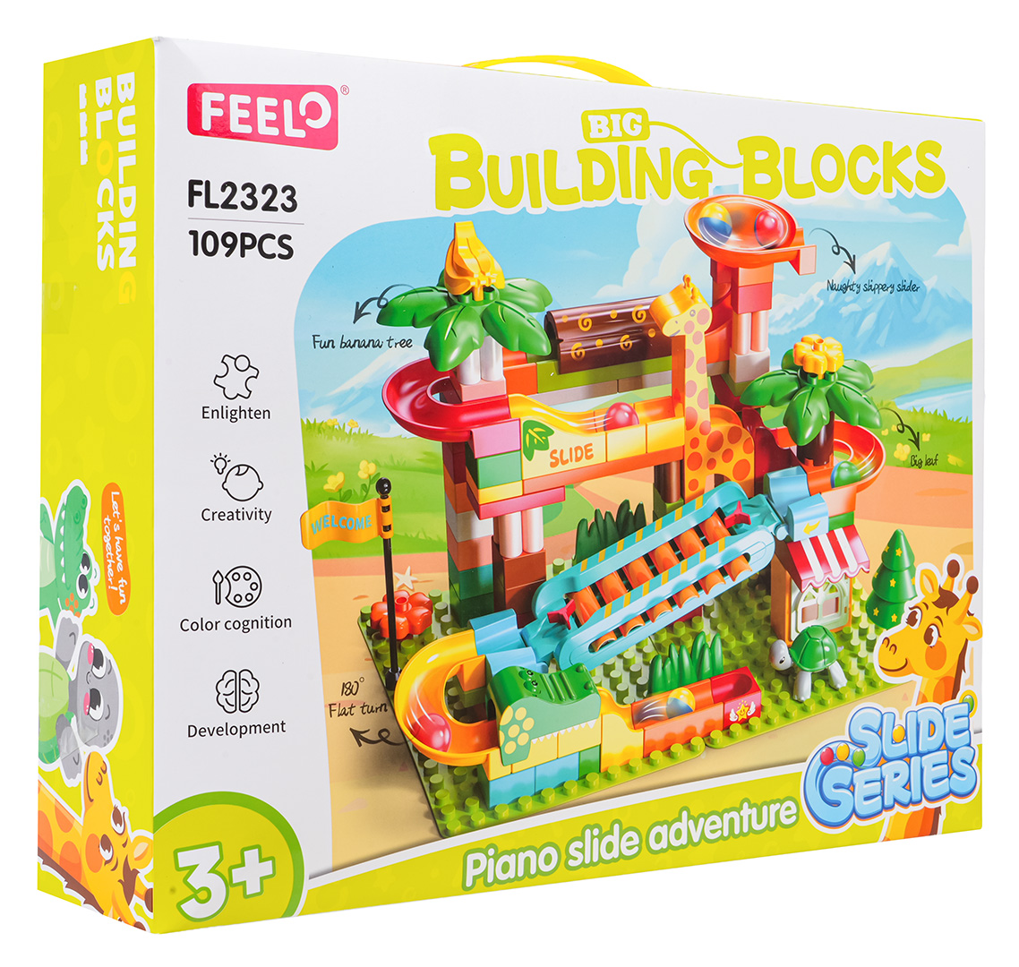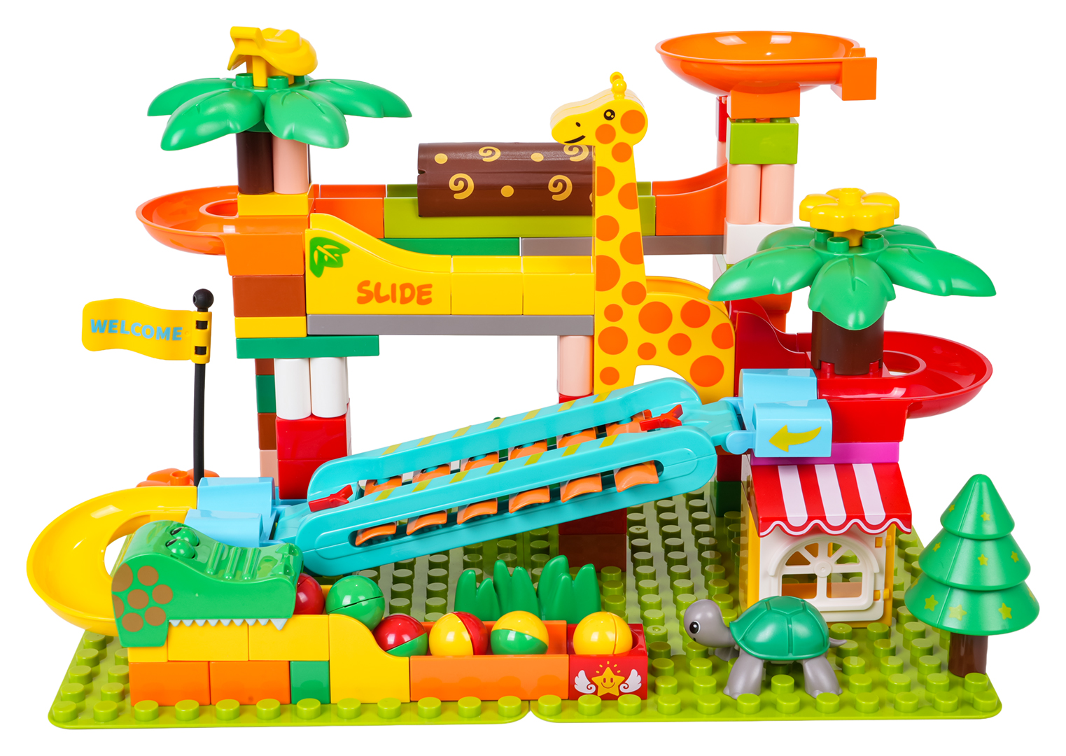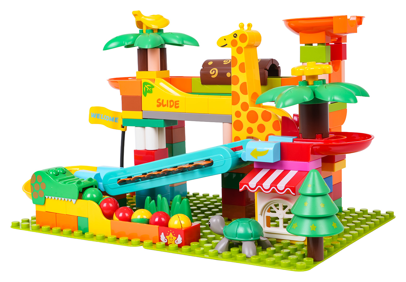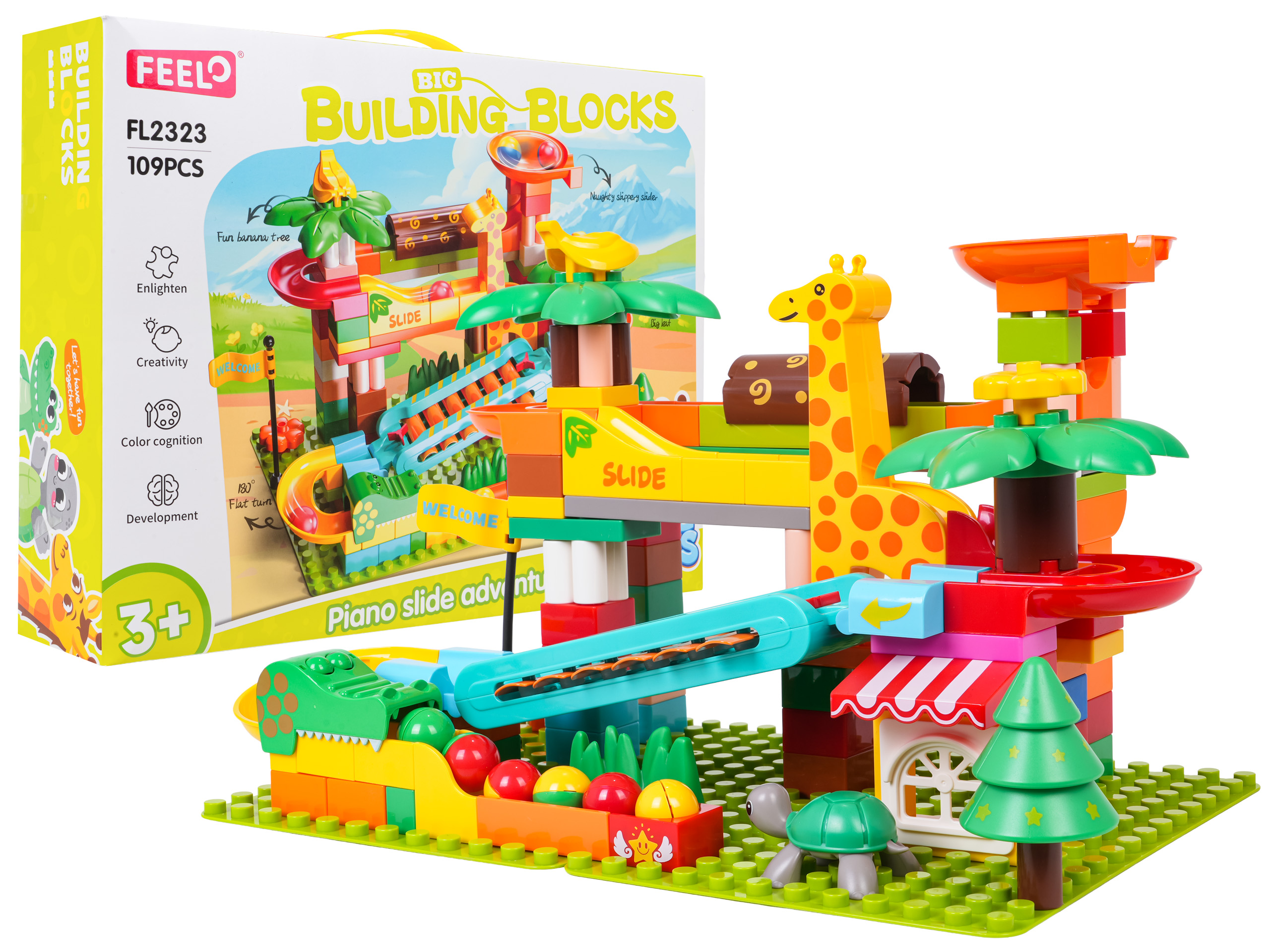 | Zestaw konstrukcyjnych klocków o tematyce safari z elementem grającym dla dzieci od trzeciego roku życia. Zestaw składa się z 109 elementów, klocków o różnych kształtach i rozmiarach, zjeżdżalni i cymbałek. Zbudować z niego możemy kolorowy park safari ze zjeżdżalnią dla piłeczek. Dodatkową atrakcją zestawu są w budowane w konstrukcję cymbałki. Piłki tocząc się przez nie, wydają dźwięczne rytmy. Montaż klocków jest prosty i przyjemny. Klocuszki wykonano z wysokiej jakości plastiku, bezpiecznego dla dzieci. Klocki rozwijają umiejętności motoryczne i koordynację ręka-oko.