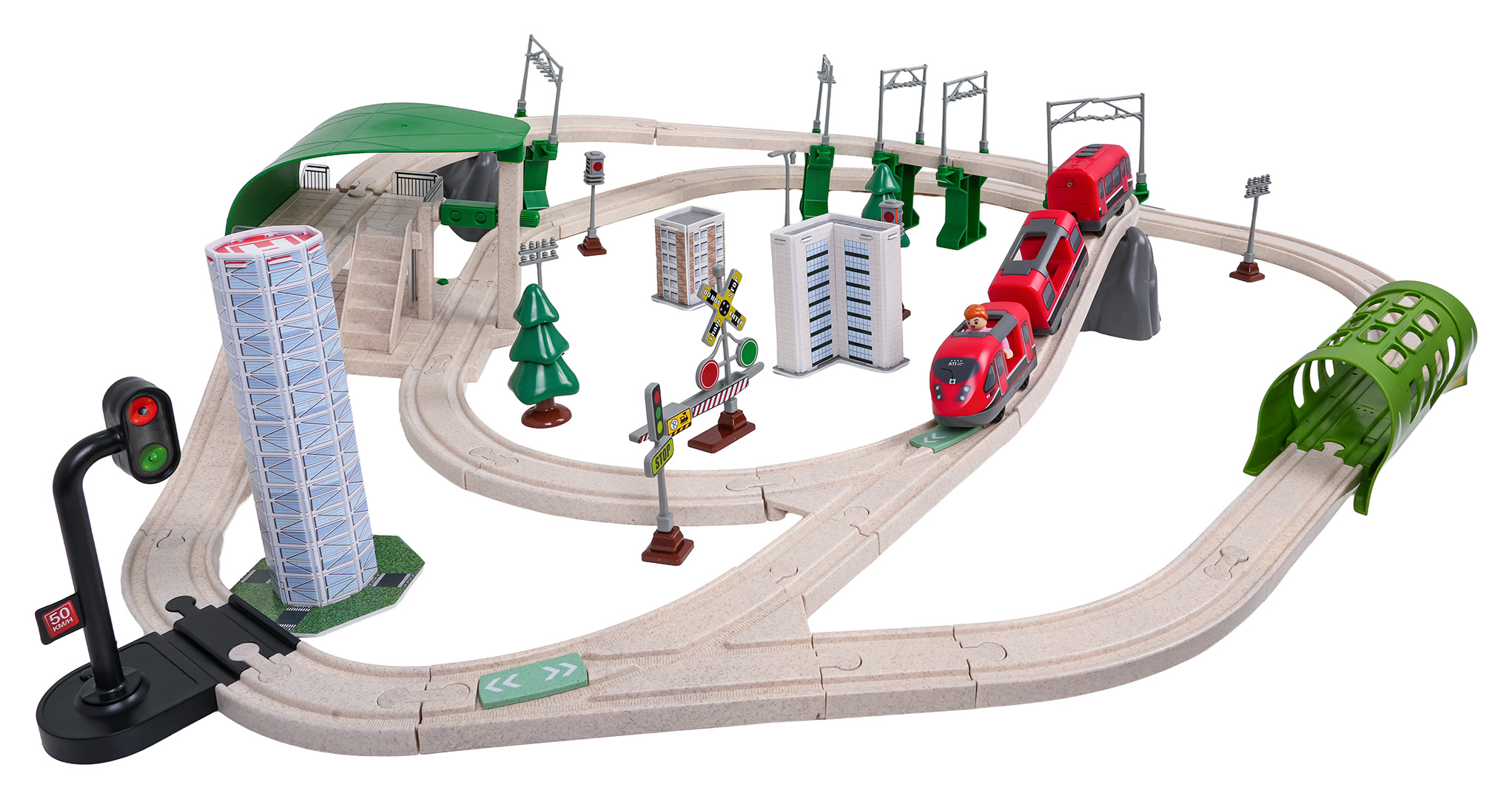 Funkcje: - dla dzieci od trzeciego roku życia, - wykonany z trwałych i bezpiecznych materiałów, - daje wiele możliwości kreatywnej zabawy, - efekty dźwiękowe: odgłosy pociągu, - efekty świetlne: przednie reflektory pociągu, mrugające światełka w tunelu, podświetlana stacja, zmieniające się światełka na sygnalizacji świetlnej. |