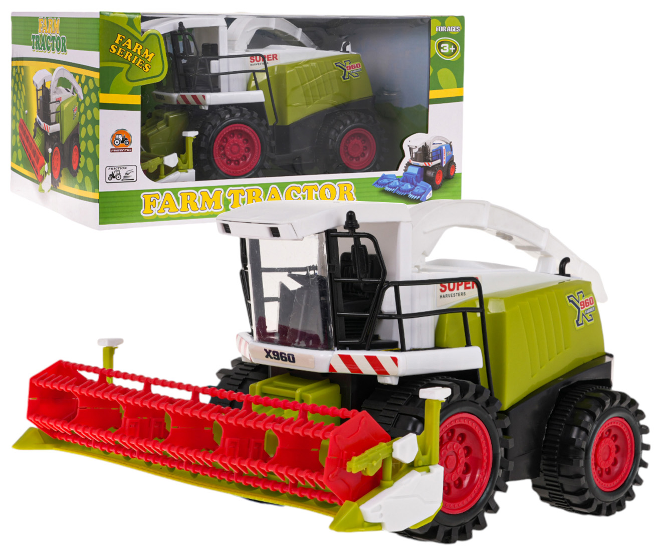 Wymiary | - kombajn ok. 36 cm x 18 cm x 25,5 cm, - koła przód o średnicy ok.8 cm, - koła tył o średnicy ok. 7 cm - kombajn po zdjęciu nagarniacza o długości ok. 30 cm, - opakowanie ok. 39 cm x 19,3 cm x 27 cm. |