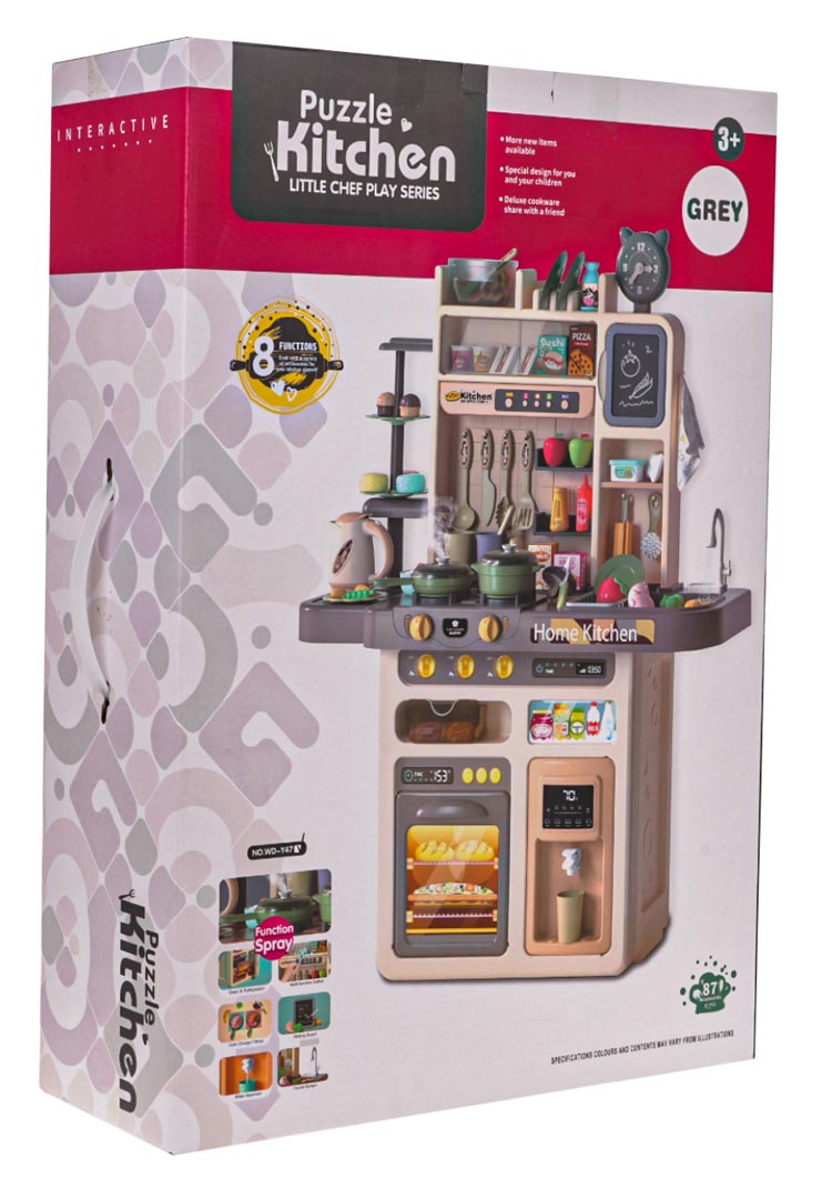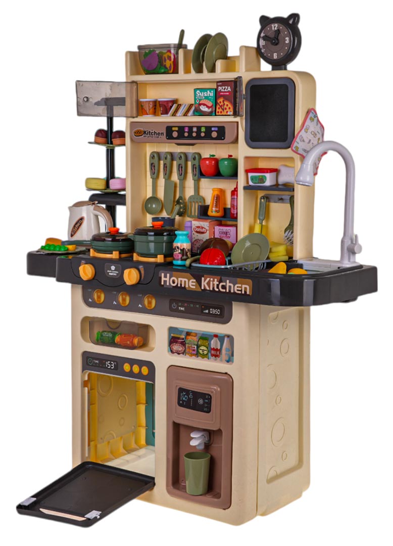 | Rewelacyjna, bogato wyposażona, duża multifunkcyjna kuchnia dla dzieci powyżej 3-go roku życia. Kuchnia posiada zlew z kranem, z którego leje się woda, podświetlane palniki z odgłosami gotowania i smażenia, jeden z palników posiada funkcję wytwarzania pary wodnej, ruchome pokrętła, okap z lampką i panelem muzycznym, otwierany piekarnik, lodówkę z podajnikiem wody, zegar, półeczki i liczne akcesoria kuchenne. Zestaw zasilany jest bateriami typu 7 x AA 1,5 V (brak w zestawie).