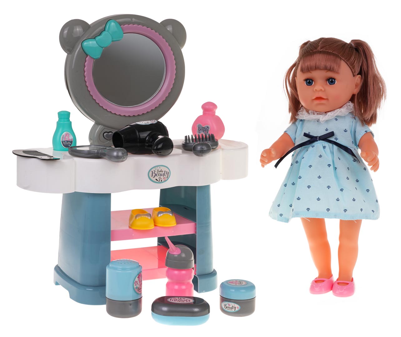 Funkcje zestawu: - przeznaczony dla dzieci od 3-go roku życia, - wykonany z najlepszej jakości plastiku, - podświetlane lustro w toaletce, - efekty dźwiękowe na toaletce: melodia, - liczne akcesoria do pielęgnacji ciała, - liczne akcesoria do włosów, - lalka robi siusiu, - lalka wydaje różne odgłosy: płacze, śmieje się, śpi, marudzi itd. |
