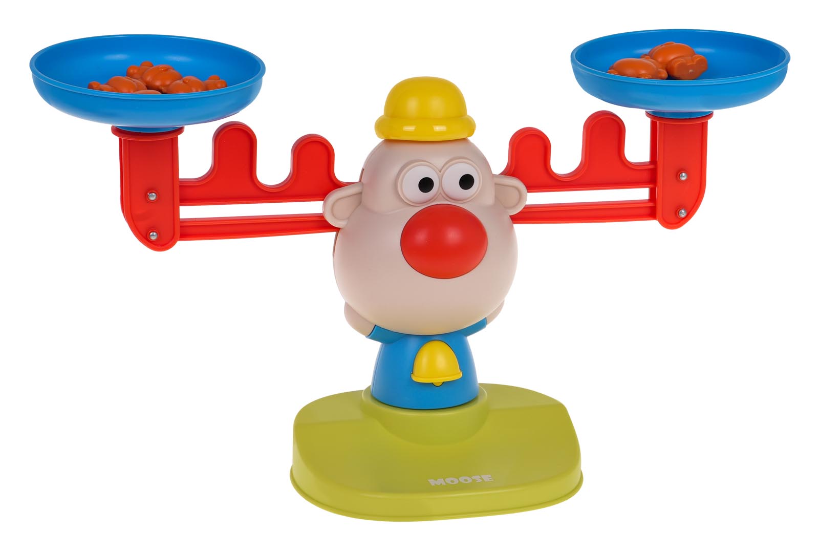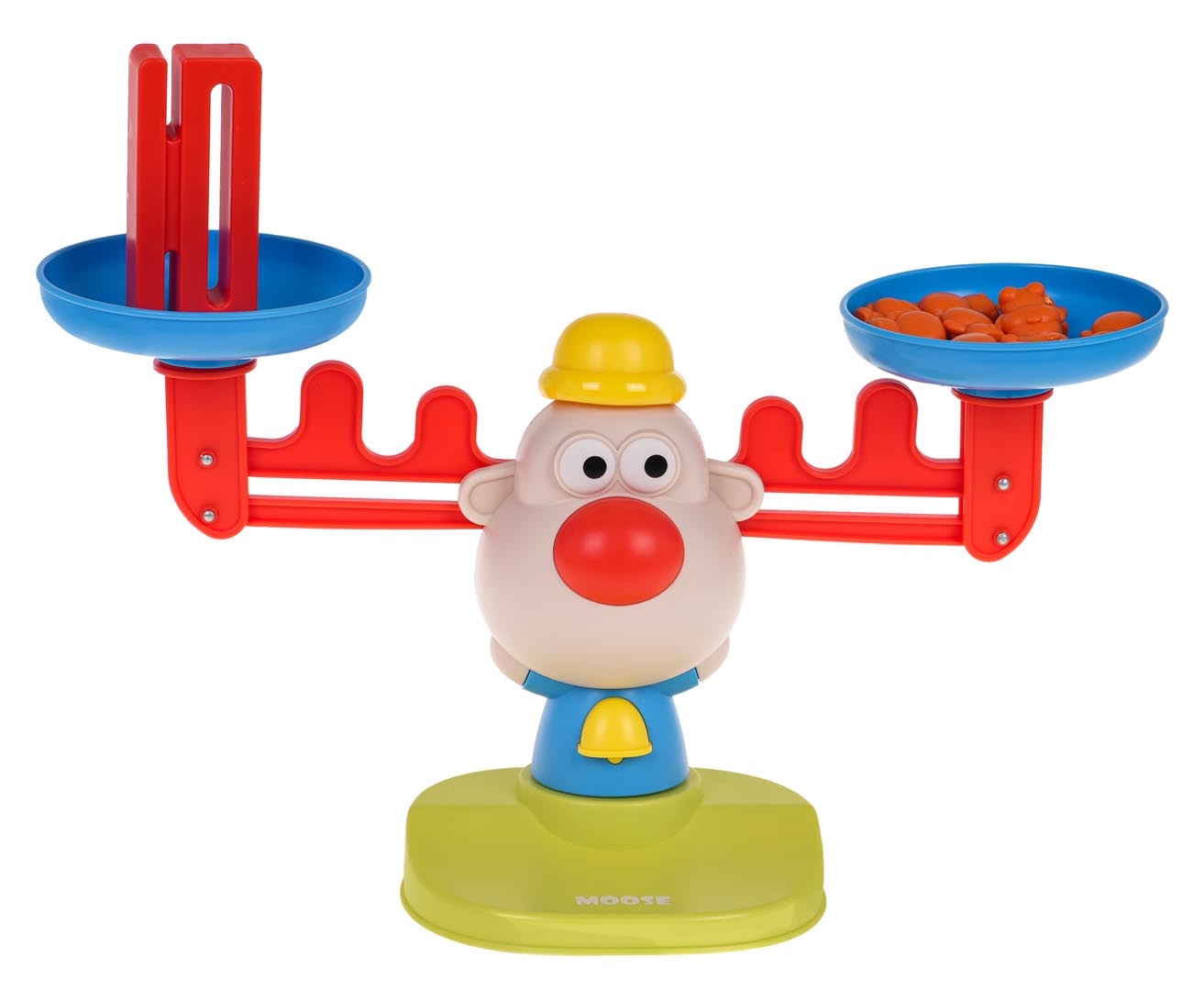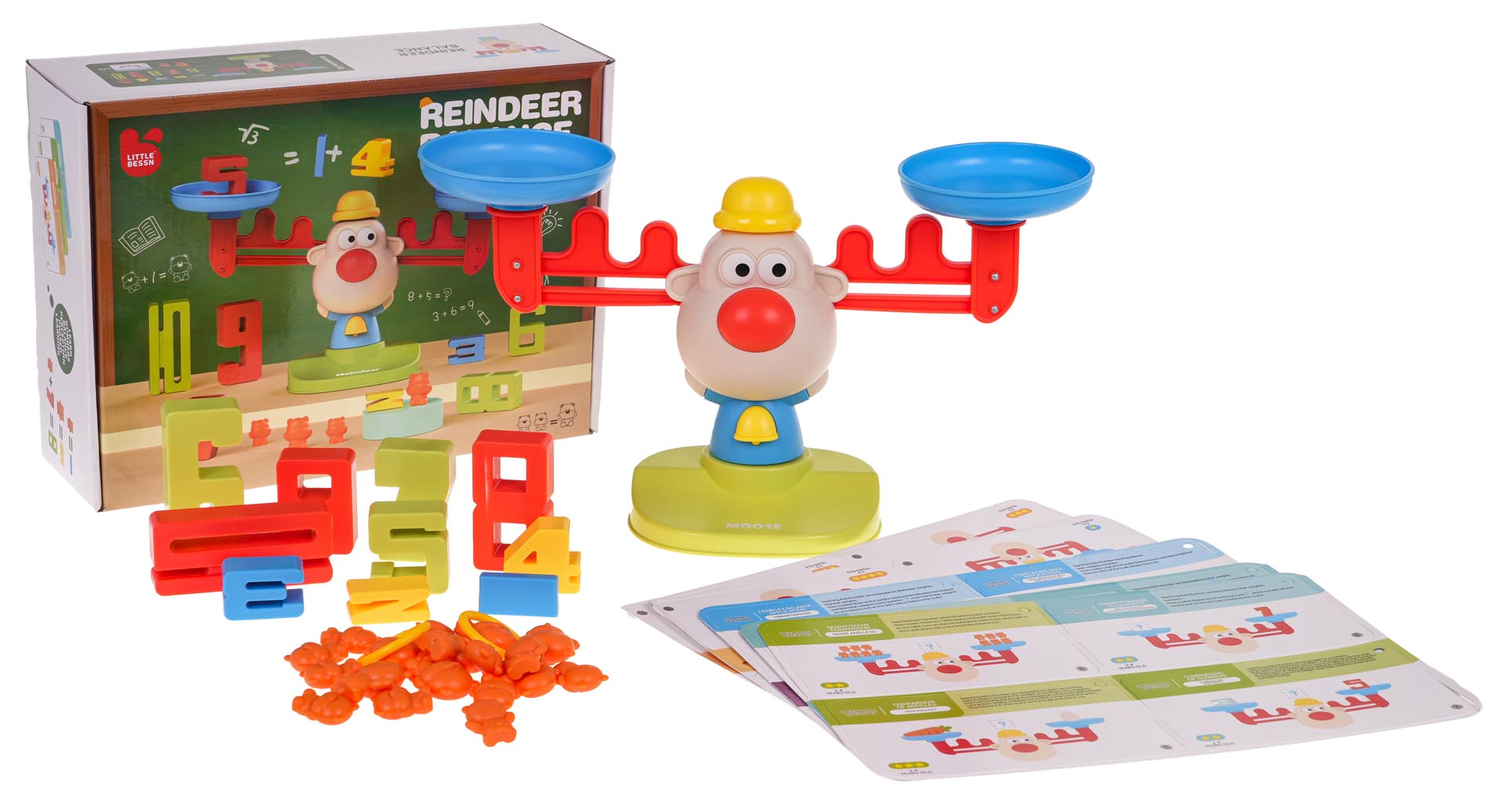 | – klaun na podstawce z wagą szalunkową, – odważniki w postaci małych (12 szt.) i dużych misi (6 szt.) – cyferki od 1 do 10, – 20 dwustronnych karty z zadaniami. |
