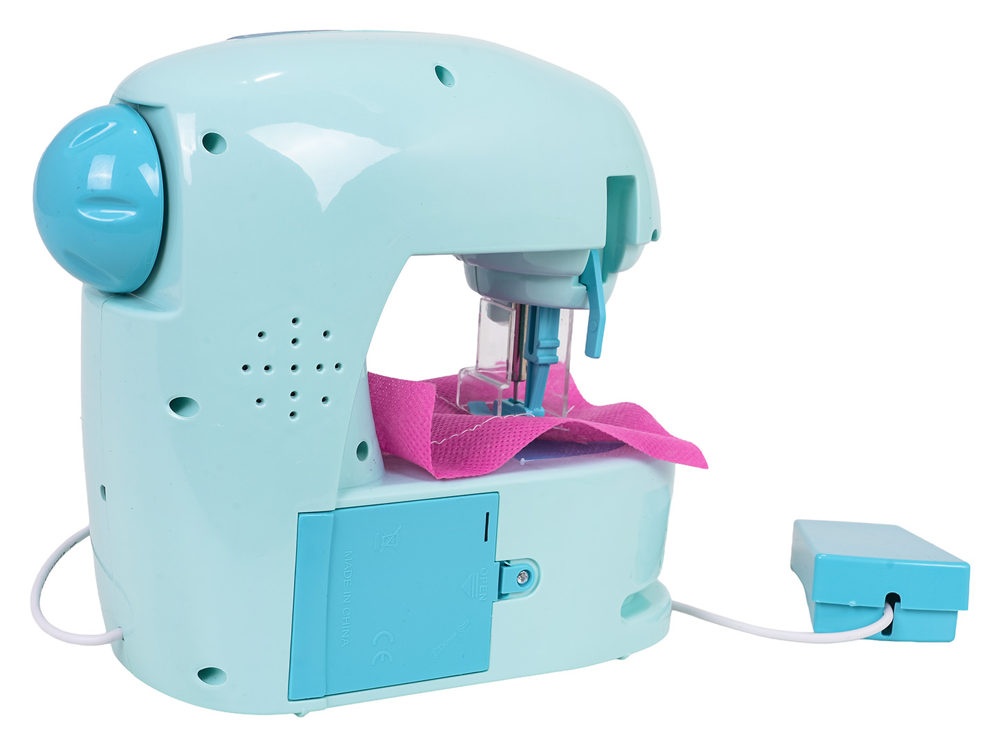 | Interaktywna maszyna do szycia z efektami dźwięku i światła dla dzieci od trzeciego roku życia. Zabawka wykonana z solidnych materiałów i bezpieczna dla dziecka. Maszyna posiada igłę w zabudowie, która zabezpiecza, przed skaleczeniem się dziecka. Zabawkę wyposażono w praktyczną myszkę uruchamiającą maszynę, pokrętło do podnoszenia igły, podnośnik stopki oraz wbudowany schowek na akcesoria. Podczas pracy maszyny, świeci się światełko. W zestawie z maszyną znaleźć możemy również 3 szpulki nici, metr krawiecki, nawlekacz nici i dwa kawałki materiału. Zabawa maszyną wspomaga rozwój koordynacji wzrokowo-ruchowej i kreatywności. Maszyna zasilana jest bateriami typu 3 x AA 1,5V (brak w zestawie).