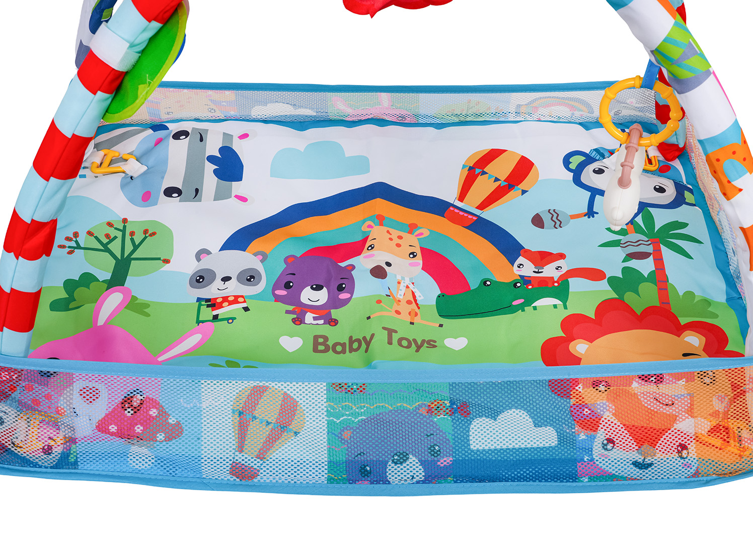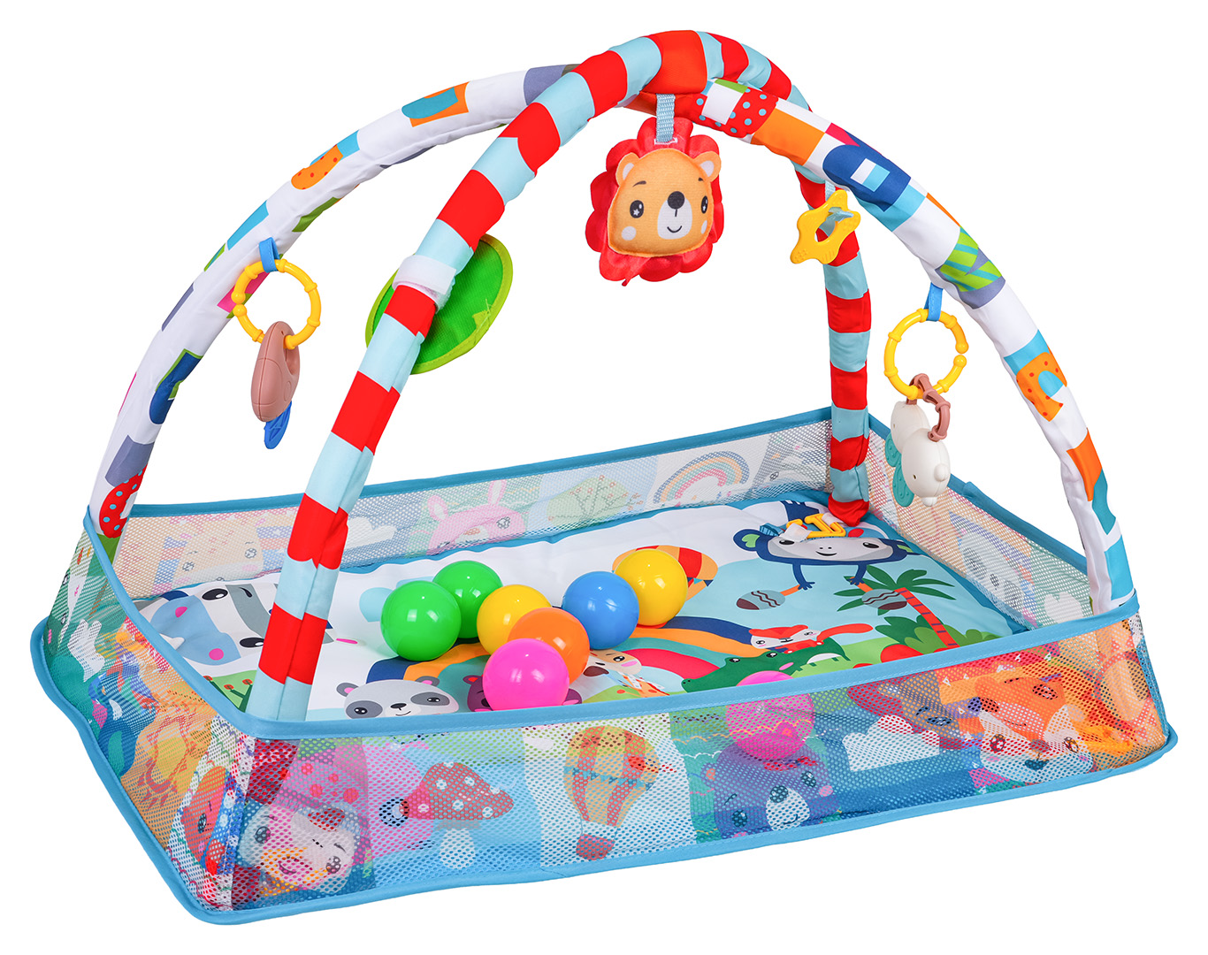 | Edukacyjna mata do leżenia, suchy basen dla dzieci od pierwszych dni życia. Mata wykonana została z bezpiecznych dla maluszka materiałów w żywych kolorach przyciągających wzrok dziecka. Materiał, z którego wykonano matę, jest łatwy w utrzymaniu czystości, konstrukcja jest solidna i stabilna. Na pałąku znajdują się odczepiane zawieszki, które można przyczepić również do łóżeczka czy fotelika. W zestawie znaleźć możemy także kilka piłeczek. Cały zestaw zapakowany jest w opakowanie w kształcie torebki z paskiem.