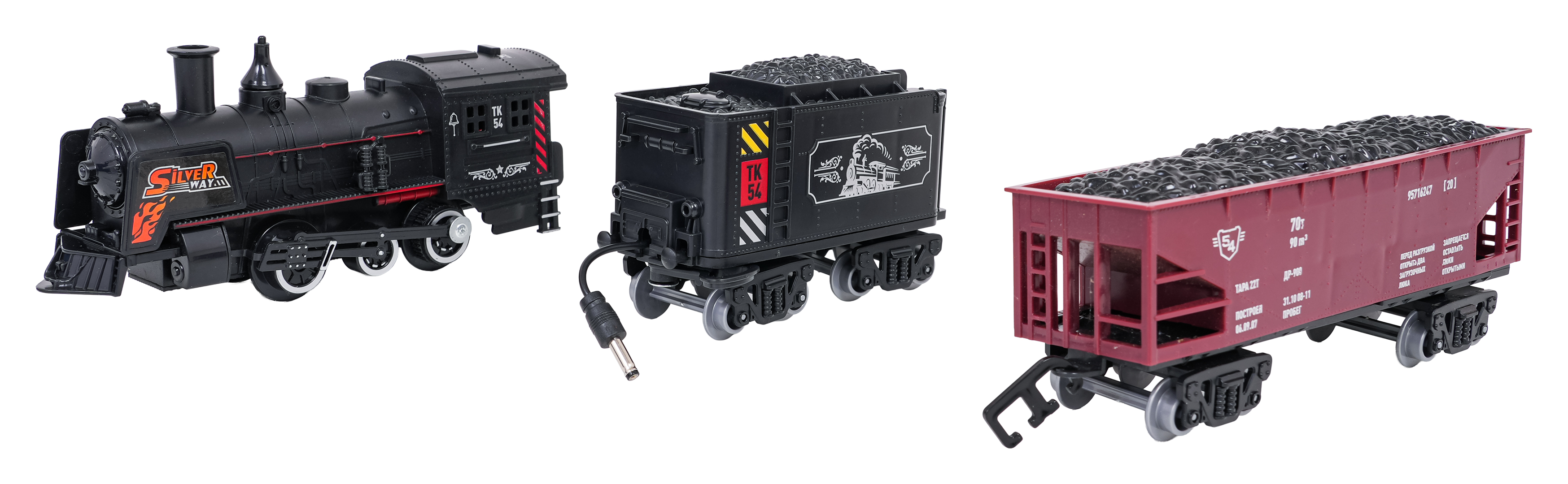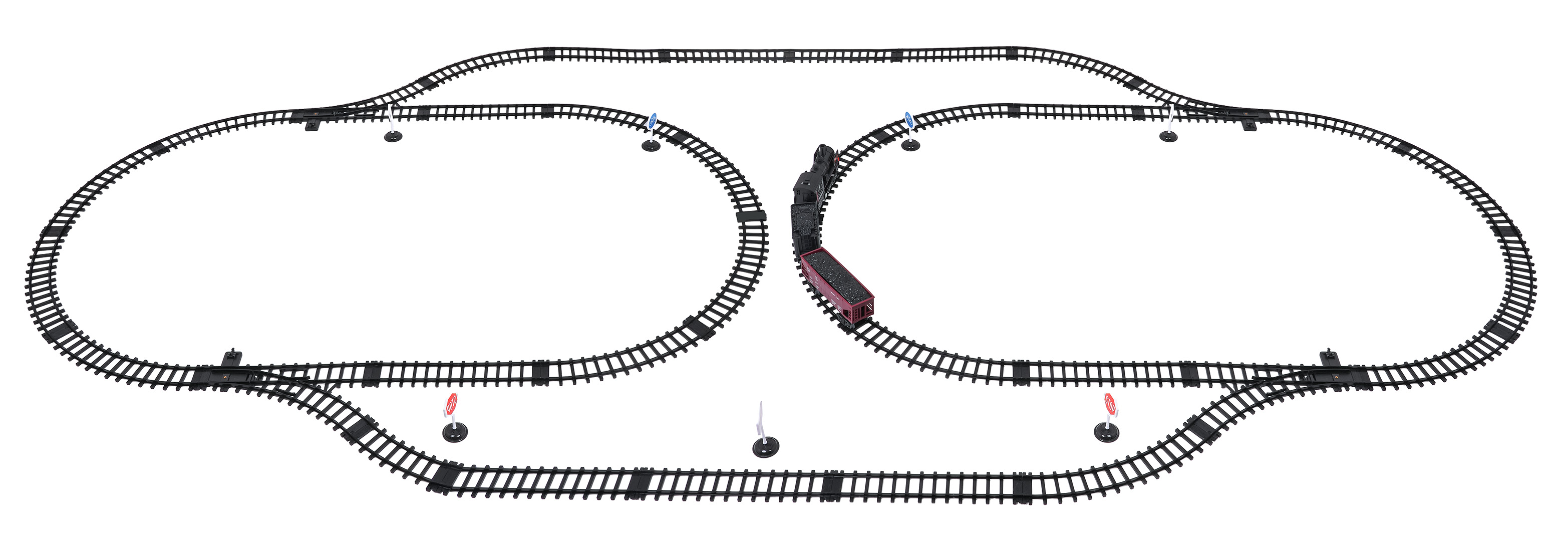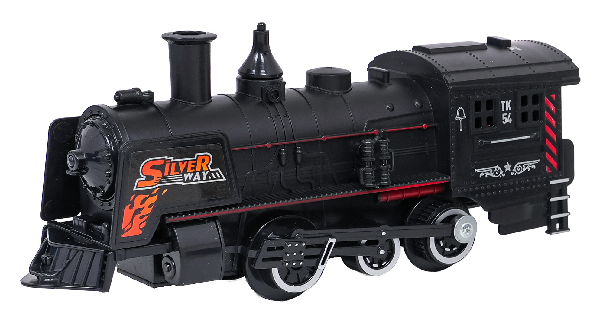 | Zestaw retro kolejka z funkcją dymu, światła i dźwięku dla dzieci od trzeciego roku życia. Zabawka zasilana jest bateriami typu 4 x AA 1,5V (brak w zestawie). Podczas jazdy lokomotywa wypuszcza kominem dym, po wcześniejszym uzupełnieniu jej wodą (pipetka do wody dołączona do zestawu), świeci się przedni reflektor i słyszymy odgłosy jazdy. Tory są wytrzymałe i bezpieczne oraz posiadają łatwy sposób łączenia.