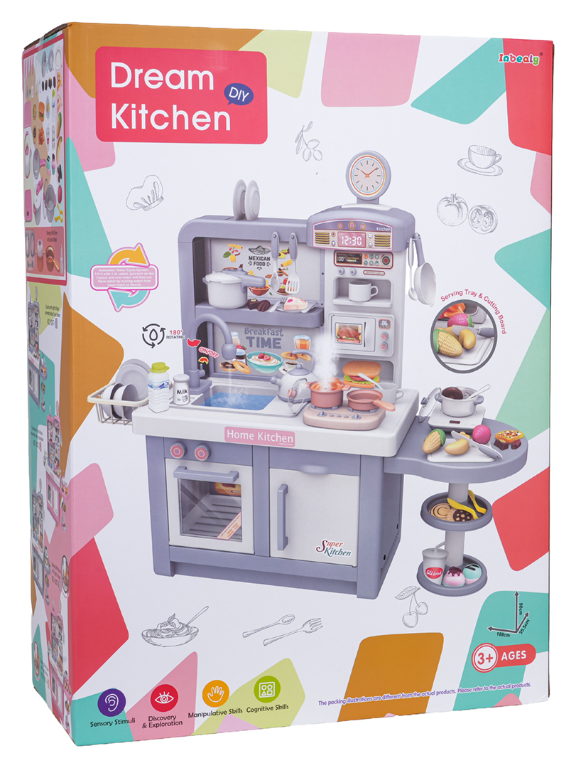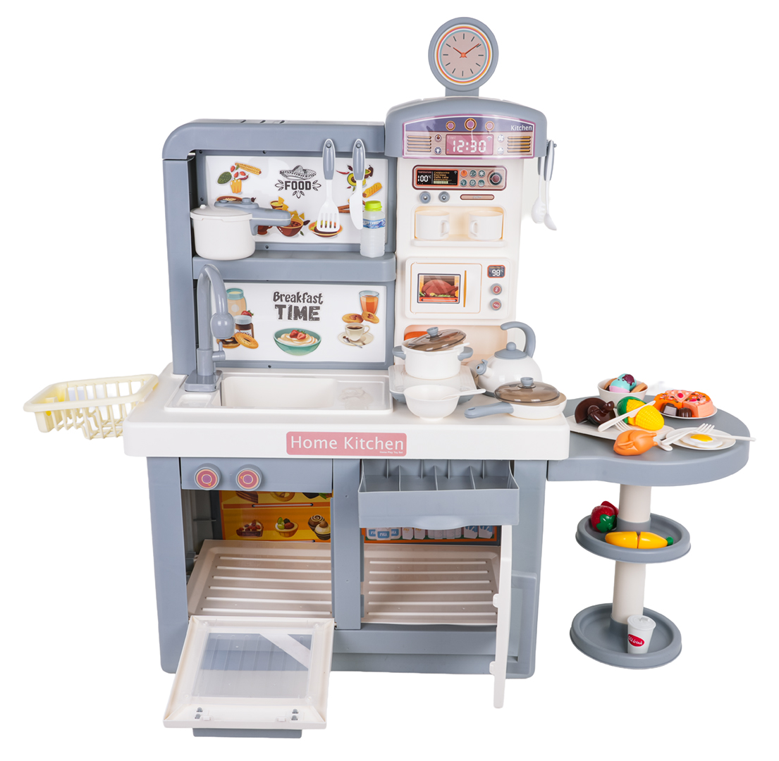 | Interaktywna, bogato wyposażona kuchnia z efektami dźwięku, światła i pary dla dzieci od trzeciego roku życia. Wszystkie elementy zestawu wykonano z najlepszej jakości bezpiecznych dla dzieci materiałów. Kuchnia utrzymana jest w szaro – białej tonacji, będzie pasowała do każdego dziecinnego pokoju. Zabawkowa kuchnia posiada kuchenkę mikrofalową, zlew z kranikiem, kuchnię indukcyjną, piekarnik, ekspres do kawy, lodówkę, stojak na desery i mnóstwo akcesoriów kuchennych, takich jak garnki, sztućce, talerze, czajnik, kubeczki oraz atrap produktów spożywczych. Z kranika naprawdę leje się woda, kuchenka indukcyjna jest podświetlana, ma wyświetlacz temperatury oraz wydaje realistyczne dźwięki gotowania i smażenia. Dodatkową atrakcją kuchni jest wydobywająca się bezpieczna (chłodna) para z jednego z garnków. Kranik zasilany jest bateriami typu 2 x 1,5V AA (brak w zestawie), płyta indukcyjna bateriami 3 x 1,5V AAA (baterii brak w zestawie).