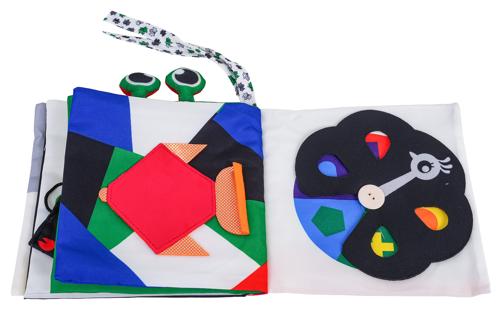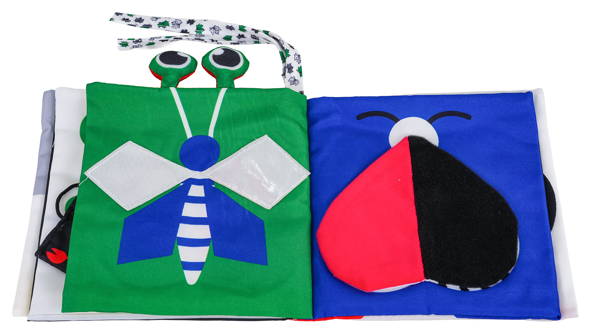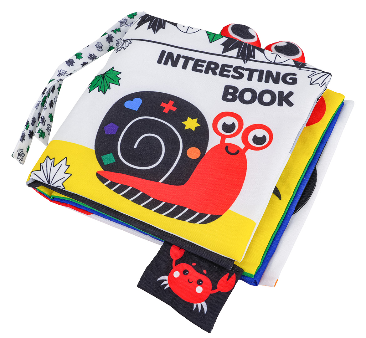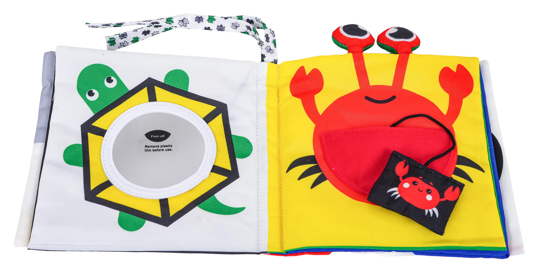 | Sensoryczna książeczka dla maluszków od pierwszych dni życia. Książeczka wykonana została z bezpiecznych dla niemowlaczków materiałów. Na górze książeczki są wszyte 2 tasiemki i oczy raka. Pierwsza i ostatnia kartka jest szeleszcząca, w środku znajdziemy również lusterko i piszczałkę. Książeczka pomoże rozwinąć umiejętności skupienia, koordynację oko-ręka, będzie wsparciem w nauce kolorów, kształtów.