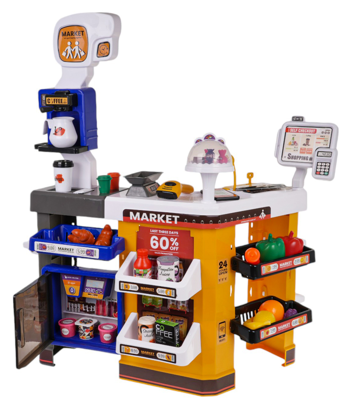 Wymiary | - market ok. 70 cm x 85 cm x 40 cm, - wózek sklepowy ok. 40,5 cm x 20 cm x 35 cm, - opakowanie ok. 60,5 cm x 19,3 cm x 46,5 cm, - skaner ok. 11 cm x 5,5 cm x 4,5 cm, - dzbanek na kawę ok. 7 cm x 8,5 cm, - kubek na kawę ok. 7,5 cm x 5 cm, - pojemniczek z lodami ok. 3,5 cm x 4,5 cm, - rogal ok. 9 cm x 6 cm x 4 cm, - winogrono ok. 8 cm x 4 cm x 3 cm, - papryka ok. 8 cm x 7 cm, - marchewka ok. 16 cm x 3,5 cm, - banan ok. 12 cm x 3 cm, - cytryna ok. 8 cm x 5 cm, - pomarańcza ok. 6 cm x 6 cm, - kiełbaska ok. 9,5 cm x 4 cm, - małe pojemniczki na kawę ok. 4 cm x 3,5 cm, - czekoladka ok. 2,5 cm x 1,5 cm, - cukierki ok. 3 cm x 3 cm, - puszki z sokiem ok. 4,5 cm x 7 cm, - jajka ok. 5 cm x 3,5 cm, - kluczyk ok. 3,5 cm x 2 cm, - kartoniki z mlekiem, kawą itd. ok. 7,5 cm x 5 cm x 2 cm, - atrapa telefonu ok. 11 cm x 5,5 cm x 1 cm, - karta płatnicza ok. 6,5 cm x 4 cm, - banknoty ok. 8,8 cm x 3,8 cm, - monety od 2,5 cm do 3 cm średnicy. |