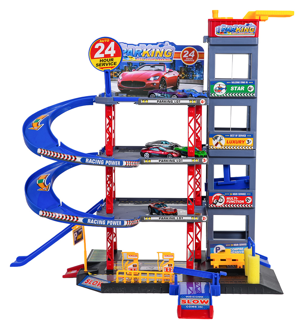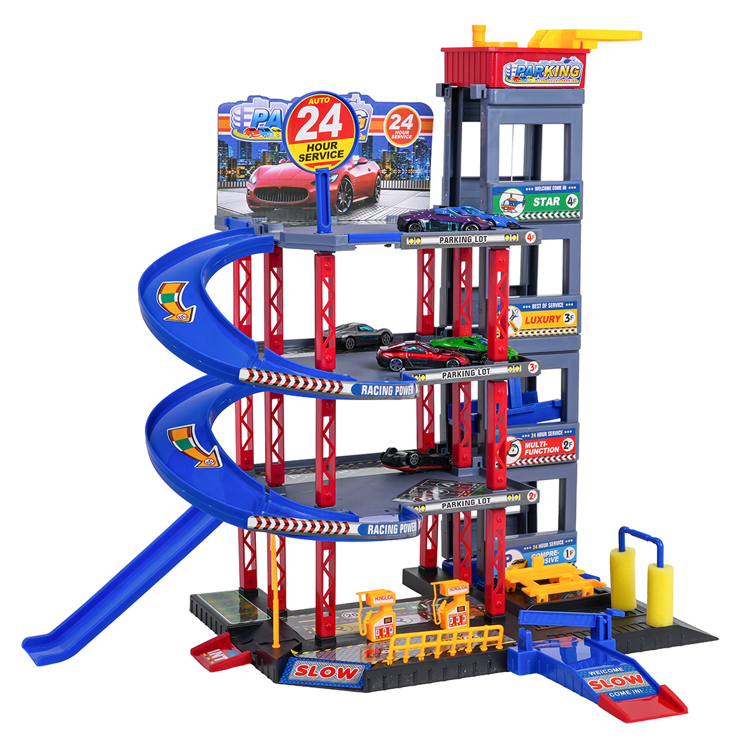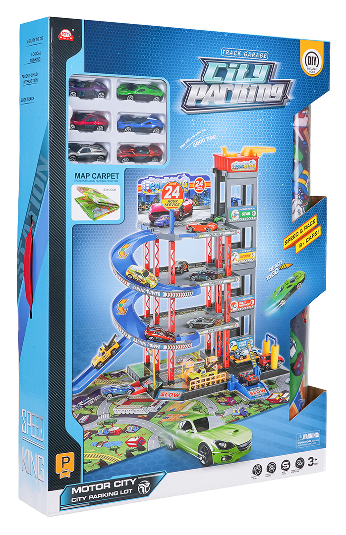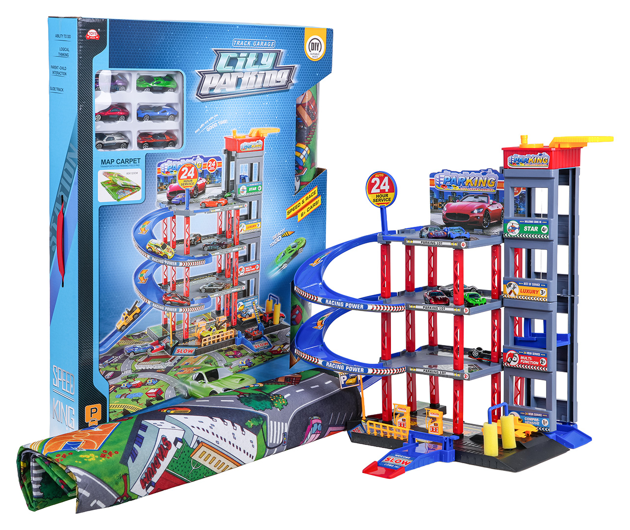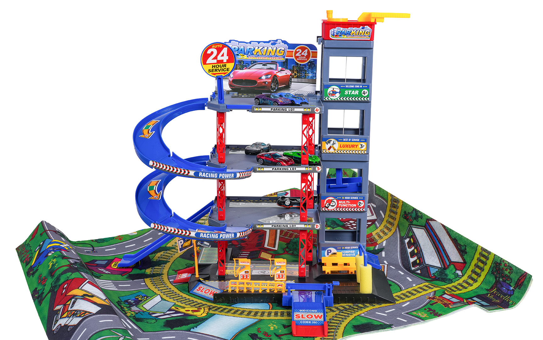 | Duży interaktywny parking z windą, stacją, zjeżdżalniami dla autek i matą z drogami to propozycja dla dzieci od trzeciego roku życia. Parking posiada wiele poziomów, na które można dostać się za pomocą windy. Każdy z poziomów połączony jest z innym zjeżdżalnią dla resoraków. Wielopoziomowy parking posiada miejsca parkingowe, stację benzynową, podnośnik dla samochodów, myjnię oraz lądowisko dla helikopterów. Winda obsługiwana jest manualnie (korbka). W zestawie z parkingiem znajduje się też mata filcowa z ulicami i aż 6 pojazdów, typu resoraki.