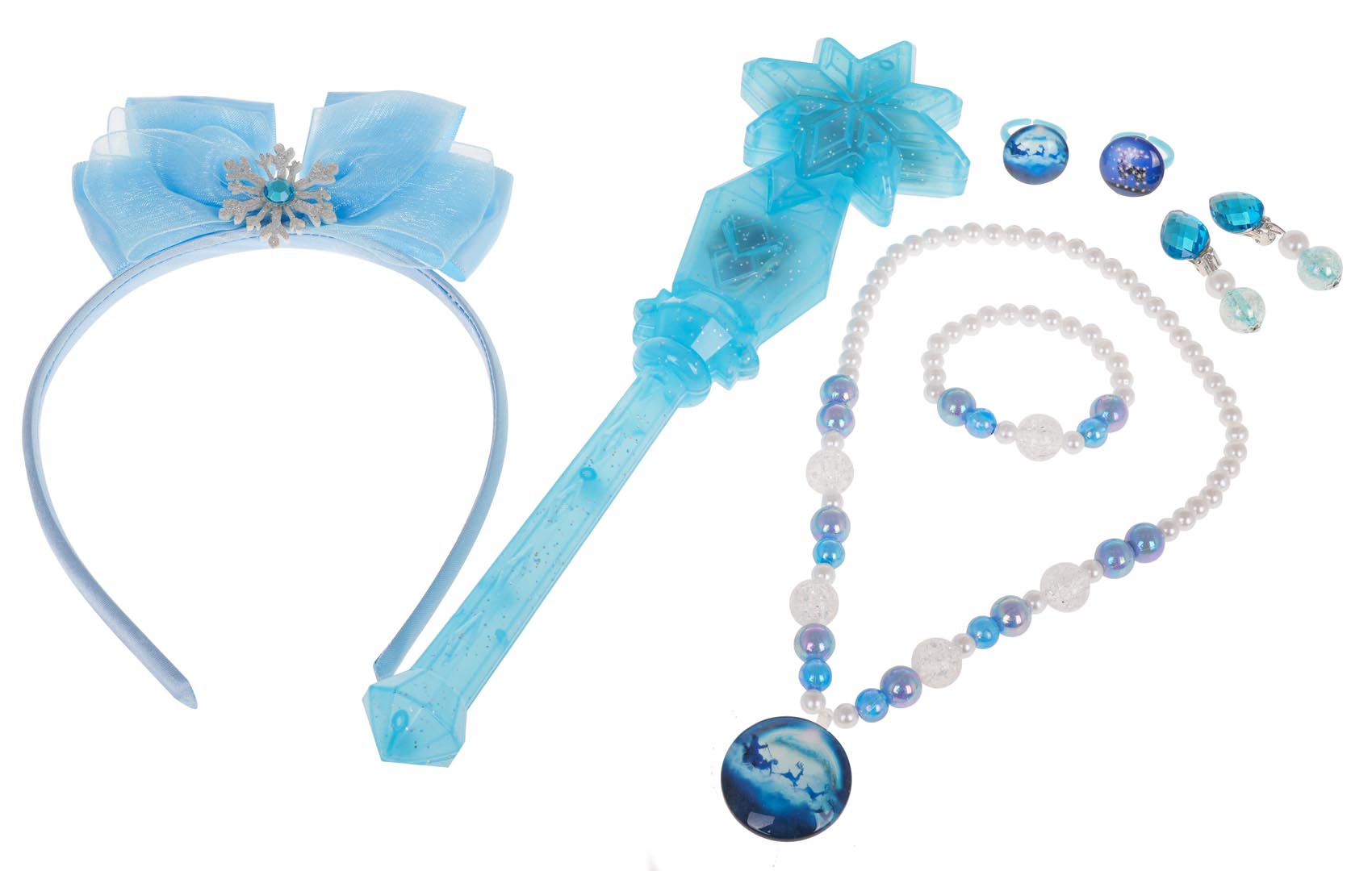 | - różdżka, - opaska do włosów, - korale, - bransoletka, - 2 x pierścionek, - zestaw kolczyków. |