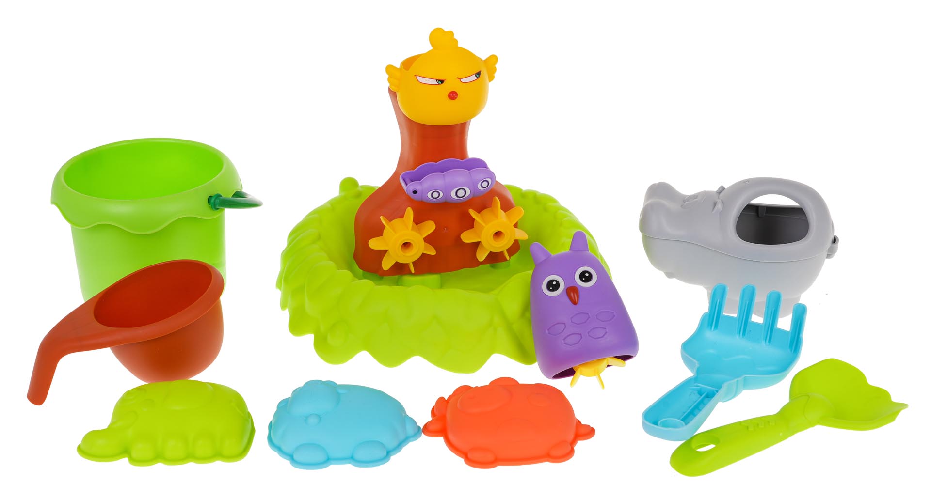 | - piaskownica 4 poziomowa, - zabawki z kółkami zębatymi, - wiaderko, - nalewak, - 3 x foremka, - łopatka, - grabki, - konewka w kształcie hipopotama. |