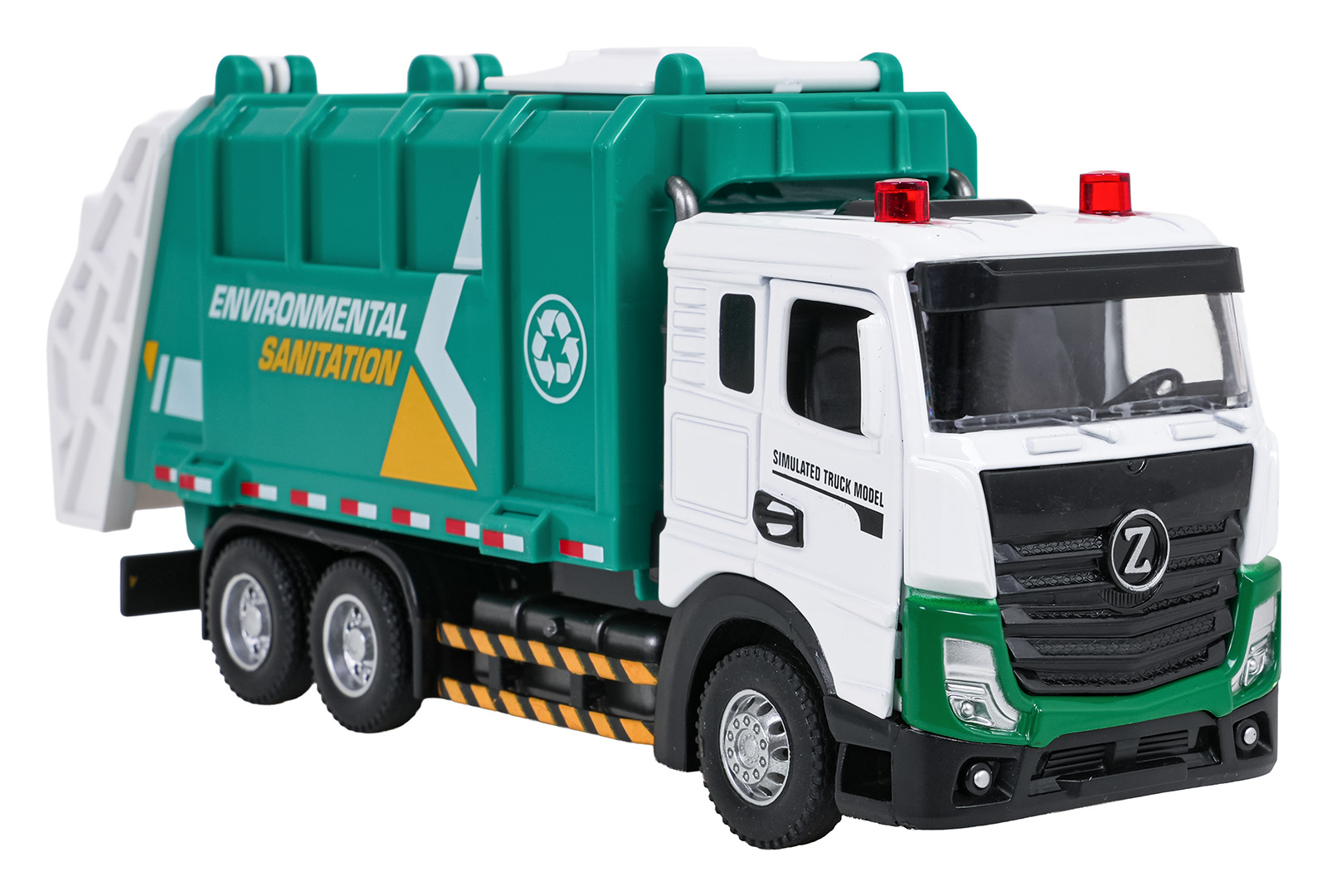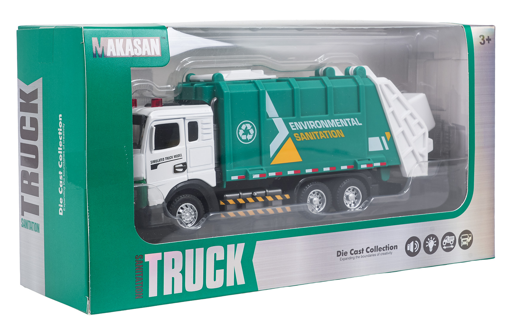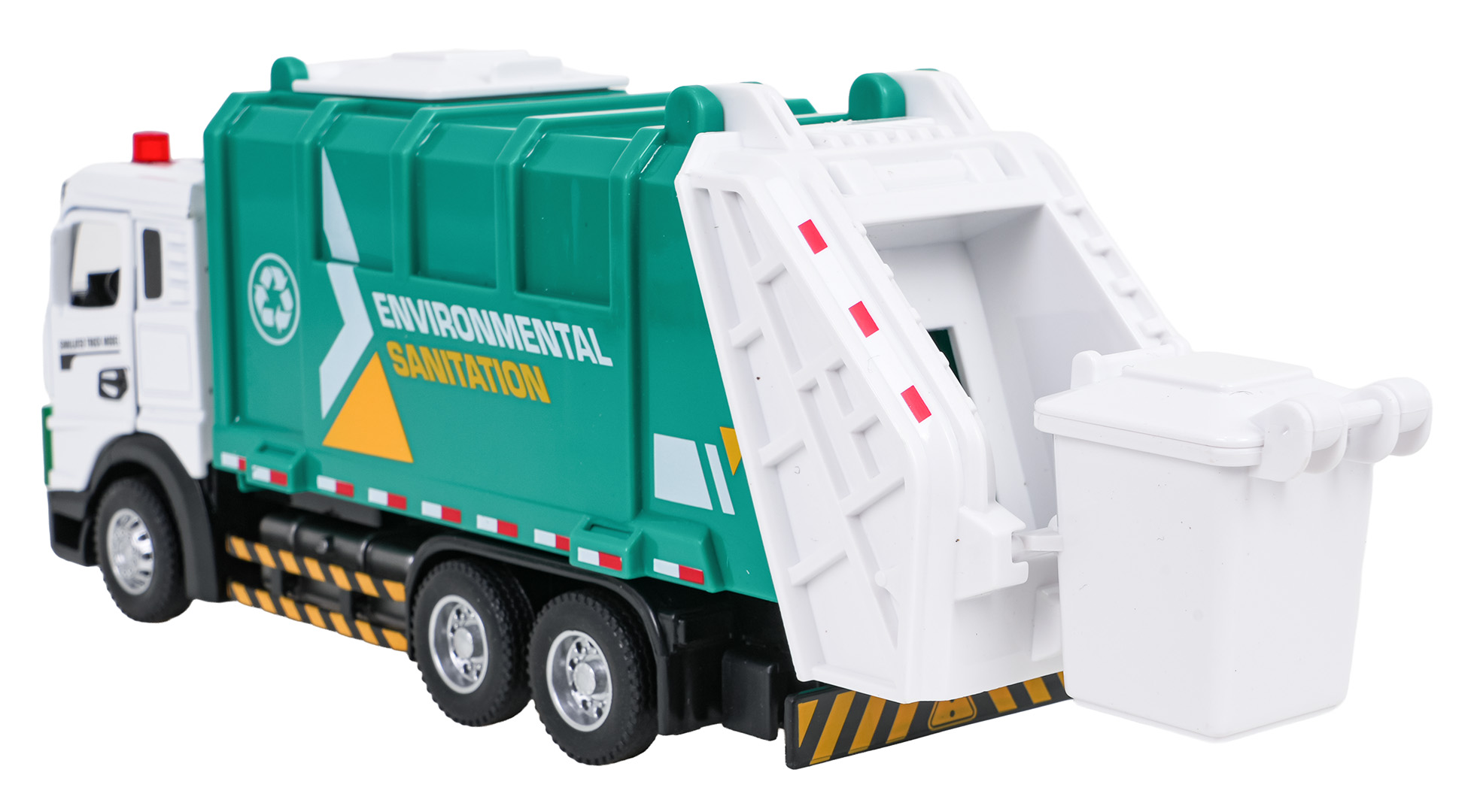 | Interaktywna metalowa śmieciarka z funkcją dźwięku i światła dla dzieci od trzeciego roku życia. Śmieciarka wykonana została z metalu i tworzywa sztucznego najlepszej jakości. Pozsiada realistyczne wykonanie. Drzwi kabiny pojazdu się otwierają, a kółeczka łatwo przemieszczają po podłożu. Na dachu kabiny świecą się dwa światełka i słychać odgłos pracy pojazdu i melodie, a klapę wsypu możemy otwierać manualnie. Zabawka zasilana jest bateriami typu 3 x AG13 (w zestawie).