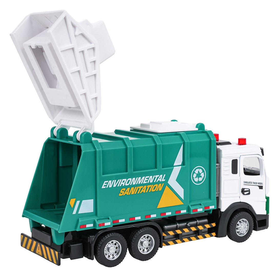 Funkcje: - dla dzieci od trzeciego roku życia, - wykonana z metalu i tworzywa sztucznego najlepszej jakości, - efekty dźwiękowe: odgłosy pracy maszyny i melodia, - efekty świetlne: świecące światełka na kabinie śmieciarki, - kółeczka łatwo przemieszczają się po podłożu (napęd pull back), - gumowe opony, - otwierane drzwi kabiny śmieciarki, - otwierany wsyp śmieciarki, - otwierana tylna klapa, - możliwość przechylenia całego kontenera. |
