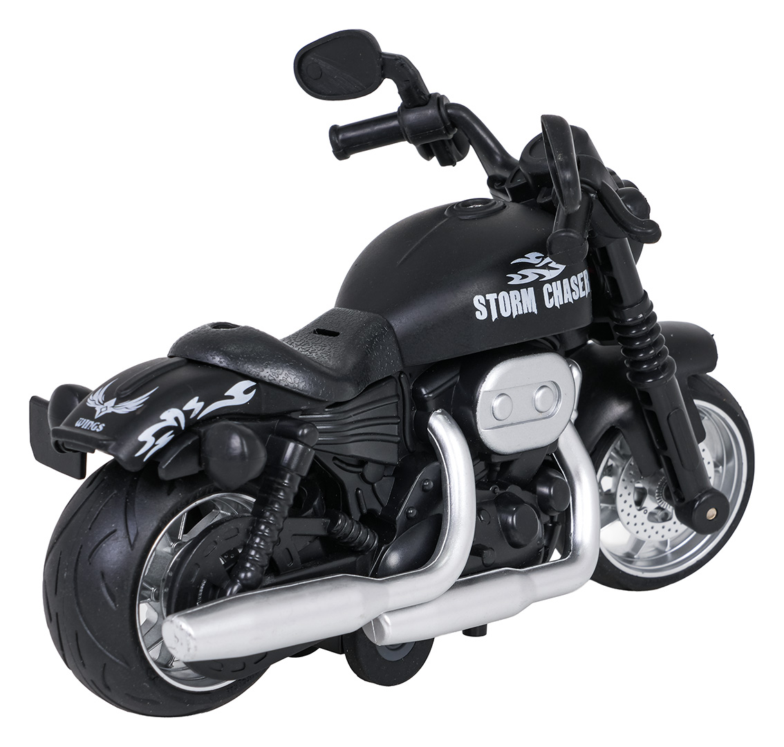 | Metalowy model motocykla z efektem dźwięku i światła i napędem dla dzieci powyżej trzeciego roku życia. Model wykonany został z dbałością o szczegóły, posiada metalową karoserię i gumowe opony dobrze trzymające się podłoża. Zabawkę wyposażono w napęd pull back, a po naciśnięciu na tylne koło słychać odgłosy odpalania pojazdu i mruga przedni reflektor. Zabawka zasilana jest bateriami typu 3 x AG3 (w zestawie).