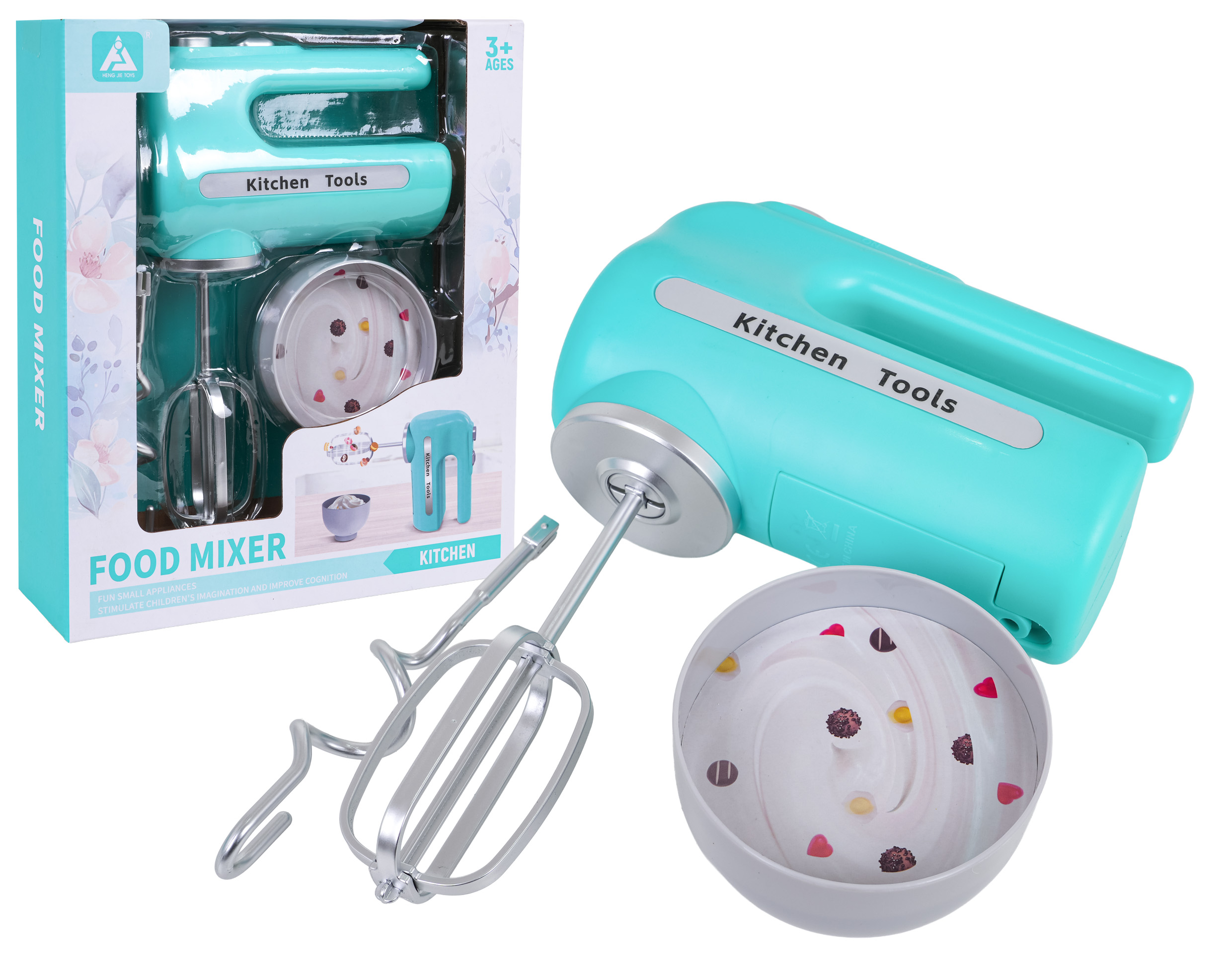 | - mikser, - 2 x trzepaczka do miksera, - miseczka z atrapą kremu. |