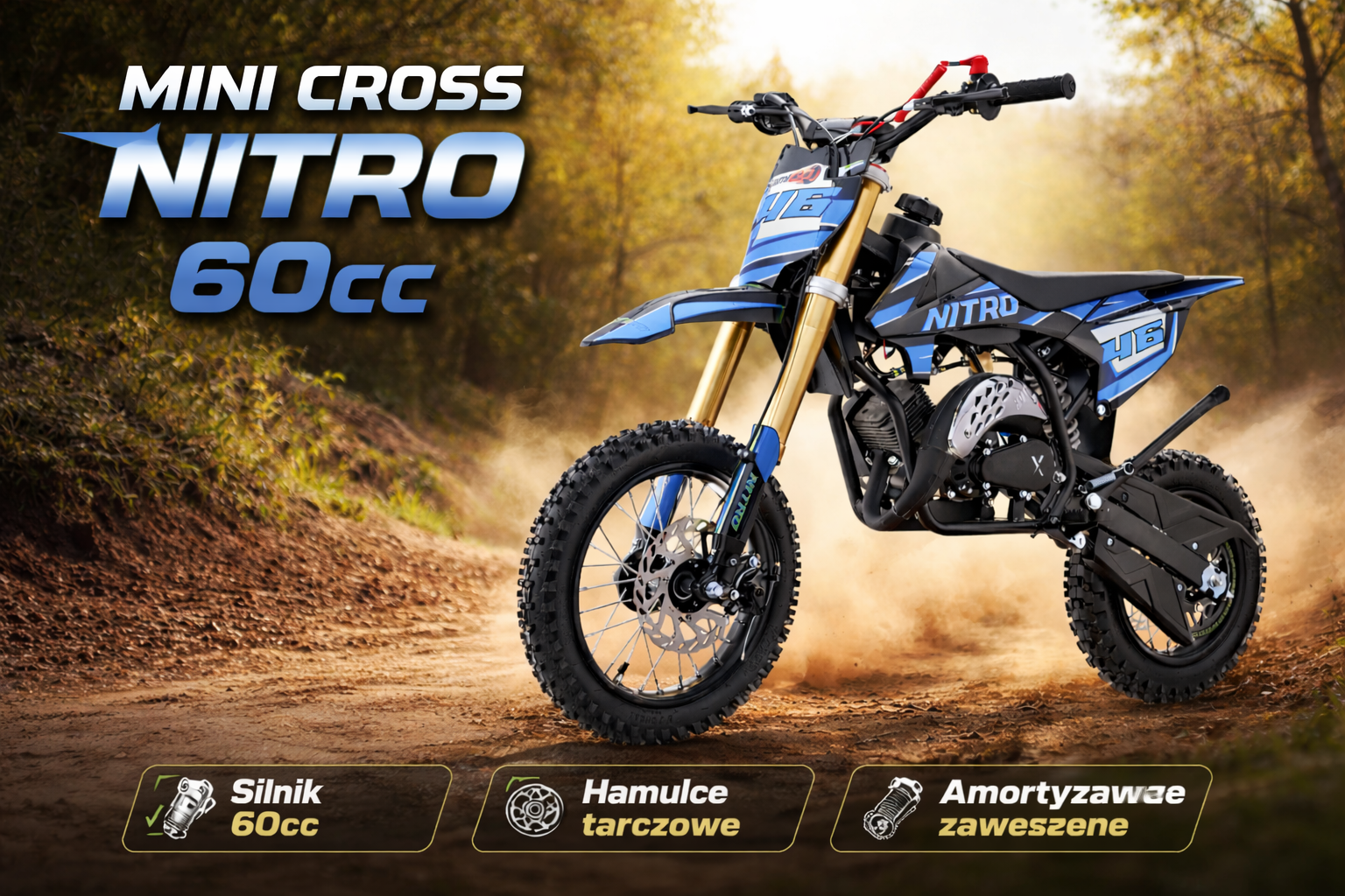 Szukasz pierwszego motocykla crossowego dla młodego fana off-roadu? Mini Cross NITRO 60cc od RamiGO to idealne połączenie mocy, bezpieczeństwa i solidnej konstrukcji. Stworzony z myślą o początkujących riderach, zapewnia świetną zabawę zarówno na podwórku, jak i w terenie.