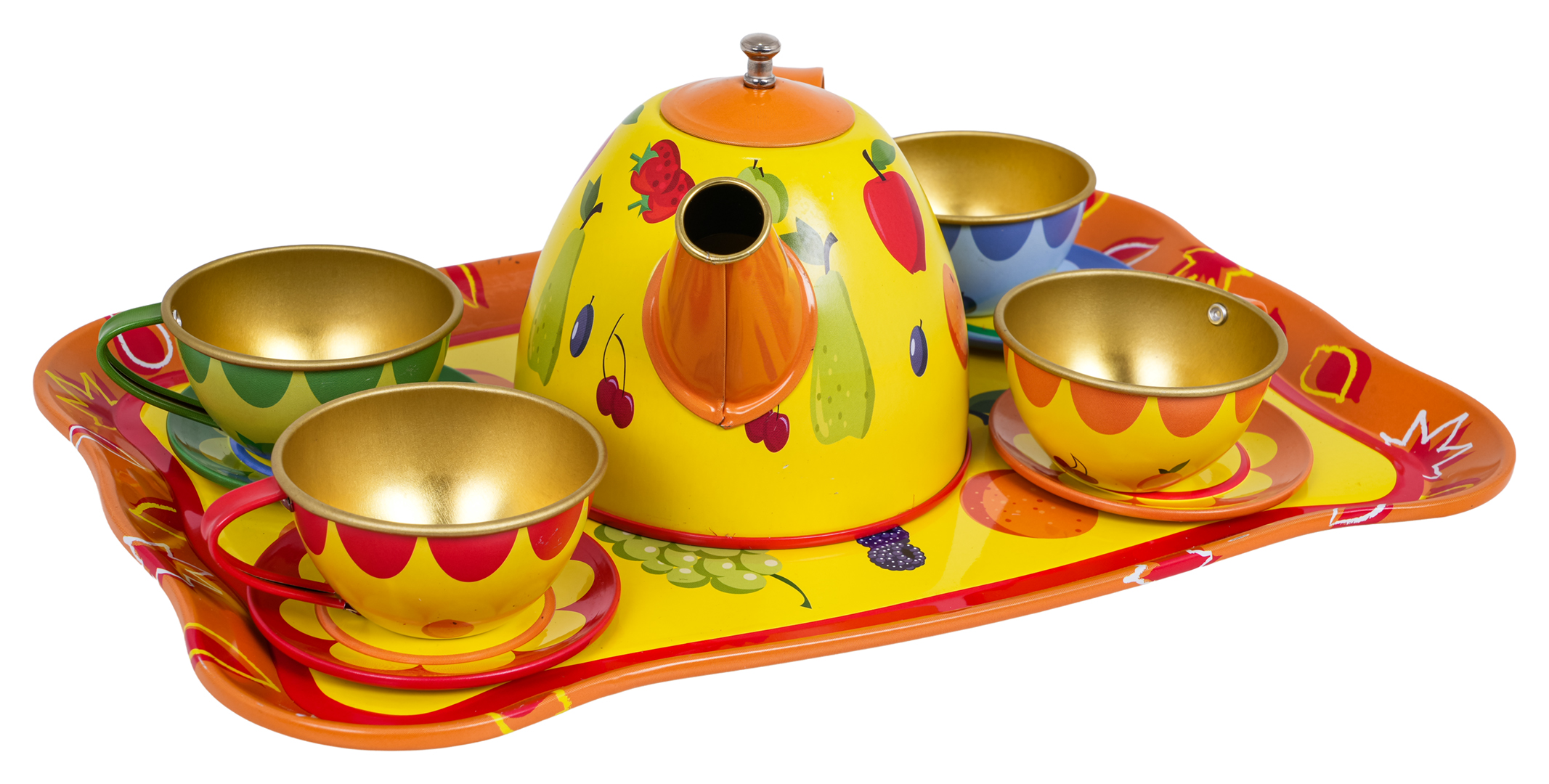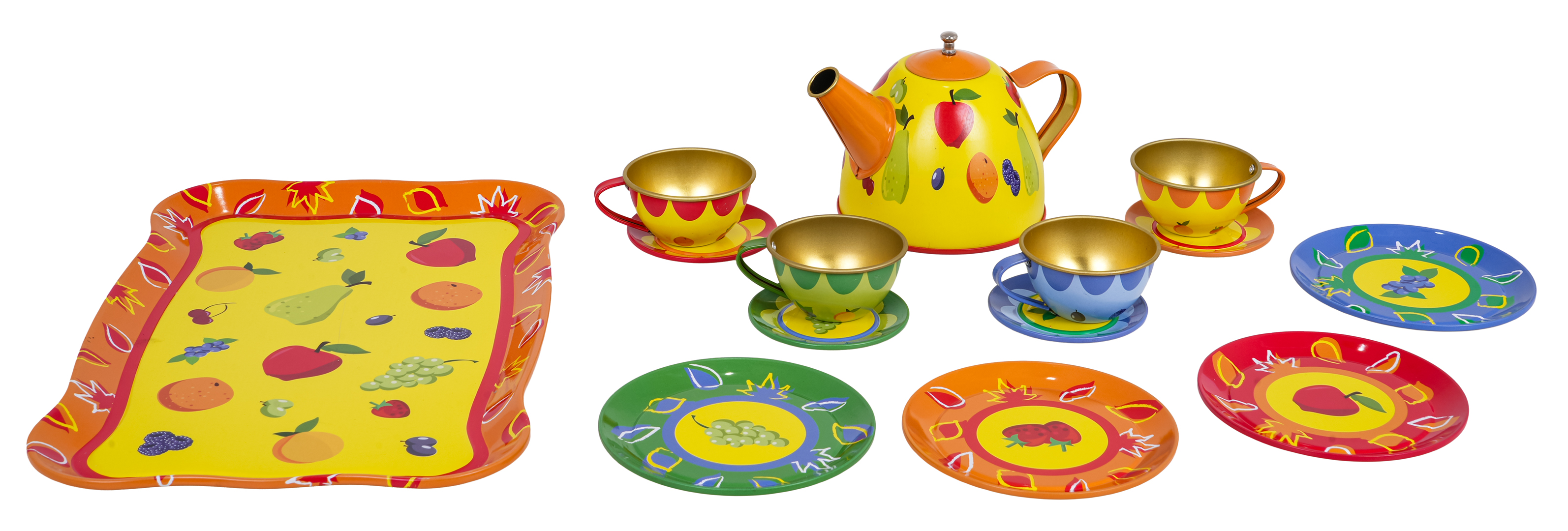 | Metalowy, owocowy zestaw do herbaty dla dzieci powyżej trzeciego roku życia. Zestaw składa się z 15 elementów i zawiera wszystko, co niezbędne by Twoja pociecha mogła zaserwować herbatkę. W zestawie znaleźć możemy czajniczek, filiżanki, spodki, talerzyki czy tacę. Elementy zestawu wykonano z metalu i pokryto bezpieczną, nietoksyczną farbą w żywych kolorach.