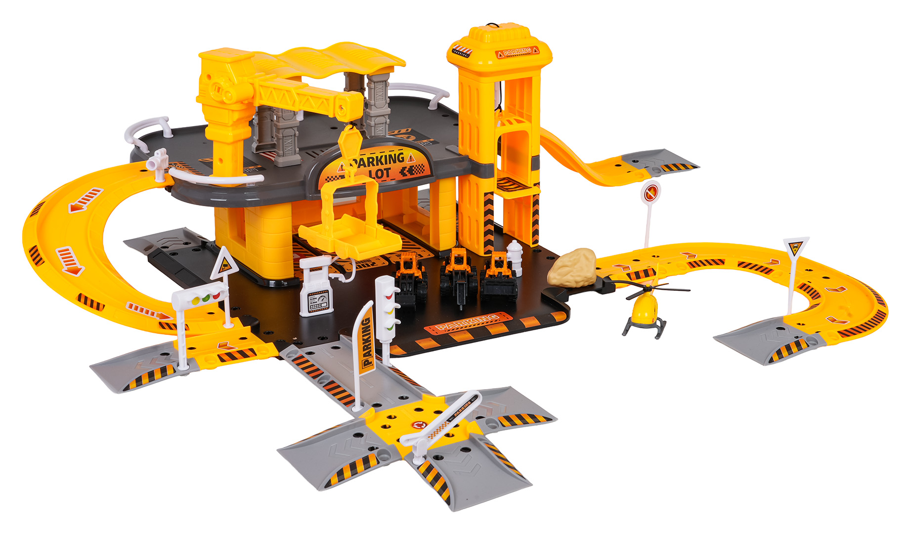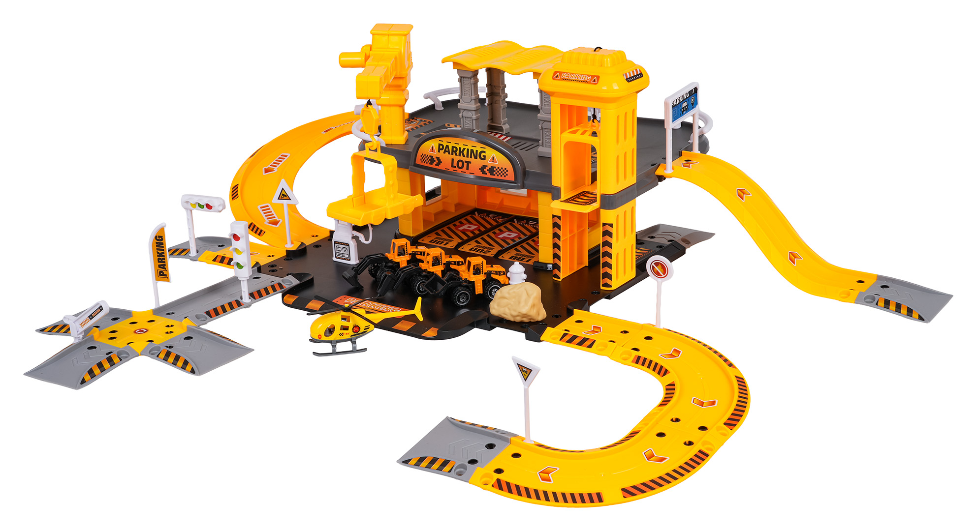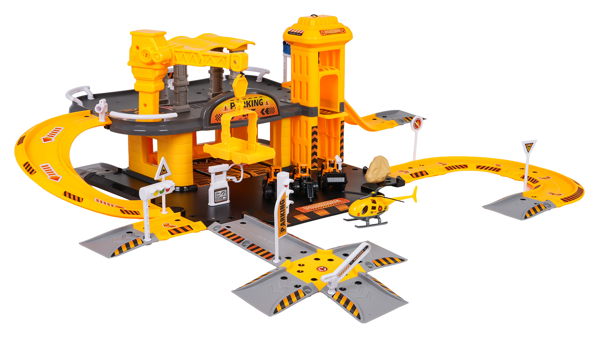 | Zestaw parking z placem budowy i autkami budowlanymi dla dzieci od trzeciego roku życia. Wszystkie elementy zestawu wykonane zostały z najlepszej jakości materiałów bezpiecznych dla dzieci. Parking będzie gratką dla miłośników robót budowlanych. Konstrukcja parkingu jest dwupoziomowa. Na parterze znajduje się stacja benzynowa, droga oraz winda wioząca pojazd na pierwsze piętro (manualnie), gdzie umiejscowiono plac budowy z ruchomym dźwigiem. Z góry pojazdy mogą zjechać windą lub zjeżdżalnią. W zestawie mamy 3 metalowe pojazdy budowlane i helikopter. Zestaw po złożeniu nie zajmuje dużo miejsca, a daje wiele możliwości zabawy.