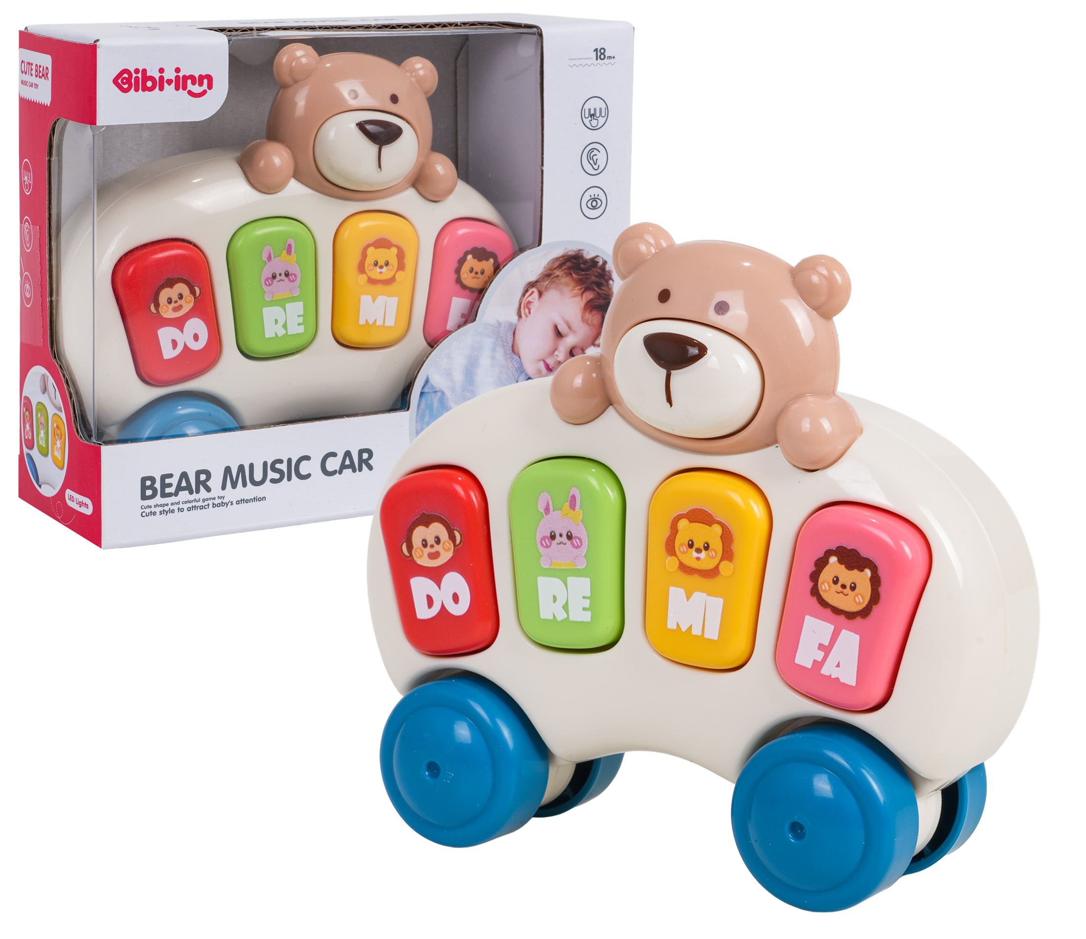 Pianinko z misiem i kółeczkami dla dzieci od osiemnastego miesiąca życia. Pianinko wykonano z najlepszej jakości materiałów w żywych kolorach, nie posiada ostrych zakończeń. Pianinko przypomina samochodzik z misiem i posiada cztery klawisze dźwiękowe z rysunkami zwierzątek i podświetleniem. Naciśnięcie na klawisz spowoduje uruchomienie trybu pianina (odgłosy nut, podświetlenie klawisza). Podwójne naciśnięcie na ten sam klawisz spowoduje uruchomienie odgłosów zwierzątka. Naciśnięcie na misia u góry uruchamia wesołe melodie. Zabawka zasilana jest bateriami typu 2 x AAA 1,5V. Funkcje: - dla dzieci od osiemnastego miesiąca życia, - zabawka wykonana z najlepszej jakości materiałów, - nie posiada ostrych krawędzi i jest w pełni bezpieczna dla maluszka, - wesoły misiu na górze zabawki, - klawisze z odgłosami nut, zwierzątek i podświetleniem, - przycisk z misiem z wesołymi melodiami (20 melodii). |