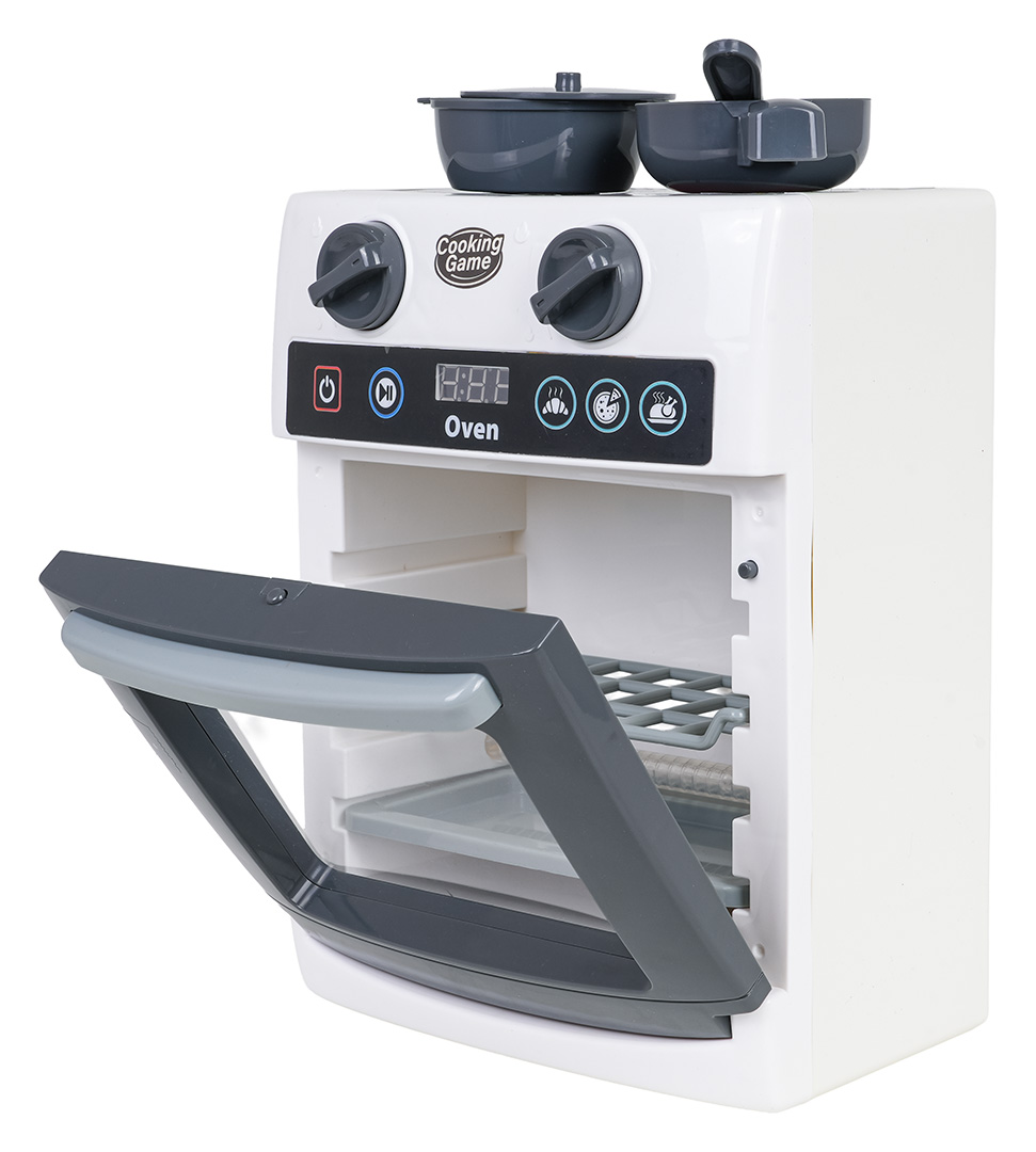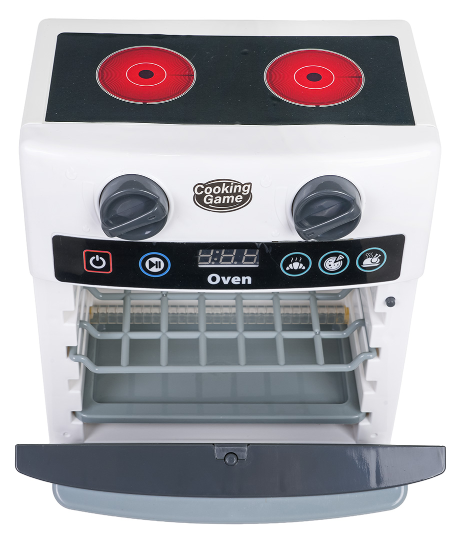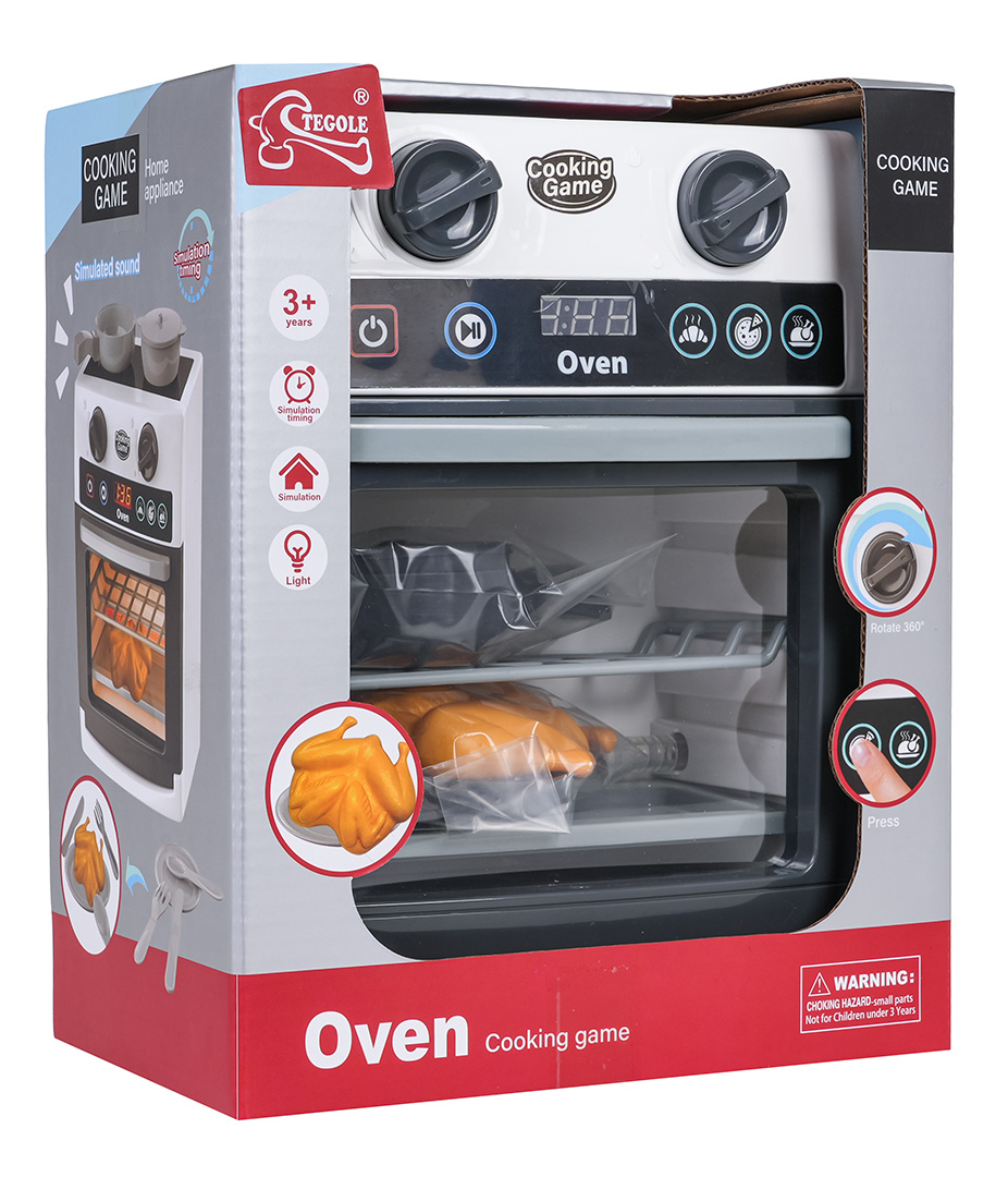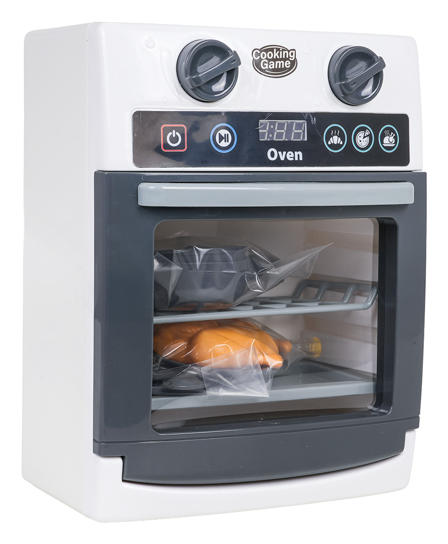 | Interaktywny piekarnik z funkcją dźwięku i światła dla dzieci od trzeciego roku życia. Piekarnik wykonano z dbałością o szczegóły, przypomina i zachowuje się tak jak prawdziwy piekarnik. Piekarnik posiada otwierane drzwi, ruchome pokrętła oraz panel odpowiedzialny za efekty dźwiękowe i świetlne. W zestawie znajdują się akcesoria takie jak atrapa kurczaka, patelnia, garnek z pokrywką, talerzyk oraz sztućce. Zabawka zasilana jest bateriami typu 3 x AA 1,5V (brak w zestawie).