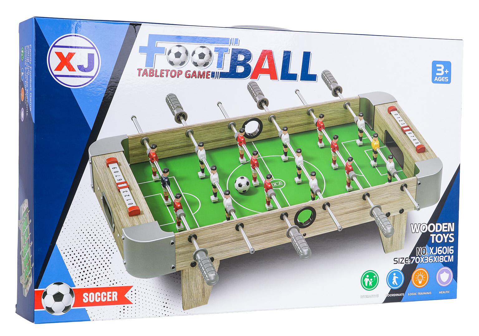 Wymiary | - stół do piłkarzyków ok. 70 cm x 36 cm x 18 cm, - średnica piłki ok.3 cm, - zawodnicy piłkarscy ok. 7,5 cm x 2,5 cm, - opakowanie ok. 60 cm x 8 cm x 37 cm. |