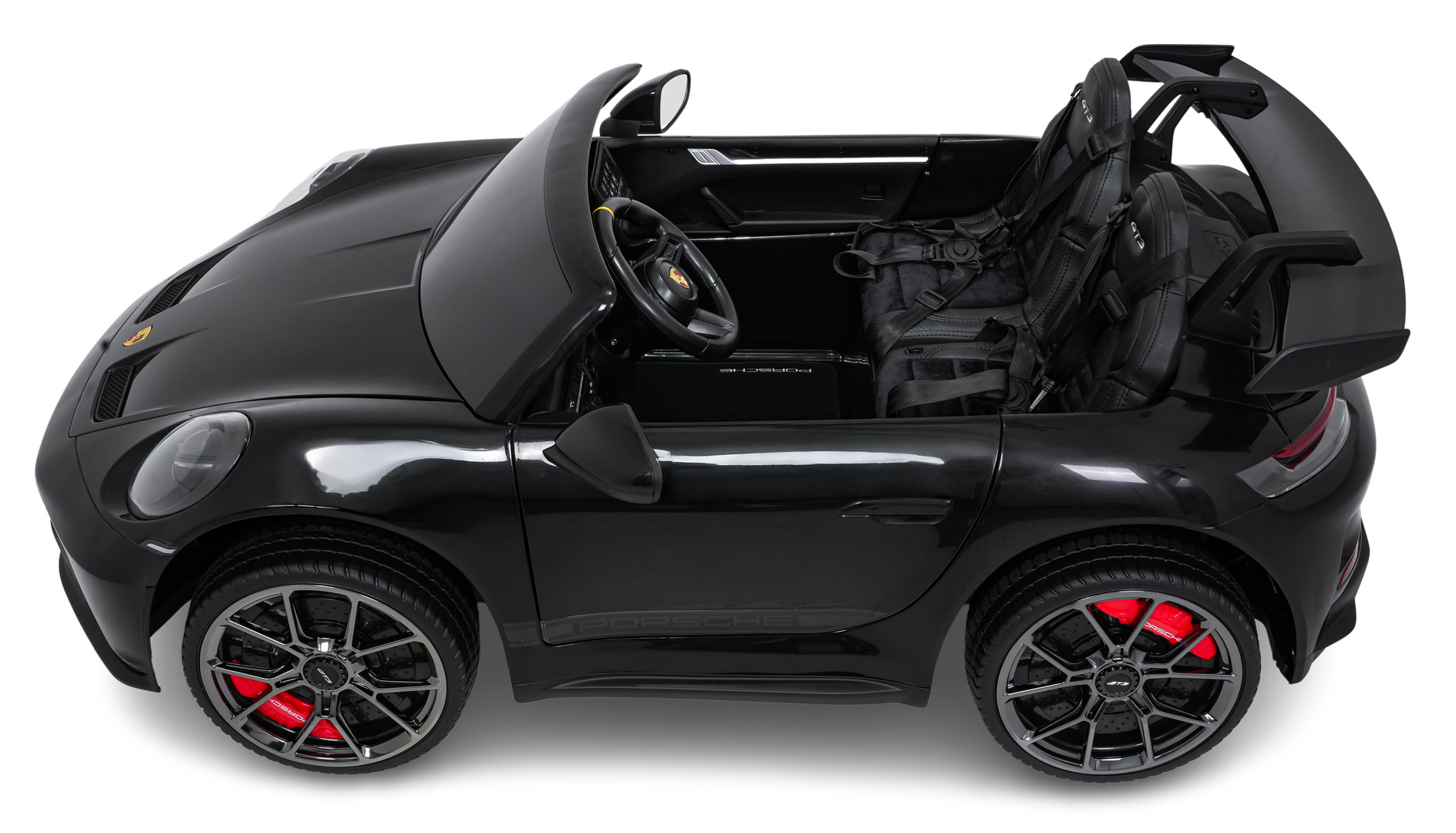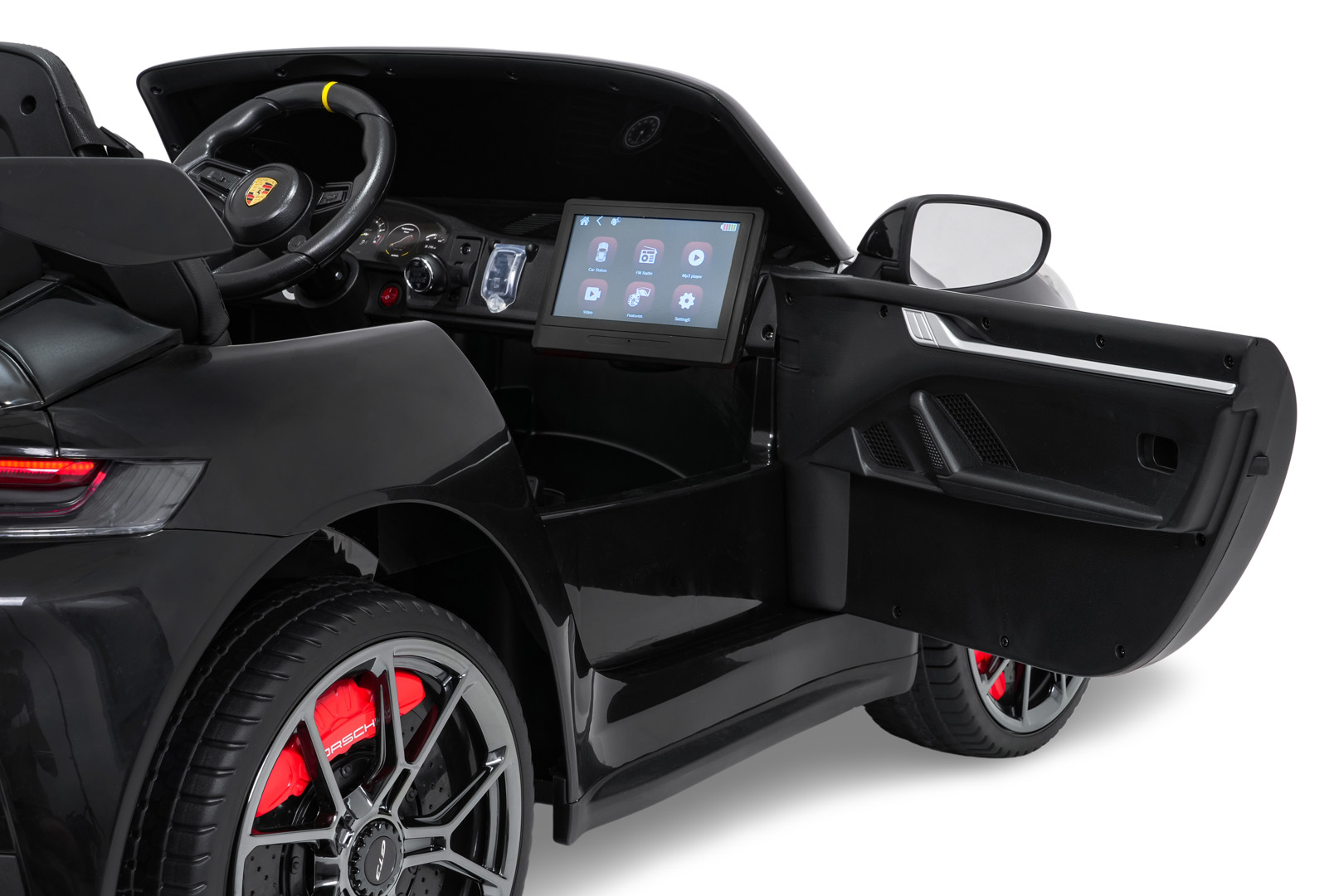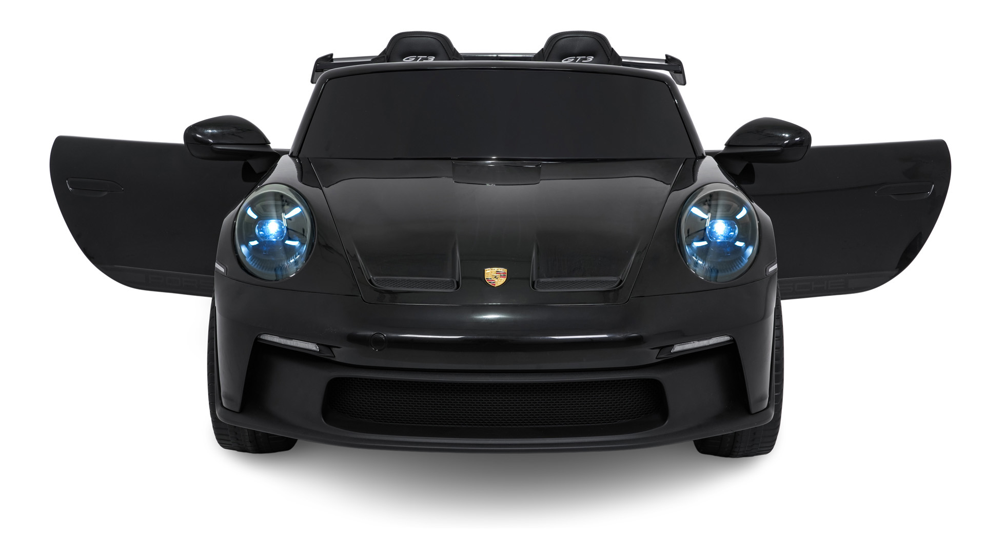 Porsche 911 GT3 STRONG wyposażono w światła LED z przodu i z tyłu oraz osobny włącznik świateł. Dodatkowe elementy, takie jak welurowe dywaniki z logo czy eleganckie wykończenie wnętrza, sprawiają, że pojazd prezentuje się wyjątkowo efektownie.
