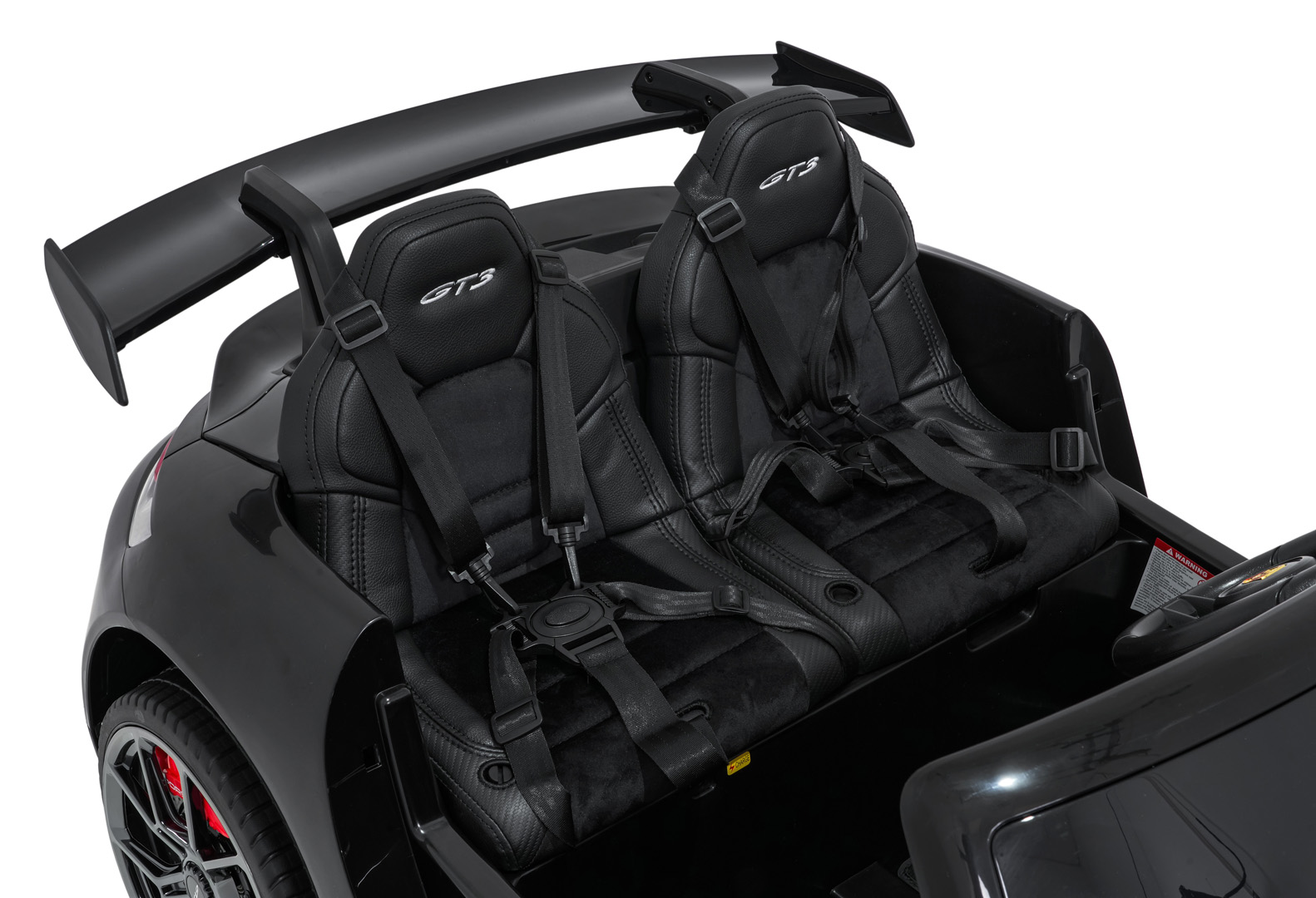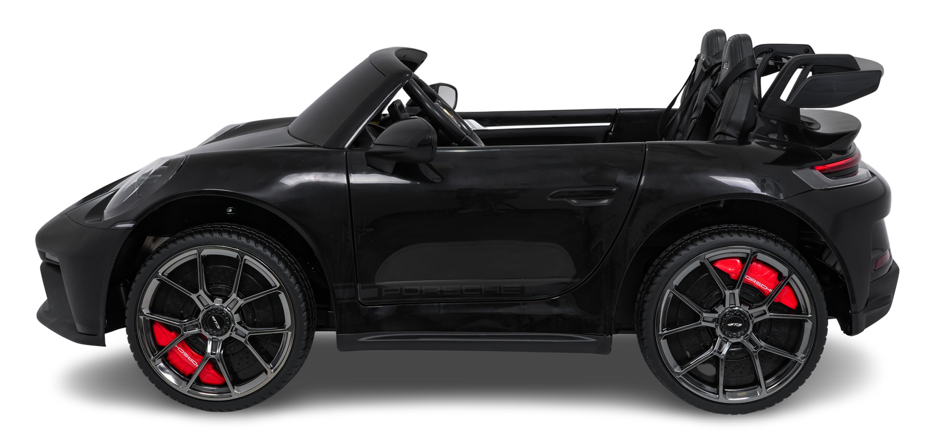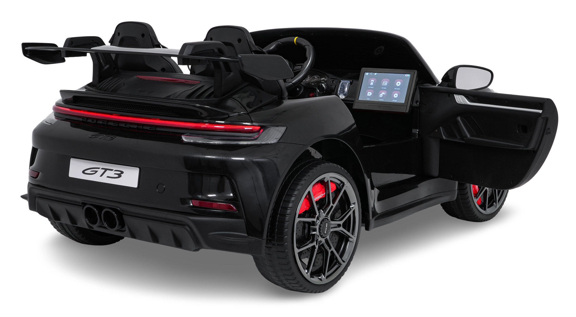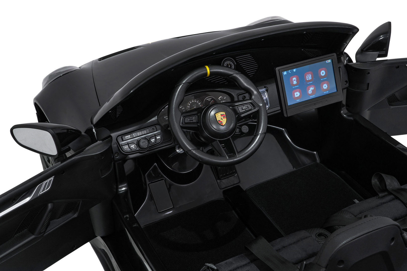 Porsche 911 GT3 STRONG wyposażono w światła LED z przodu i z tyłu oraz osobny włącznik świateł. Dodatkowe elementy, takie jak welurowe dywaniki z logo czy eleganckie wykończenie wnętrza, sprawiają, że pojazd prezentuje się wyjątkowo efektownie.