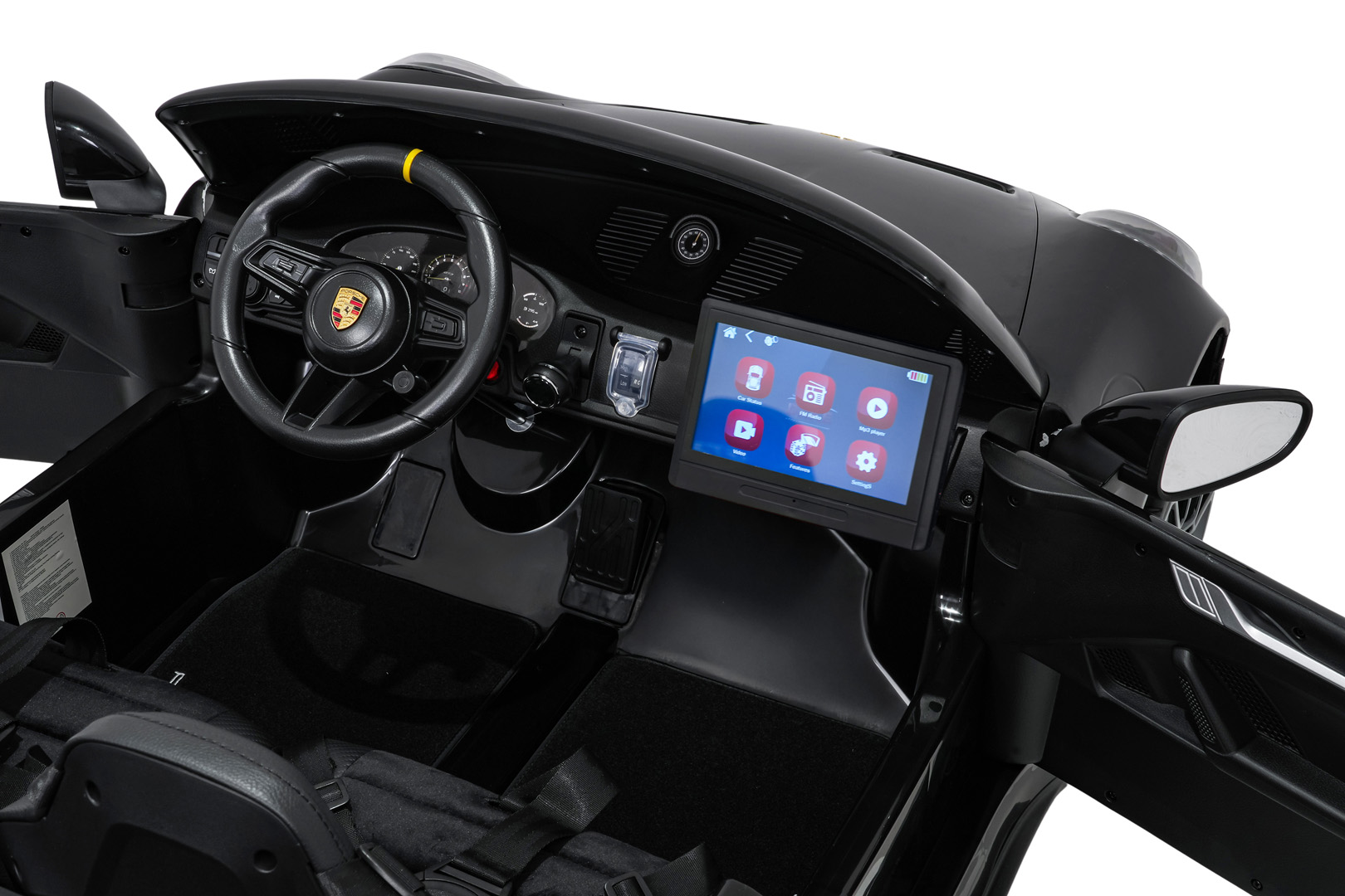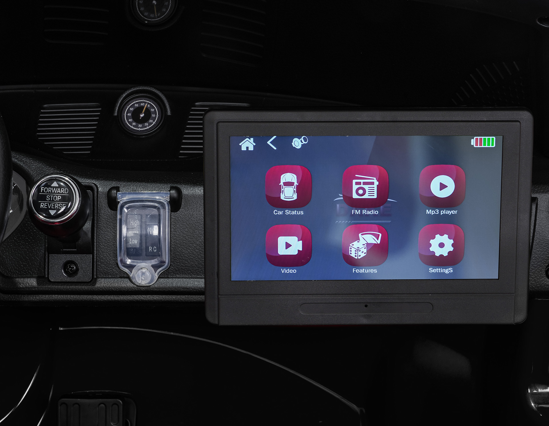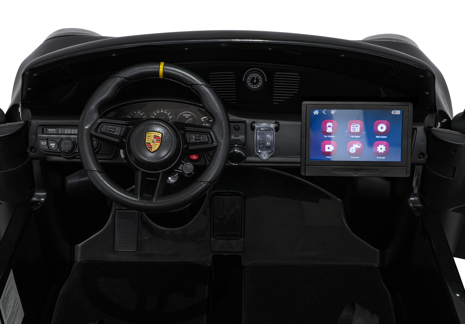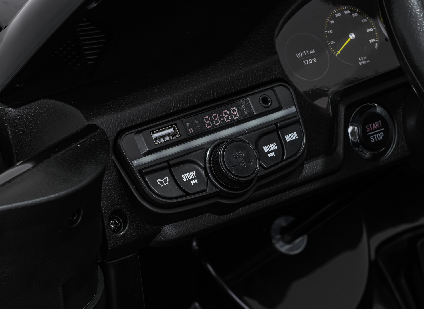 Na uwagę zasługuje nowoczesny panel audio nowego typu. Oferuje on radio FM, MP3, wejście AUX, Bluetooth, wejście USB, wgrane melodyjki oraz przyciski dźwięków i klaksonu w kierownicy. Dodatkowo pojazd posiada wyciągany tablet MP4 oraz tryb SPORT, który uruchamia realistyczne odgłosy pojazdu po naciśnięciu pedału gazu.