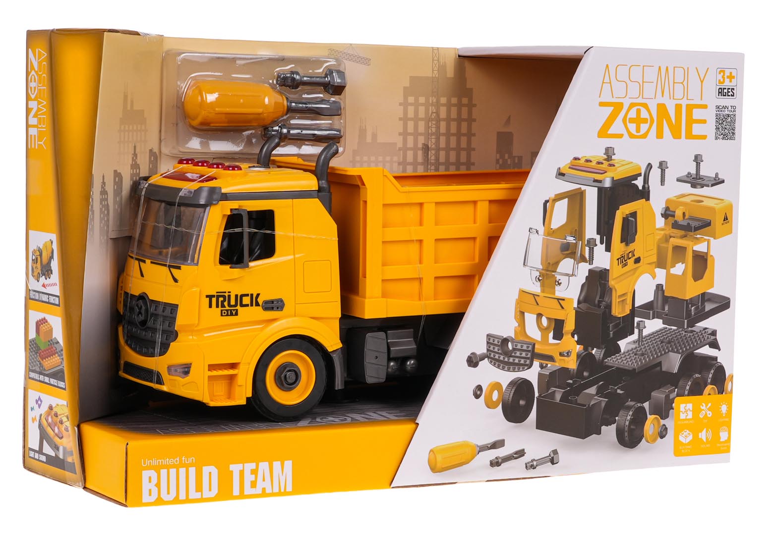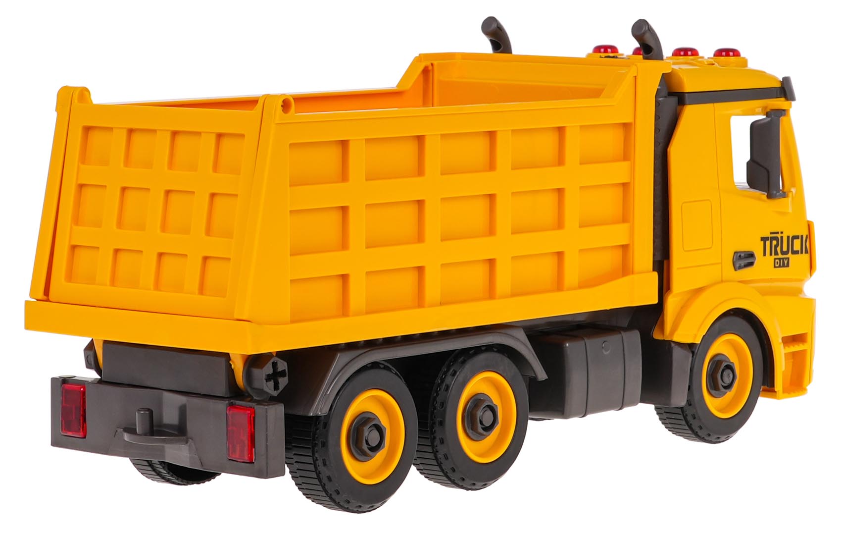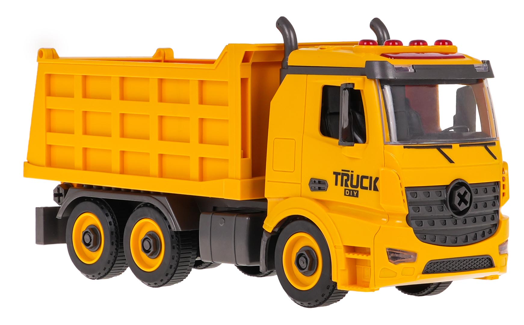 | Interaktywna wywrotka do rozkręcania dla dzieci od 3-go roku życia. W zestawie znajduje się śrubokręt z wymiennymi końcówkami do rozkręcenia pojazdu. Wywrotka posiada napęd na przednie koła. Na jej dachu znajdują się dwa mrugające światełka oraz przyciski funkcyjne. Przyciski uruchamiają odgłosy zapalania pojazdu, cofania, klaksonu oraz alarmu. Przyczepę możemy podnosić i opuszczać oraz otwierać jej tylną klapę, lub całkiem odłączyć ją od zestawu, a zamiast niej na podstawce z klocków układać klocki. Zabawka zasilana jest bateriami typu 3 x AG13 (w zestawie).