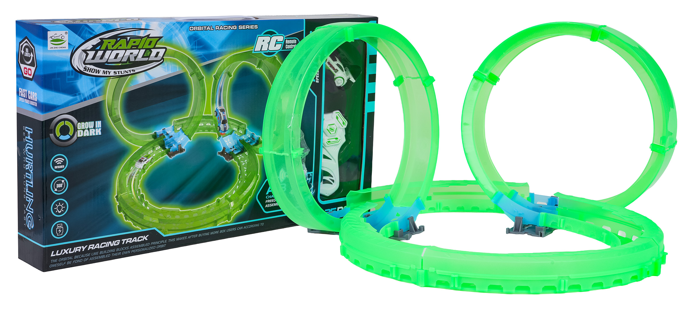 | Duży tor wyścigowy świecący w ciemności to propozycja dla dzieci od szóstego roku życia. Zestaw składa się z pilota, samochodziku i części konstrukcyjnych toru. Pilot zasilany jest bateriami typu 2 x AAA (brak w zestawie), samochód akumulatorem typu 3,7V i ładowany kablem USB (zawarte w zestawie). Tor jest fluorescencyjny, świeci w ciemności. Samochodzik posiada podświetlenie LED, jeżdżąc, tworzy niesamowite efekty. Zabawa torem pozytywnie wpływa na koordynację wzrokowo-ruchową, budowanie toru pobudza wyobraźnię dziecka oraz rozwija zdolności manualne.
