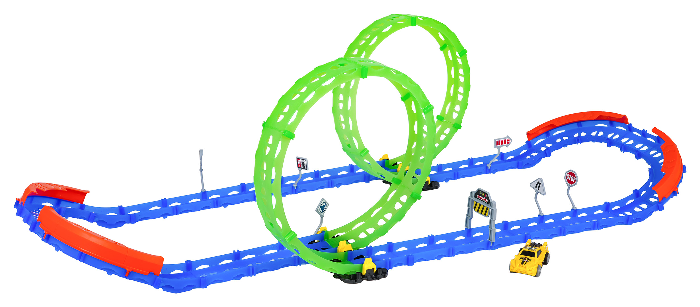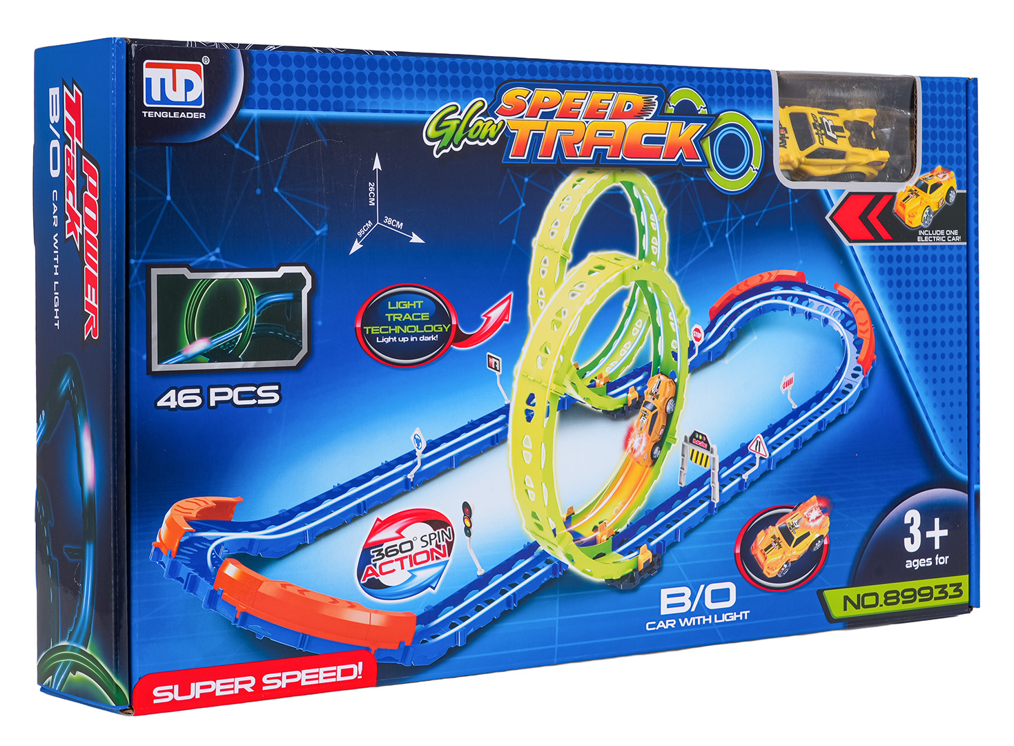| Fluorescencyjny tor wyścigowy z ostrymi zakrętami, pętlami i szybkim autkiem to propozycja dla dzieci od trzeciego roku życia. Zestaw składa się z 46 elementów do samodzielnego montażu. Na torze znajdują się odcinki proste, ostre zakręty z barierkami zabezpieczającymi przed wypadaniem pojazdu z trasy, a także dwie pętle 360 stopni. Pętle są fluorescencyjne, świecą w ciemności. Autko również posiada oświetlenie w tylnej części. Autko zasilane jest bateriami typu 2 x AAA 1,5 V, baterii brak w zestawie.