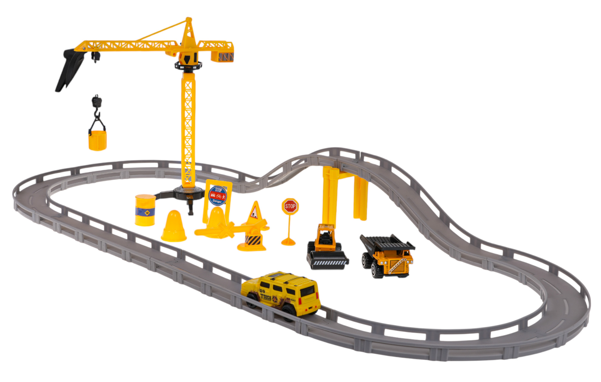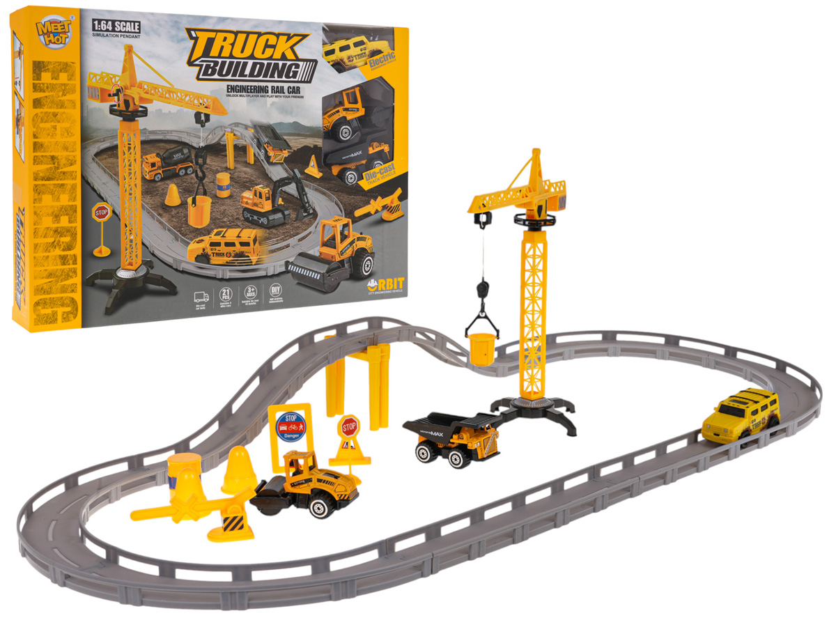 | - tory z barierkami zabezpieczającymi, - dźwig, - 3 autka, - podpórka pod tor, - 2 pachołki, - 3 znaki, - szlaban, - beczka, - naklejki dekoracyjne. |
