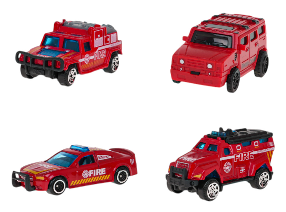 | - elementy konstrukcyjne toru, - 4 autka strażackie, - 6 znaków, - 2 barierki, - 4 pachołki, - 5 podpórek toru, - naklejki dekoracyjne. |