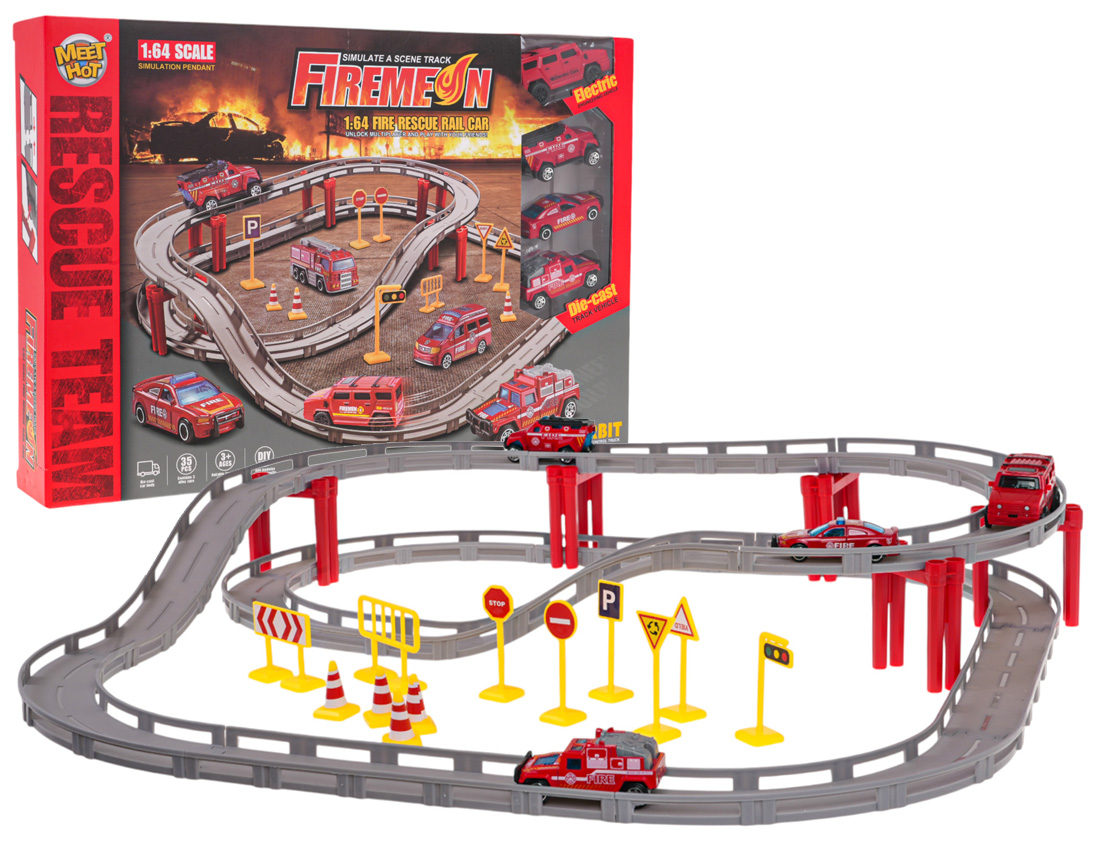 | Tor wyścigowy w wersji Straż Pożarna dla dzieci od 3-go roku życia. Tor wykonano z najlepszej jakości plastiku, a dołączone 3 pojazdy strażackie, posiadają metalową karoserię. Na tor składa się 35 elementów tworzących dwupoziomową konstrukcję z odcinkami prostymi i zakrętami. Do zestawu dołączone są 4 wozy strażackie. Jeden z pojazdów zasilany jest bateriami typu 1 x AA 1,5 V (brak w zestawie). Funkcje zestawu: - odpowiedni dla dzieci od 3-go roku życia, - wykonany z najlepszej jakości plastiku, - 3 autka posiadają metalową karoserię, - 1 pojazd elektryczny, - pojazdy wykonane w skali 1:64, - konstrukcja składa się z dwóch poziomów z odcinków prostych i zakrętów. |