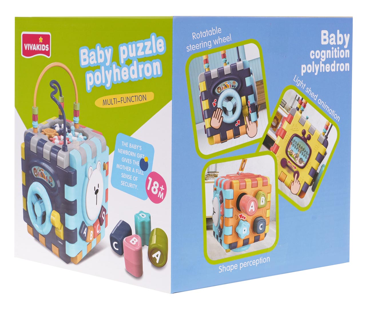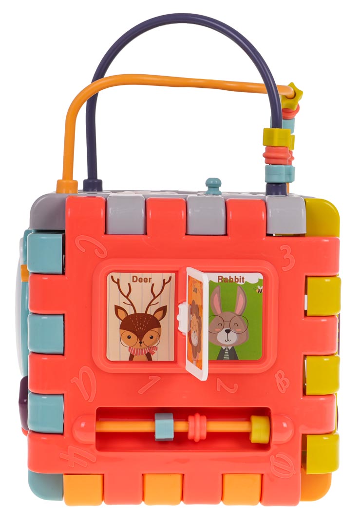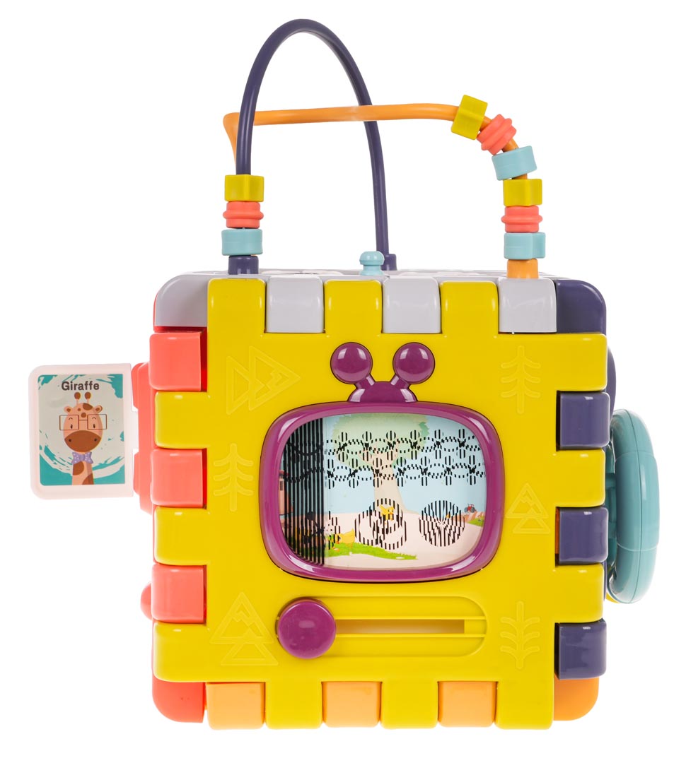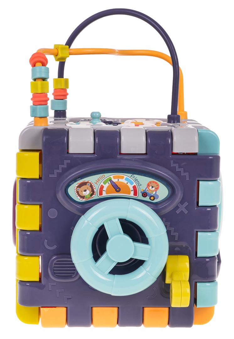 | Wielofunkcyjna interaktywna kostka z efektami dźwiękowymi i świetlnymi dla dzieci od 18-go miesiąca życia. Każda ścianka boxu zapewni dziecku wiele frajdy i interaktywnej zabawy. Efekty dźwiękowe i świetlne oraz bogactwo kolorów, przyciągnie wzrok maluszka i zachęci do zabawy. Kostkę możemy rozkładać i bawić się poszczególnymi elementami na płasko. Zabawka zasilana jest bateriami typu 3 x AAA 1,5 V (brak w zestawie). Opis ścianek boksu: - ścianka z ruchomą kierownicą i ruchomą skrzynią biegów. Maluszek może poruszać kierownicą i atrapą drążka zmiany biegów. - interaktywna ścianka z misiem i przyciskami Naciskając na misia, miś się podświetla i słyszymy dźwięki. Pod głową misia mamy również cztery przyciski z literkami A, B, C, D, które po naciśnięciu grają różne melodie lub uczą literek (w języku angielskim). - ścianka z sorterem kształtów 4 kształty i 4 klocuszki w zestawie. - ścianka z przekładaną książeczką i pałąkiem z ruchomymi elementami - ścianka z telewizorem i suwakiem - górna ścianka z kołami zębatymi i przekładankami Funkcje zestawu: - przeznaczona dla dzieci od 18-go miesiąca życia, - wykonana z najlepszej jakości plastiku w żywych kolorach, - boks złożony z 6 ścian, puzzli, - możliwość spinania w dowolnym układzie puzzli, - ścianka interaktywna z efektem światła (podświetlana głowa misia) i dźwięku (klawisze z numerkami i miś), - ruchome elementy: kierownica, dźwignia zmiany biegów, suwak, koła zębate, przekładane strony książki, - sorter kształtów z klockami, - klocki z grzechotką w środku. |