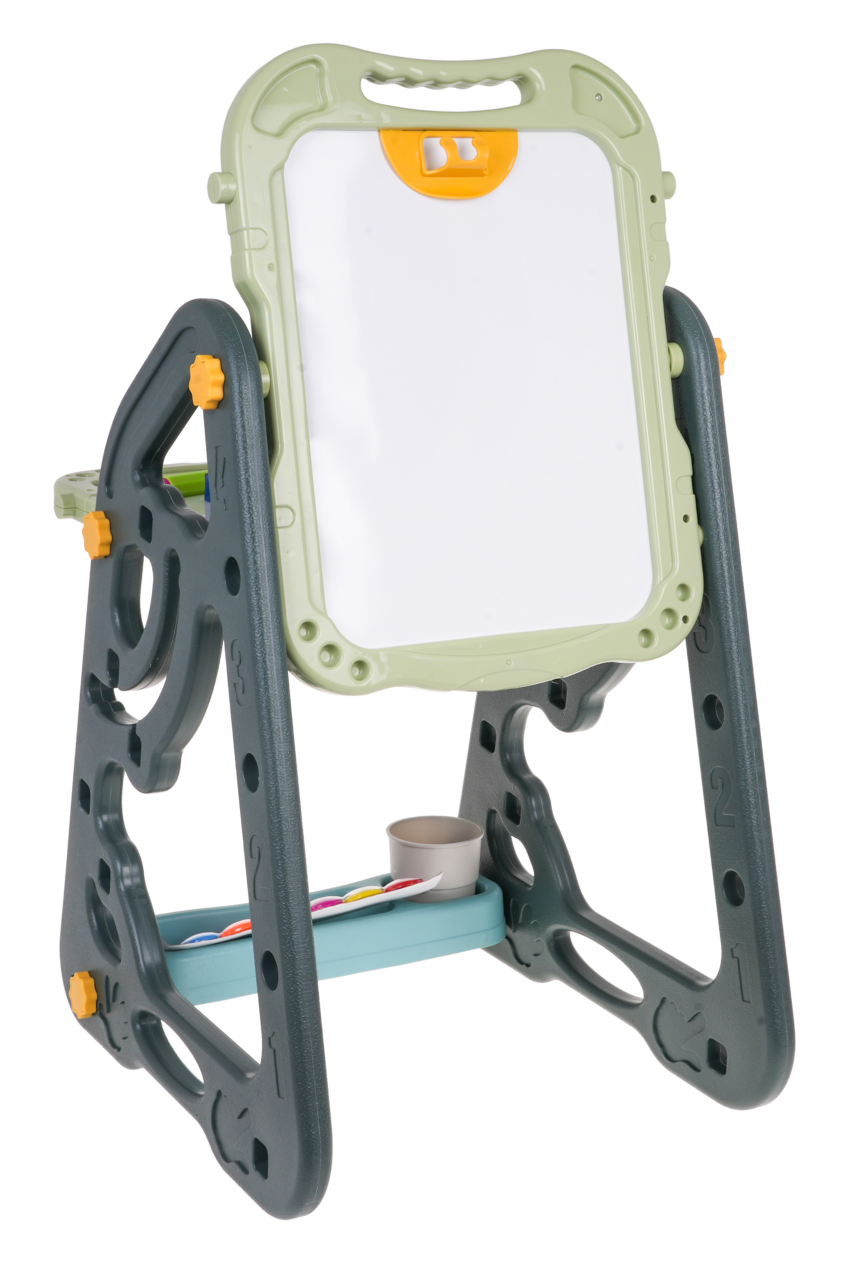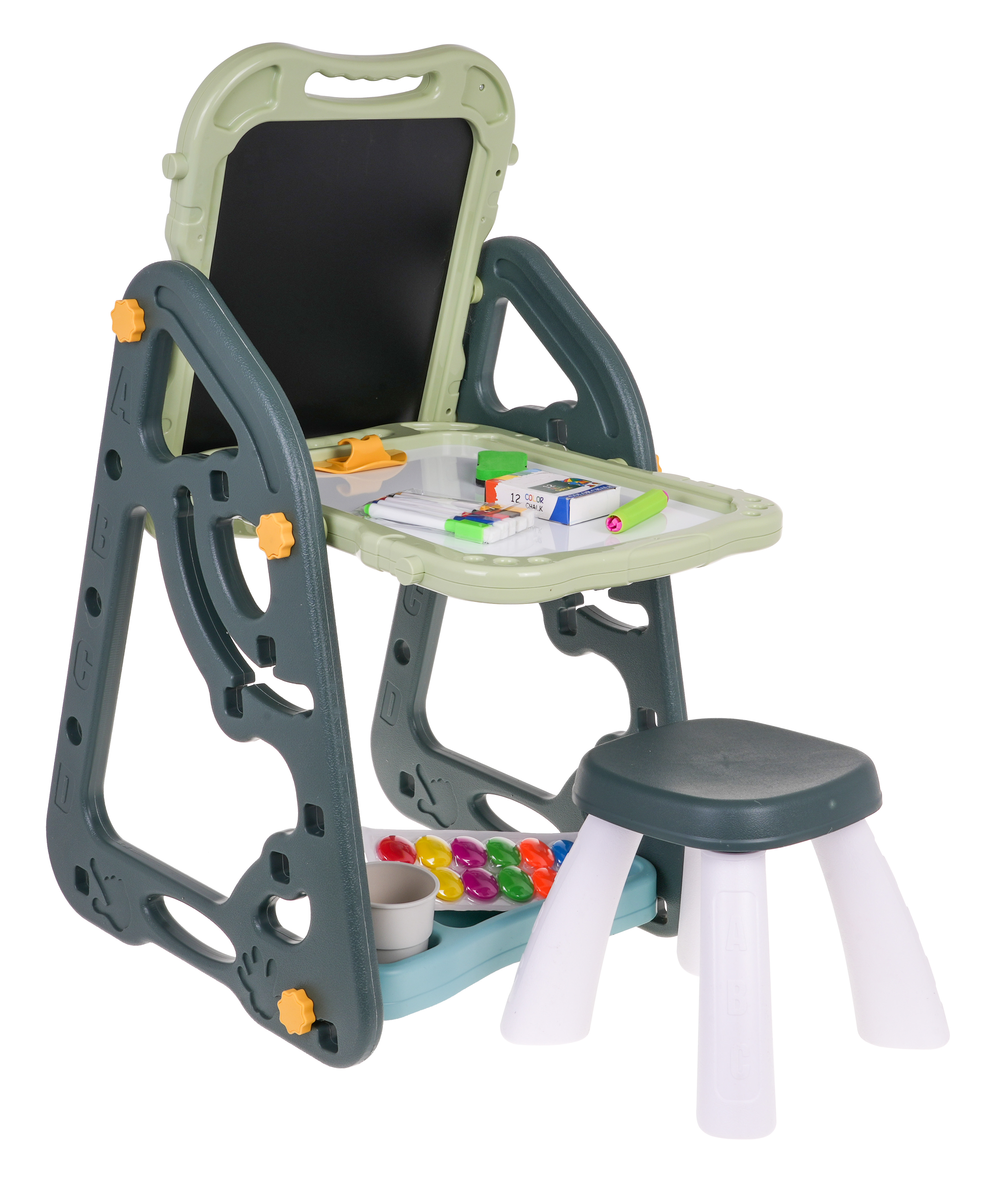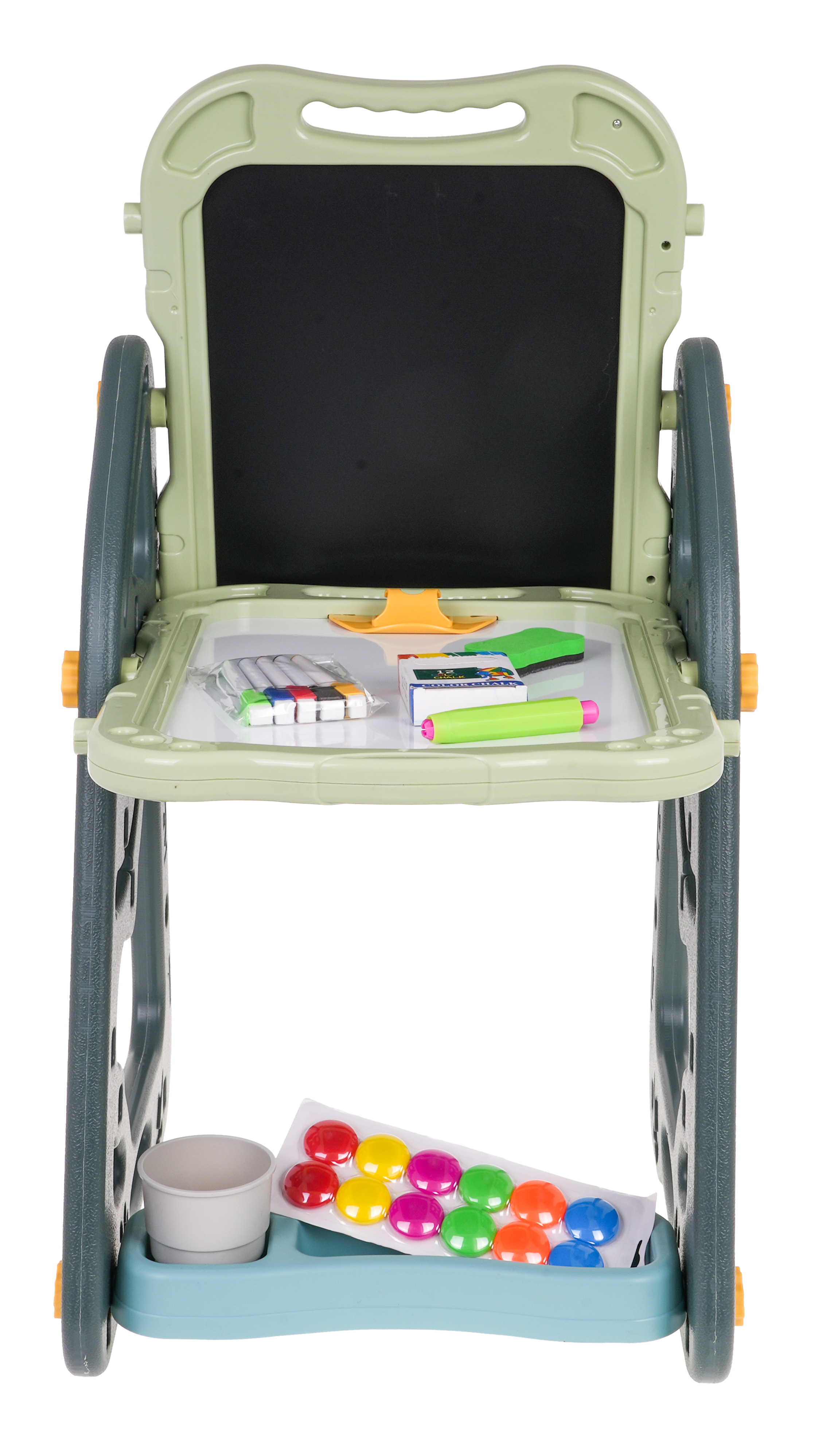 Duży wielofunkcyjny zestaw składający się z dwóch tablic: kredowo – magnetycznej i magnetycznej oraz krzesełka to propozycja dla dzieci od 3-go roku życia. Stelaż do tablicy możemy ustawić w dwóch wariantach. W pierwszym wariancie będziemy mieć z jednej strony tablicę magnetyczną a z drugiej kredową. Możemy również regulować wysokość tablic. W drugim wariancie będziemy mieć stoliczek, na którego blacie i ściance przyległej będziemy mieć dwie tablice. Na stronie białej można pisać pisakami lub przyczepiać kolorowe magnesy. Na stronie czarnej można malować kredą oraz również przyczepiać kolorowe magnesy. Do zestawu załączono dwie półeczkę na akcesoria do malowania oraz akcesoria takie jak kubek na wodę, kredę pisaki, magnesy itp. Zestaw jest bezpieczny, wszystkie kanty są zaokrąglone, co zapewnia bezpieczeństwo użytkowania. Łatwo się go montuje i demontuje. Dzięki tablicy dziecko bawiąc się, może pobudzić jednocześnie wyobraźnię, koncentrację i zdolności manualne | |