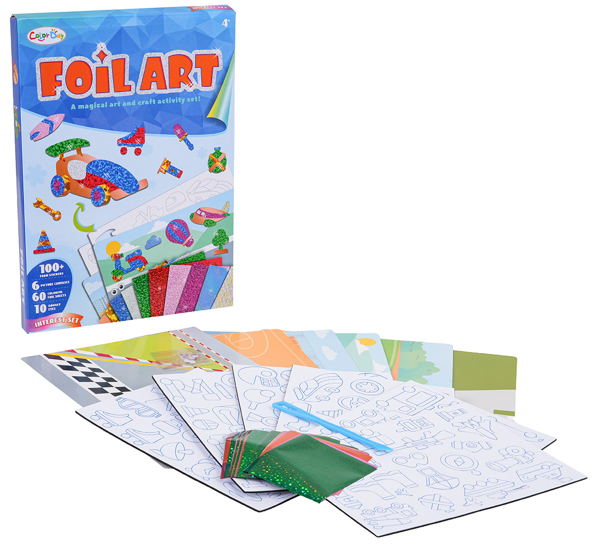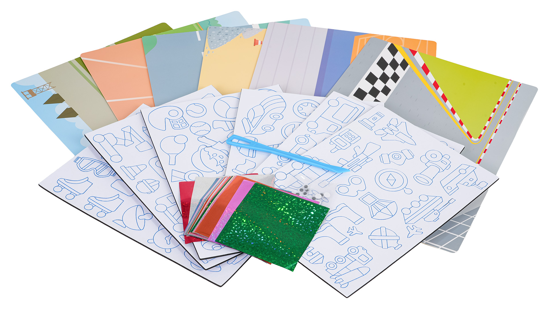 | Bogato wyposażony zestaw do tworzenia kolorowych obrazków dla dzieci od czwartego roku życia. Zestaw składa się z piankowych naklejek, szablonów z tłem, brokatowego papieru i szpatułki do łatwiejszego usuwania papieru z piankowych naklejek. Zadaniem dziecka jest stworzenie kreatywnego obrazka o różnej tematyce.