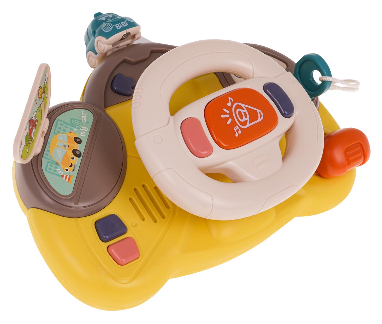 | Interaktywna kierownica dla dzieci od pierwszych dni życia. Zabawka wykonana została z najlepszej jakości plastiku w żywych kolorach przyciągających wzrok dziecka. Jest bezpieczna dla maluszków, nie posiada żadnych ostrych krawędzi. Zabawka posiada paski zapinane na rzepy, które można przymocować do wózka, łóżeczka, siedzenia samochodu czy krzesełka do karmienia. Zabawka zasilana jest bateriami typu 3 x AA 1,5 V (brak w zestawie). Funkcje zabawki: - odpowiednia dla maluszków od pierwszych dni życia, - wykonana z najlepszej jakości materiałów, - żywe kolory przyciągają wzrok dziecka, - posiada efekty dźwiękowe: klakson, melodyjki, alarmy, odgłosy jazdy, odgłosy wydawane przez kierunkowskazy, odgłosy odpalania silnika, - posiada efekty świetlne: klakson, kierunkowskazy, - ruchome elementy: kierownica, skrzynia biegów, autko na górze kierownicy, przekręcany kluczyk, otwierana książeczka, - można ją umocować na łóżeczku, wózku, krzesełku do karmienia |